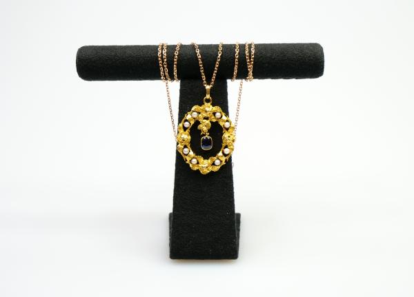 zlatý přívěsek s modrým safírem a říčními perlami, Au btto 5,90g/750/000; západní Evropa, kolem roku 1935; rozměry: 3 x 2,3 cm, atest Puncovního úřadu