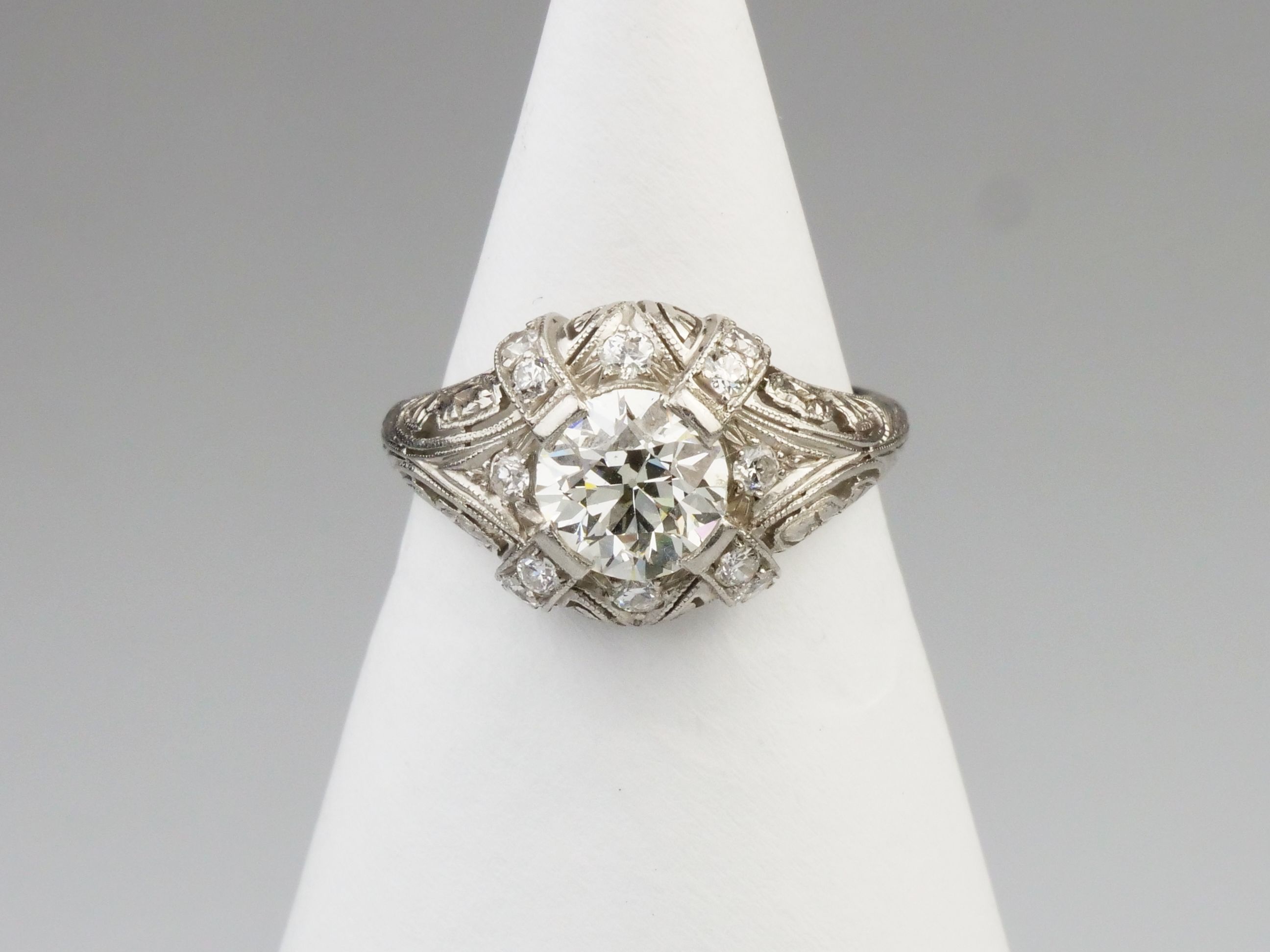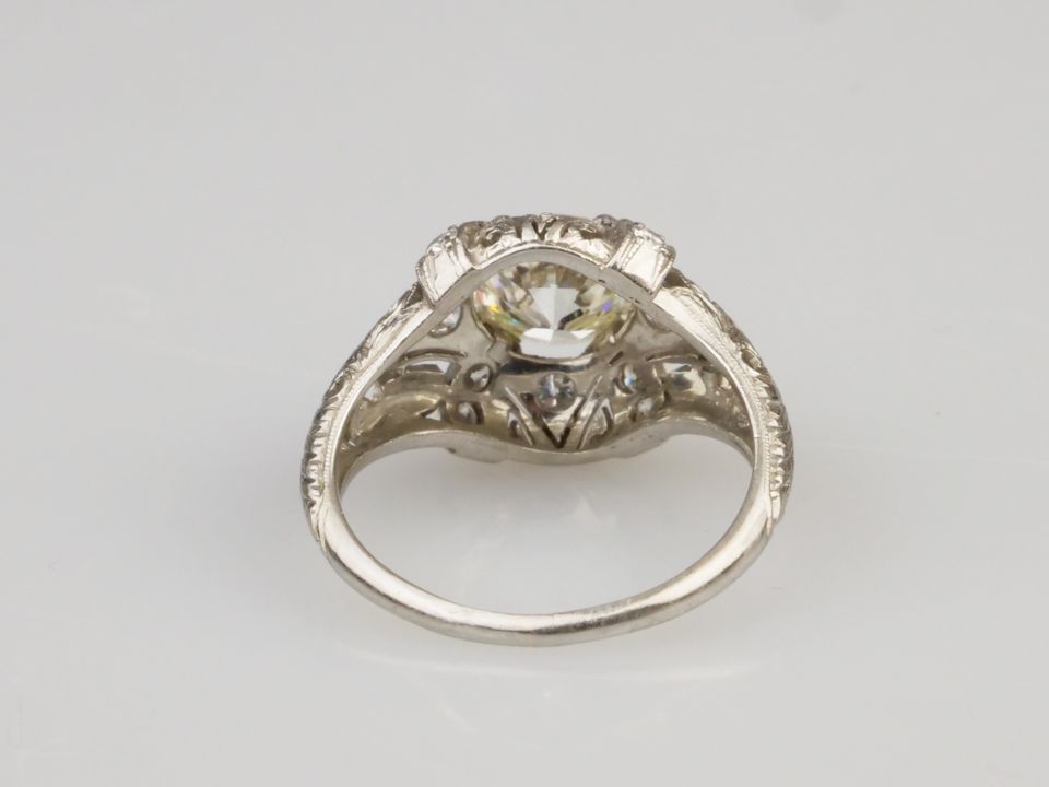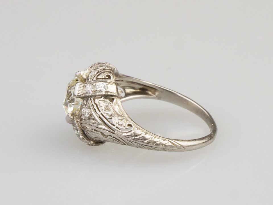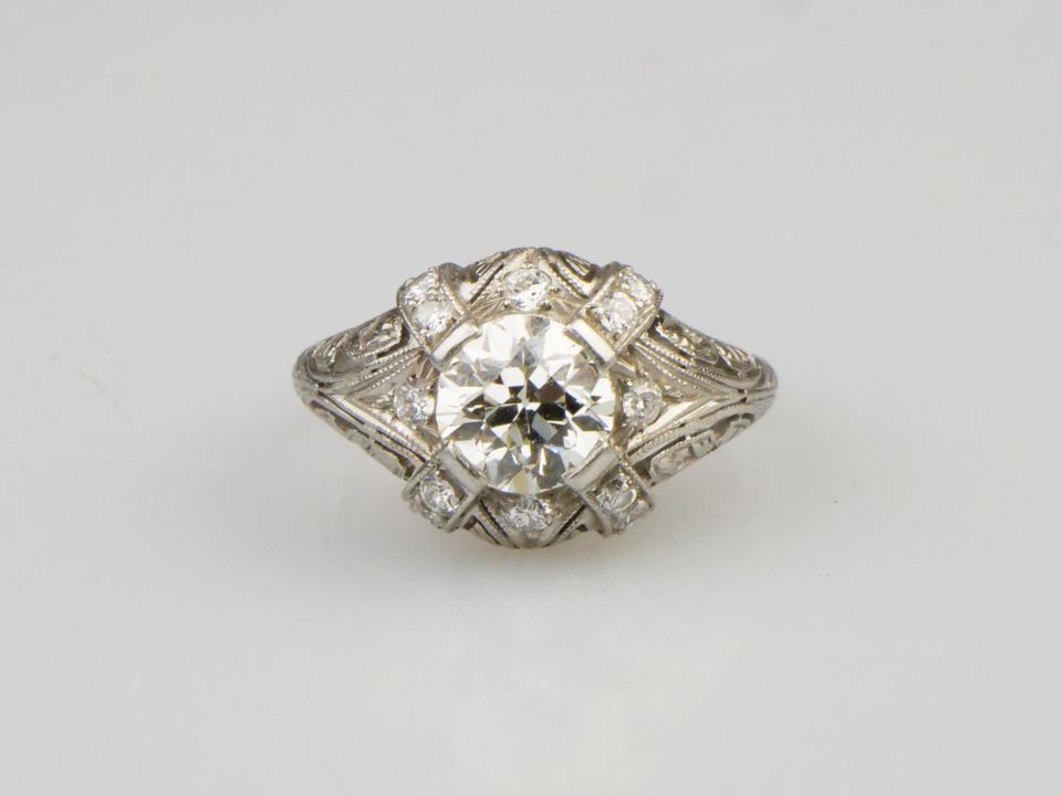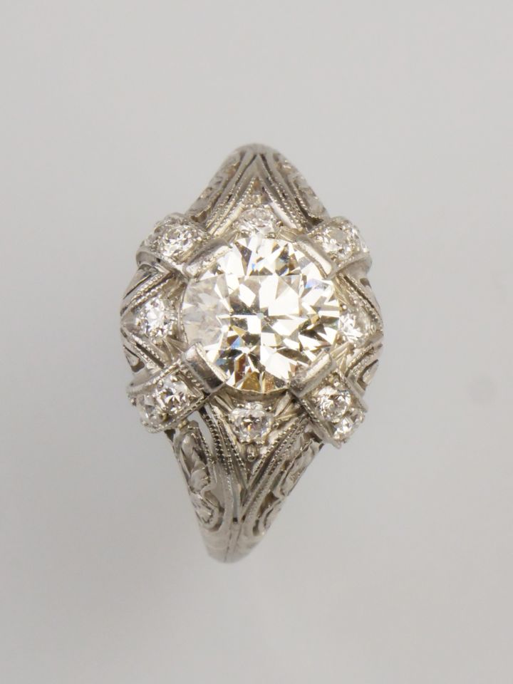 platinový prsten s diamanty briliantového brusu, kvalitní centrální kámen o hmotnosti 1,3, čistota VS1 a barva M-N, drobnější diamanty briliantového brusu (12 ks) o hmotnosti cca 0,34 ct, Pt btto 4,90g/900/000, velikost 52; západní Evropa, kolem roku 1935; atest Puncovního úřadu, znalecký posudek