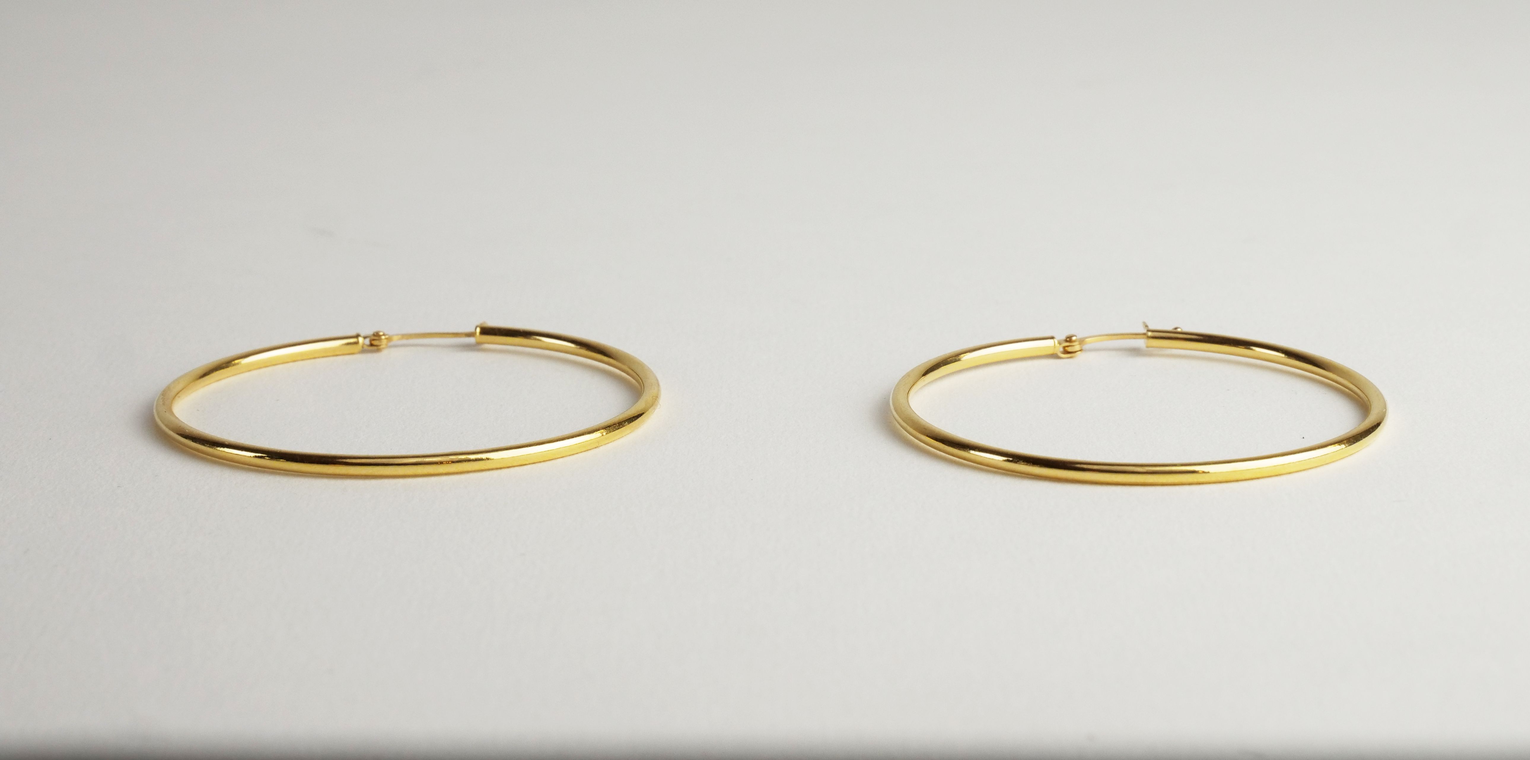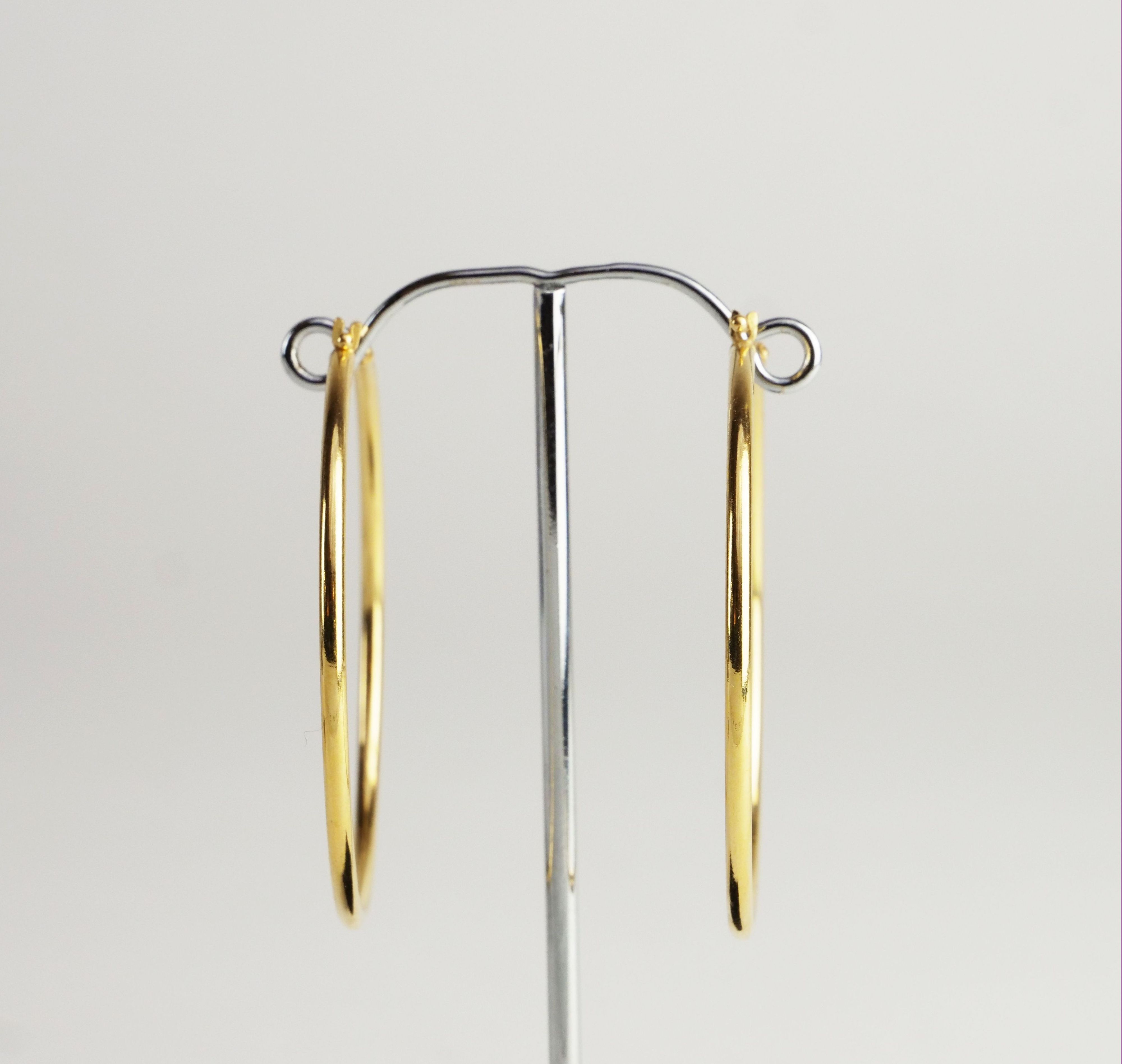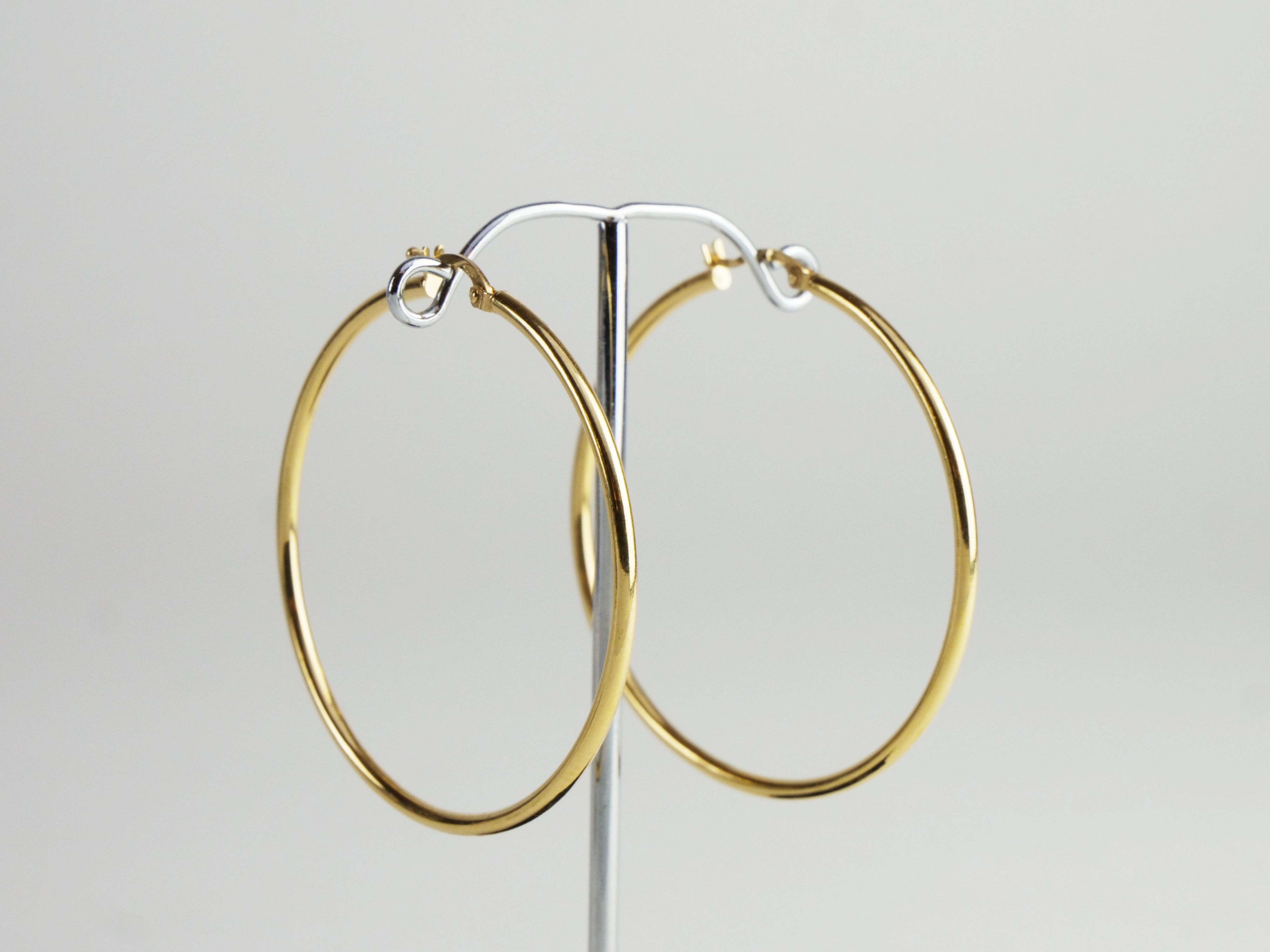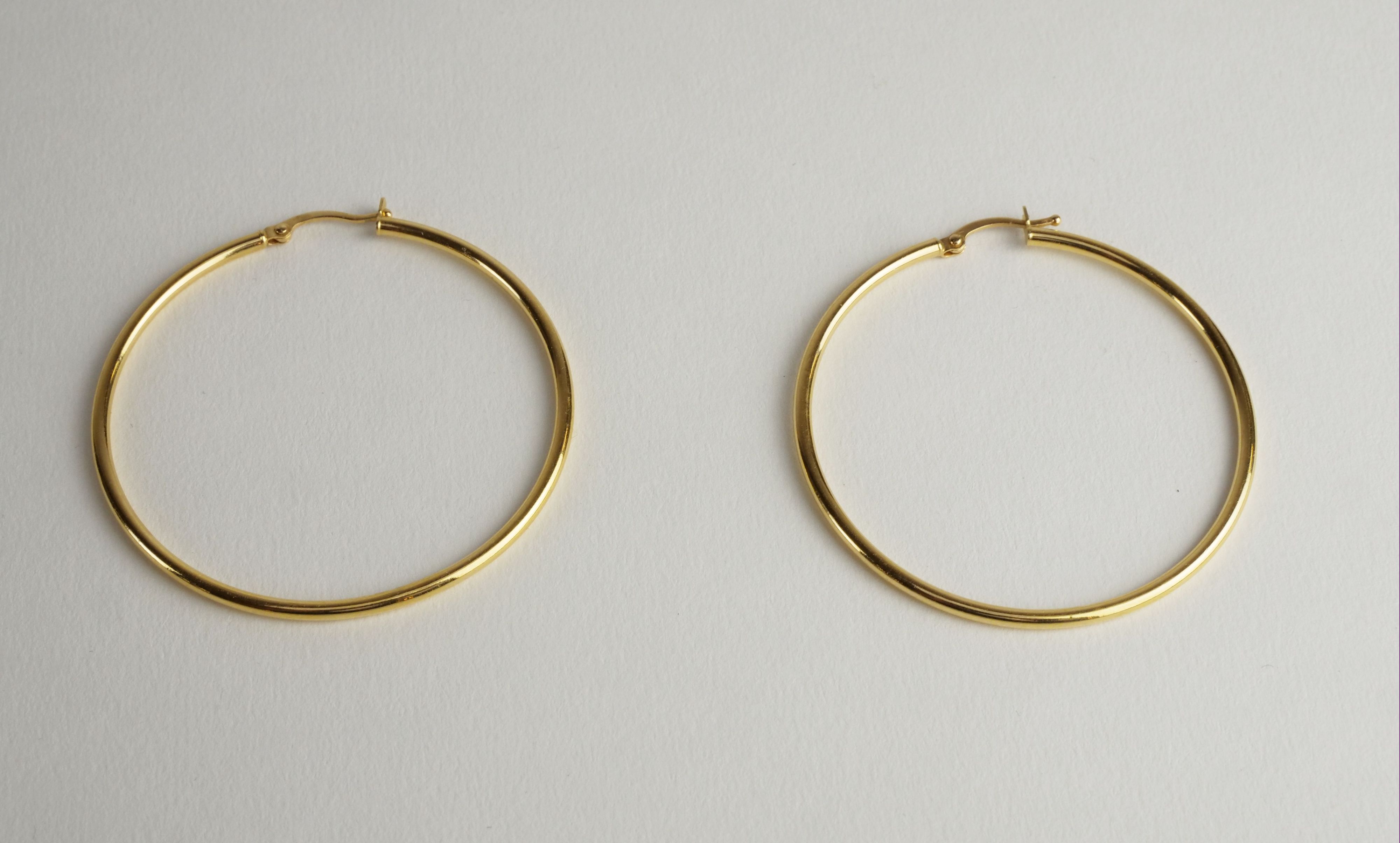 jednoduché zlaté kruhové náušnice, Au 2,20 g/750/1000, západní Evropa, kolem r. 1990, průměr kruhu náušnic je 4,9 cm; pozdější český punc