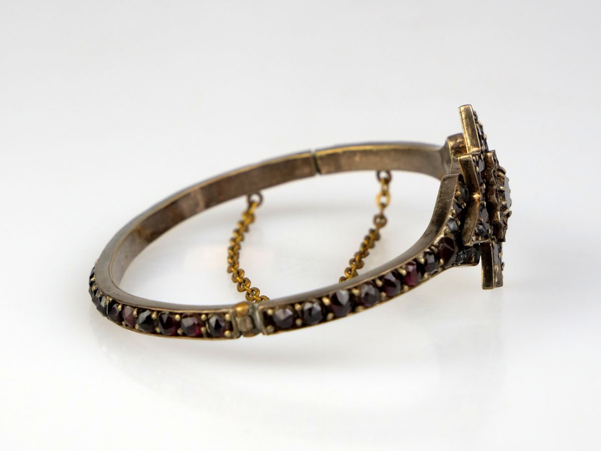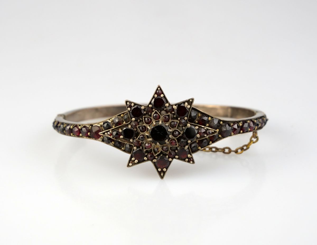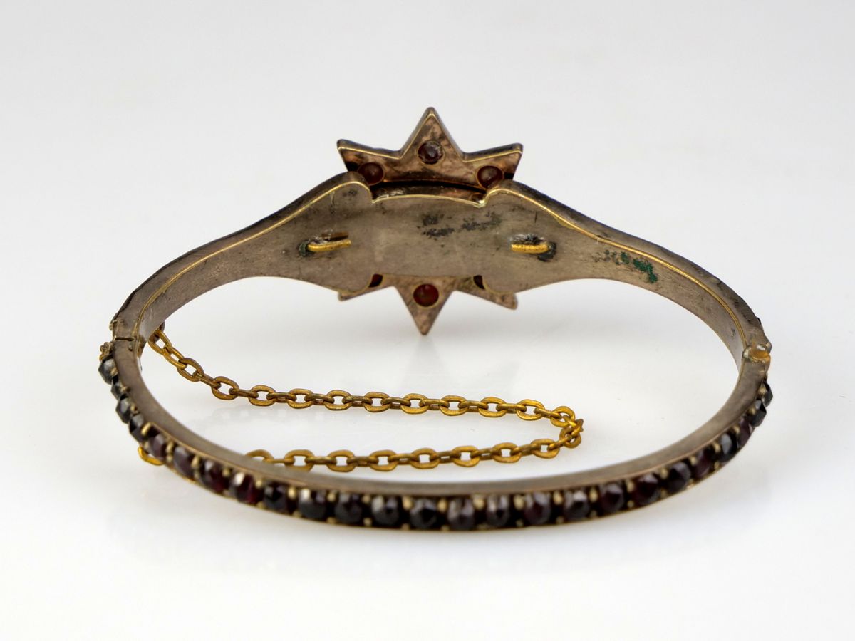 náramek s českými granáty vsazenými v tombaku, hlava ve tvaru osmicípé hvězdy, Čechy, kolem roku 1900; průměr 6 cm