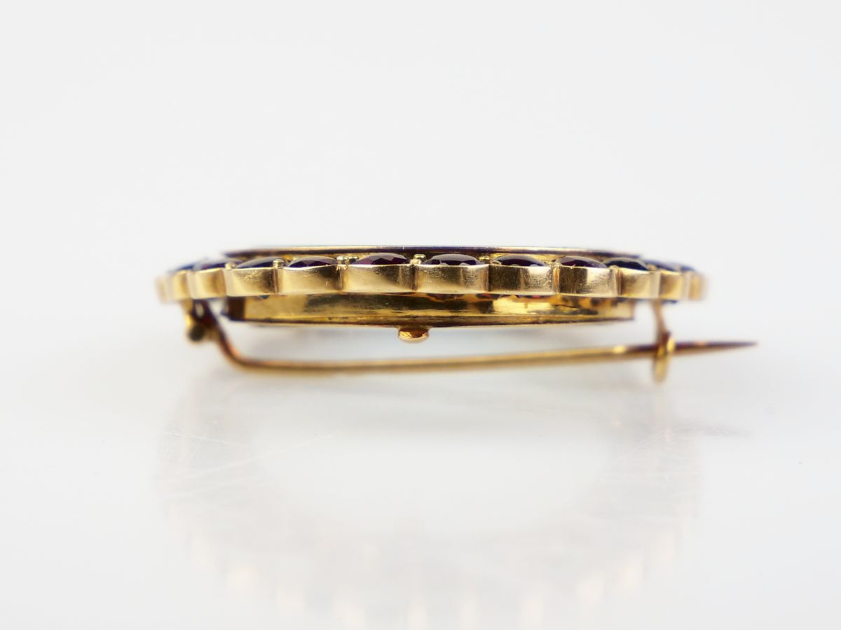 zlatá brož ve tvaru oválného rámečku osazená českými granáty (pyropy), Au btto 12,90g/580/000, Rakousko - Uhersko, kolem r. 1890, značka pražského puncovního úřadu; výška 4,2 cm, šířka 3,5 cm; osvědčení Puncovního úřadu