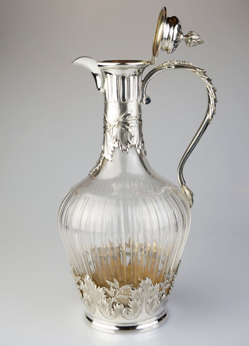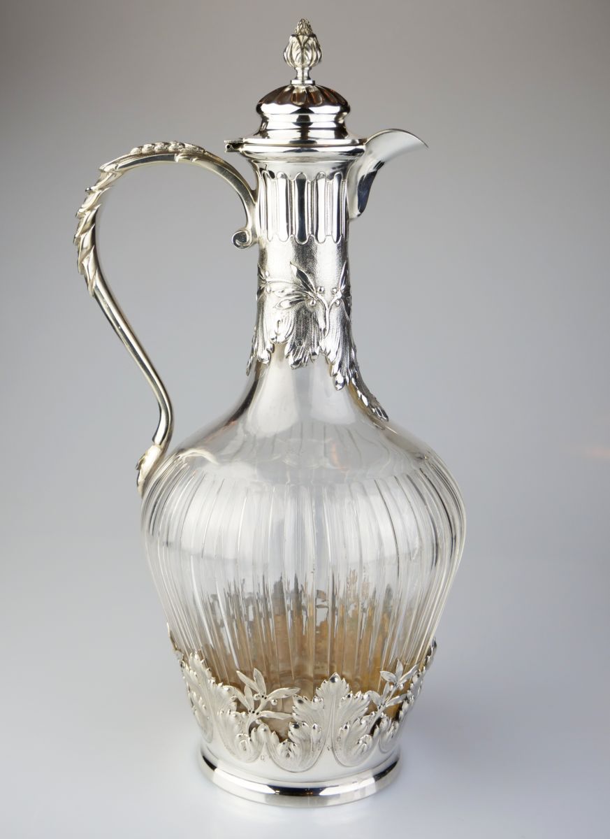 karafa na víno, čiré broušené sklo se stříbrnou montáží, Ag btto 963g/925/1000, stříbro tepané a cizelované, Francie, kolem r. 1890, dobové francouzské puncy, pozdější český punc; výška 26 cm, průměr 11,5 cm