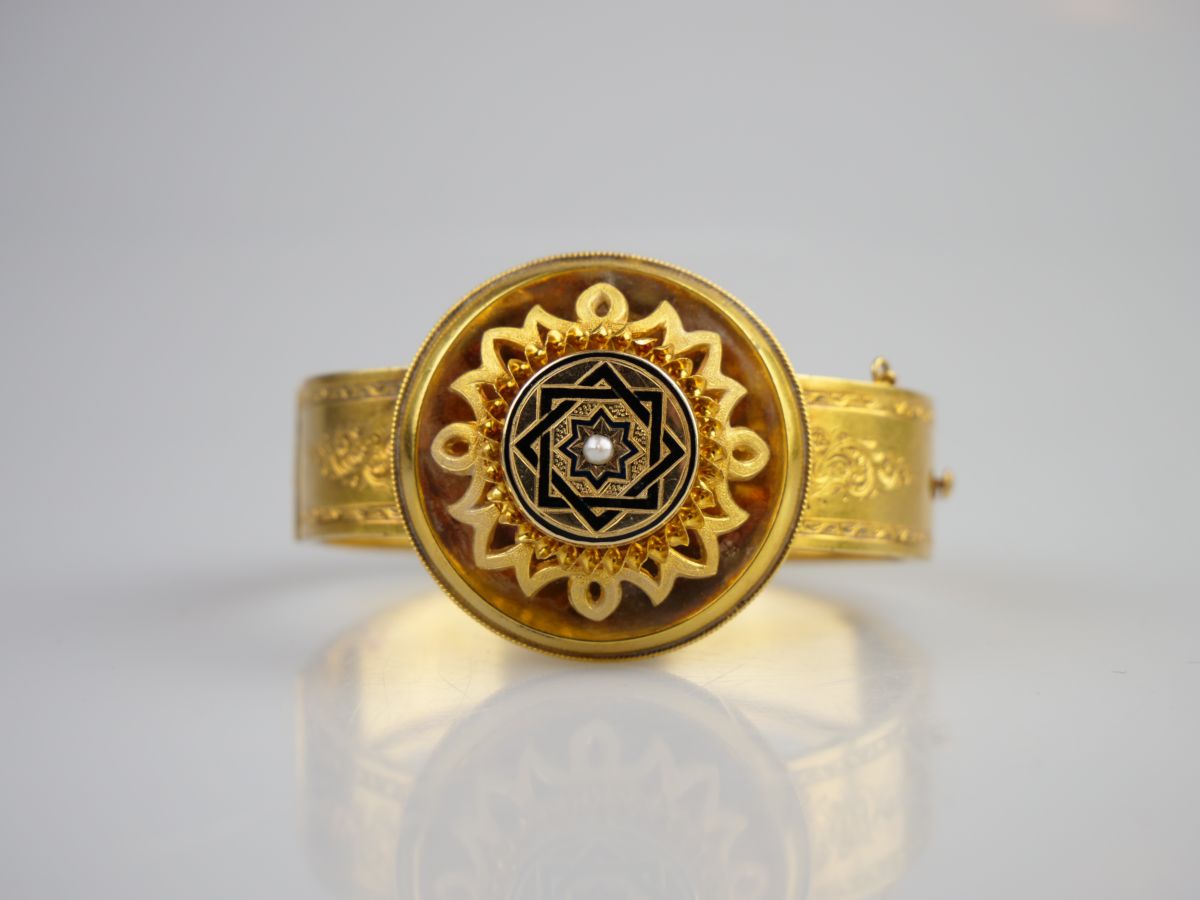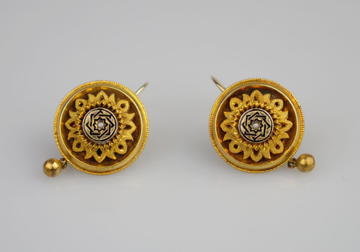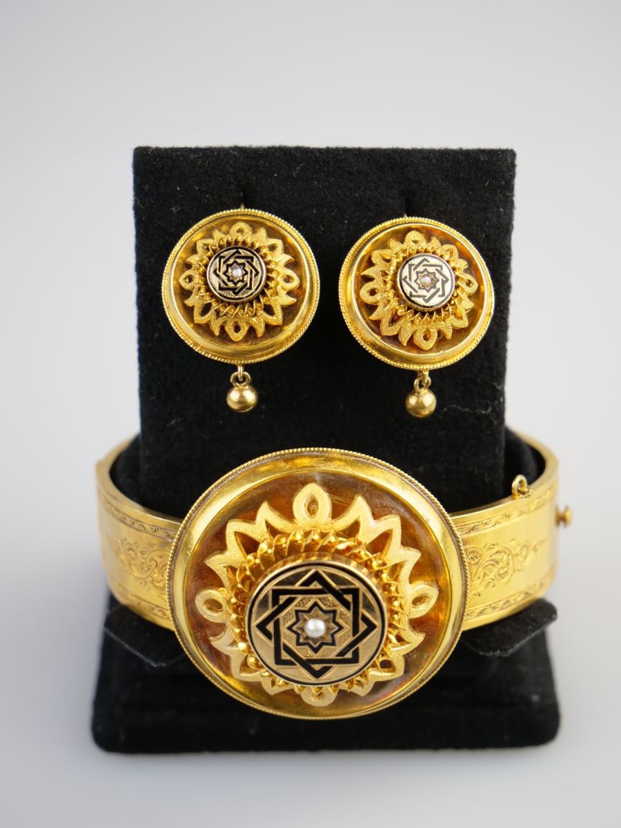souprava šperků - zlatý náramek a zlaté naušnice, zdobeno perličkami a černým smaltem ve tvaru dvou orientálních osmicípých hvězd, Au btto 23,35 g/585/1000, západní Evropa, kolem r. 1860; průměr náramku 6 cm, šířka náramku 1,6 cm, průměr hlavy (ozdoby náramku) 3,7 cm, délka náušnice 3,2 cm, průměr (hlava) náušnice 2 cm; atest Puncovního úřadu
