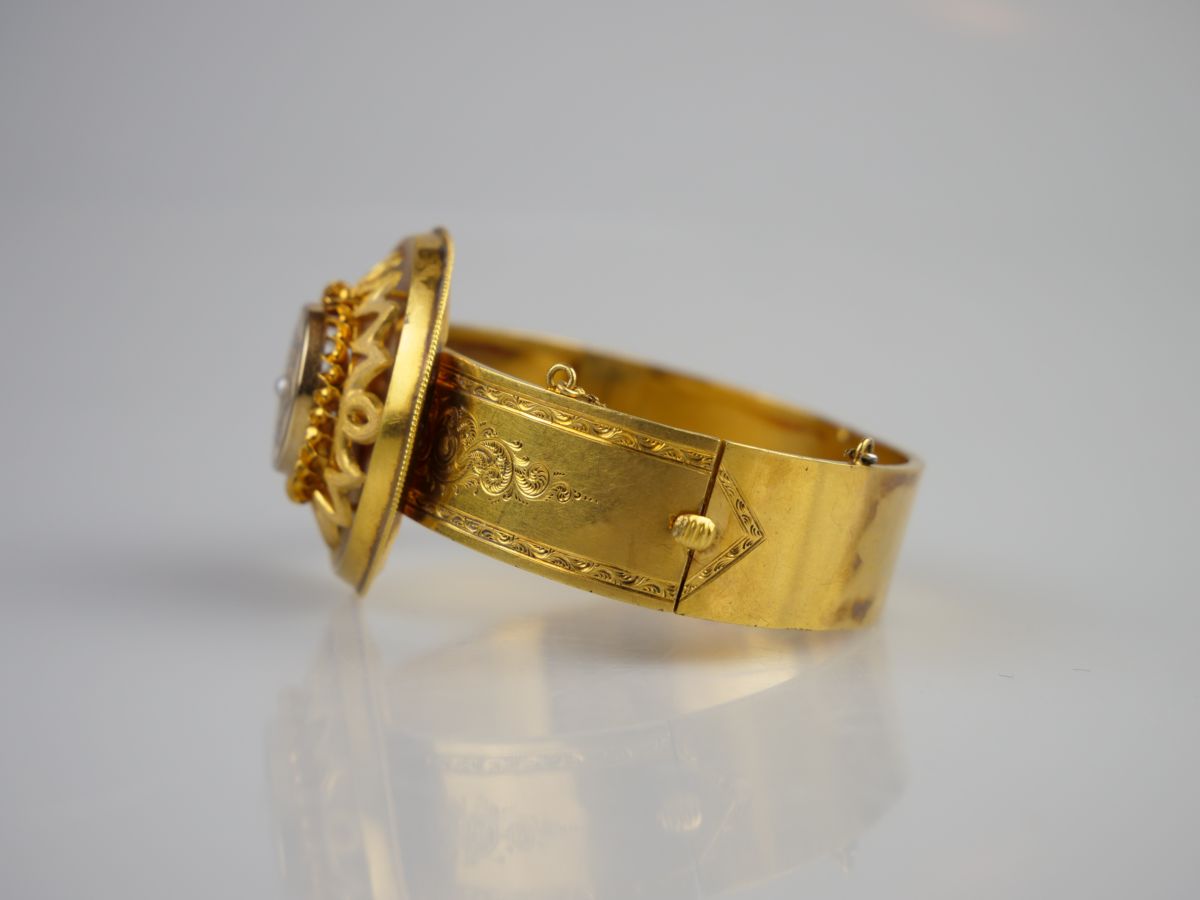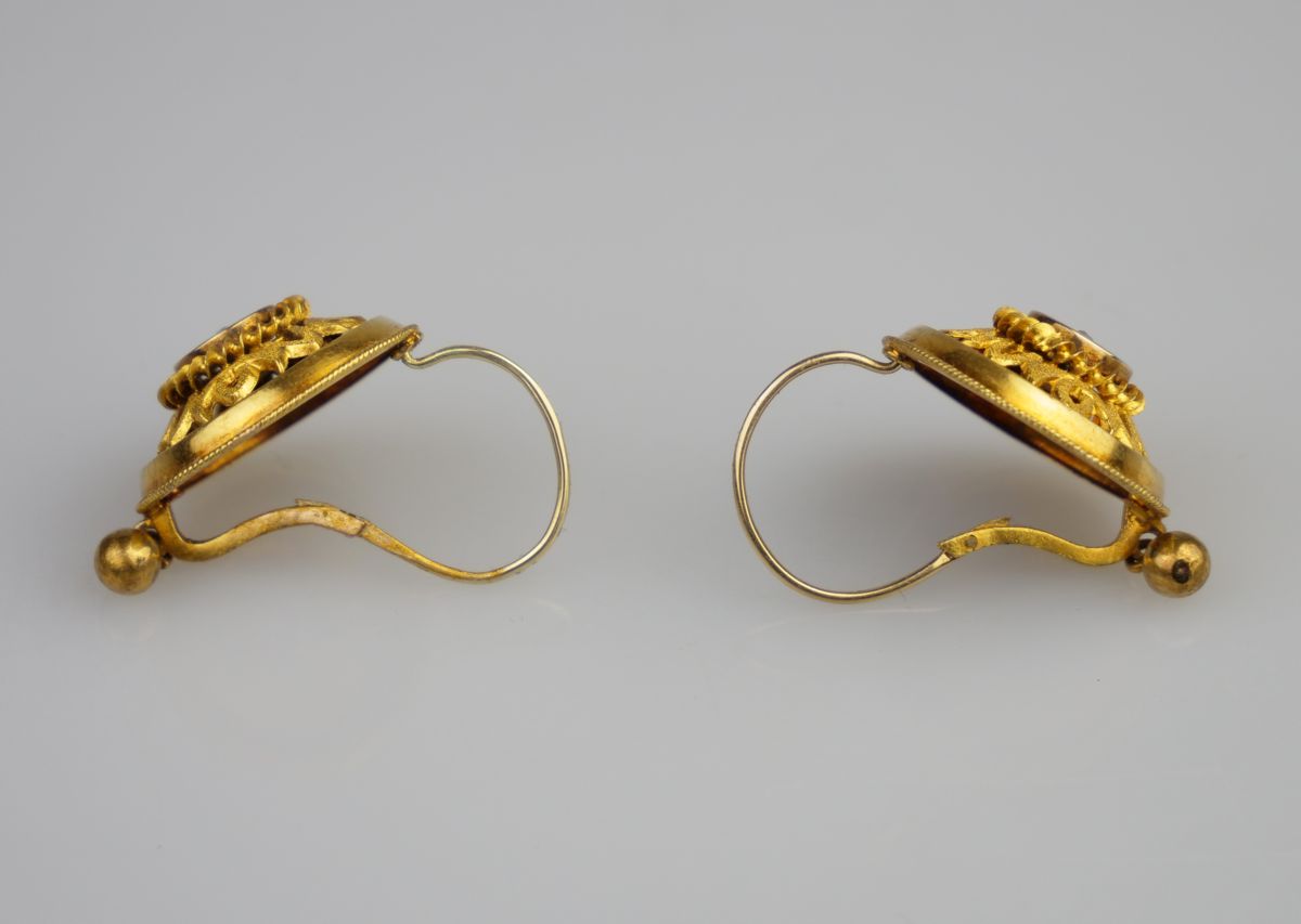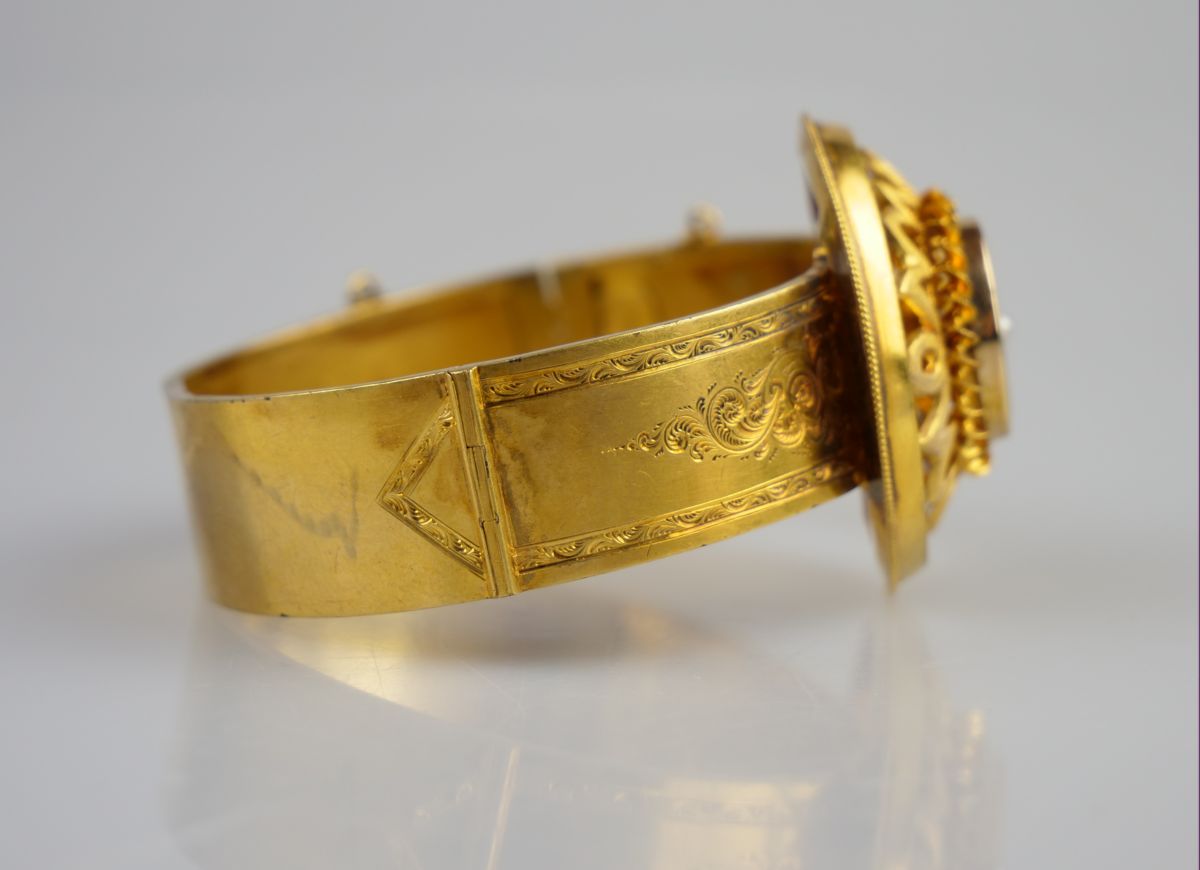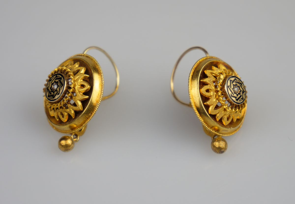 souprava šperků - zlatý náramek a zlaté naušnice, zdobeno perličkami a černým smaltem ve tvaru dvou orientálních osmicípých hvězd, Au btto 23,35 g/585/1000, západní Evropa, kolem r. 1860; průměr náramku 6 cm, šířka náramku 1,6 cm, průměr hlavy (ozdoby náramku) 3,7 cm, délka náušnice 3,2 cm, průměr (hlava) náušnice 2 cm; atest Puncovního úřadu