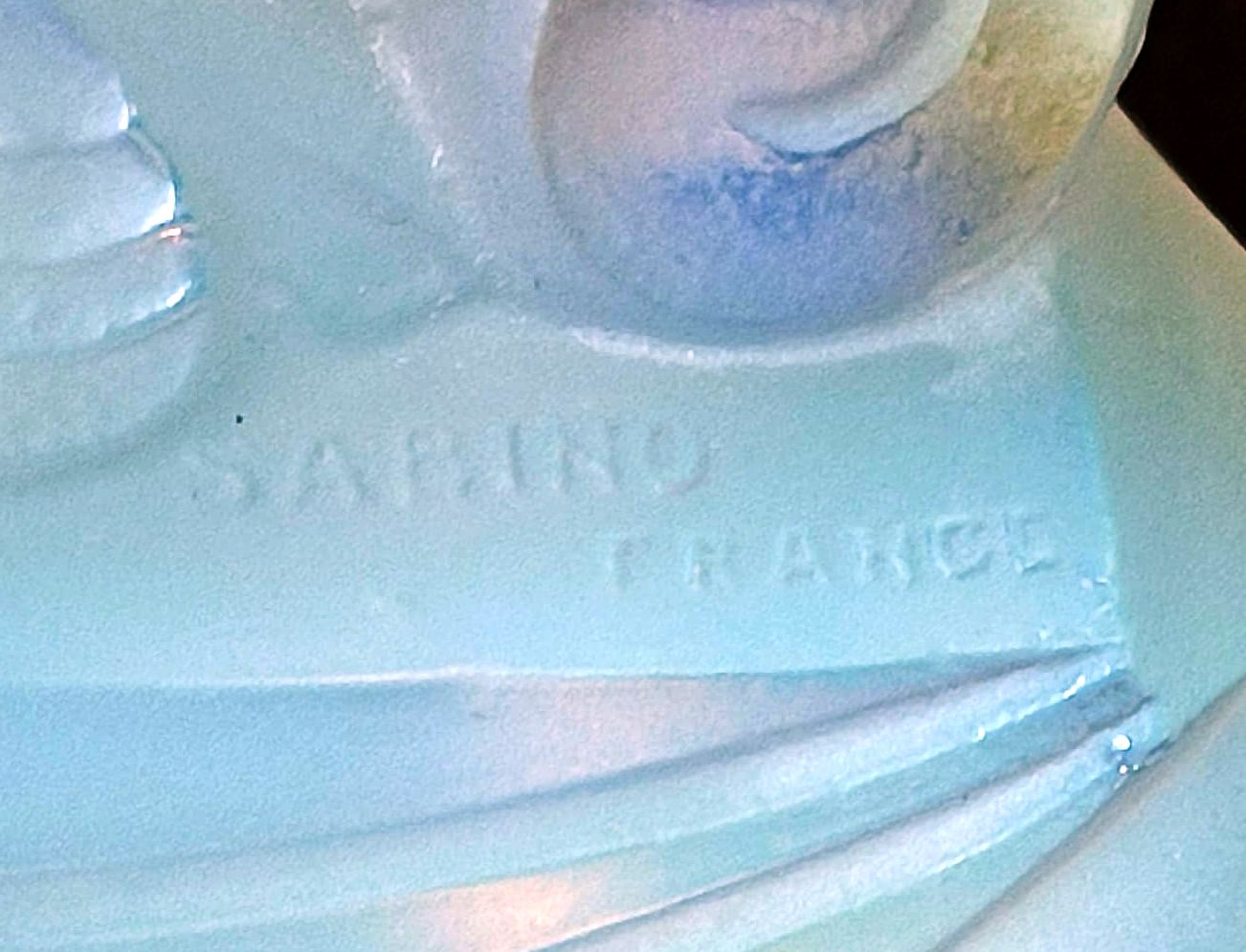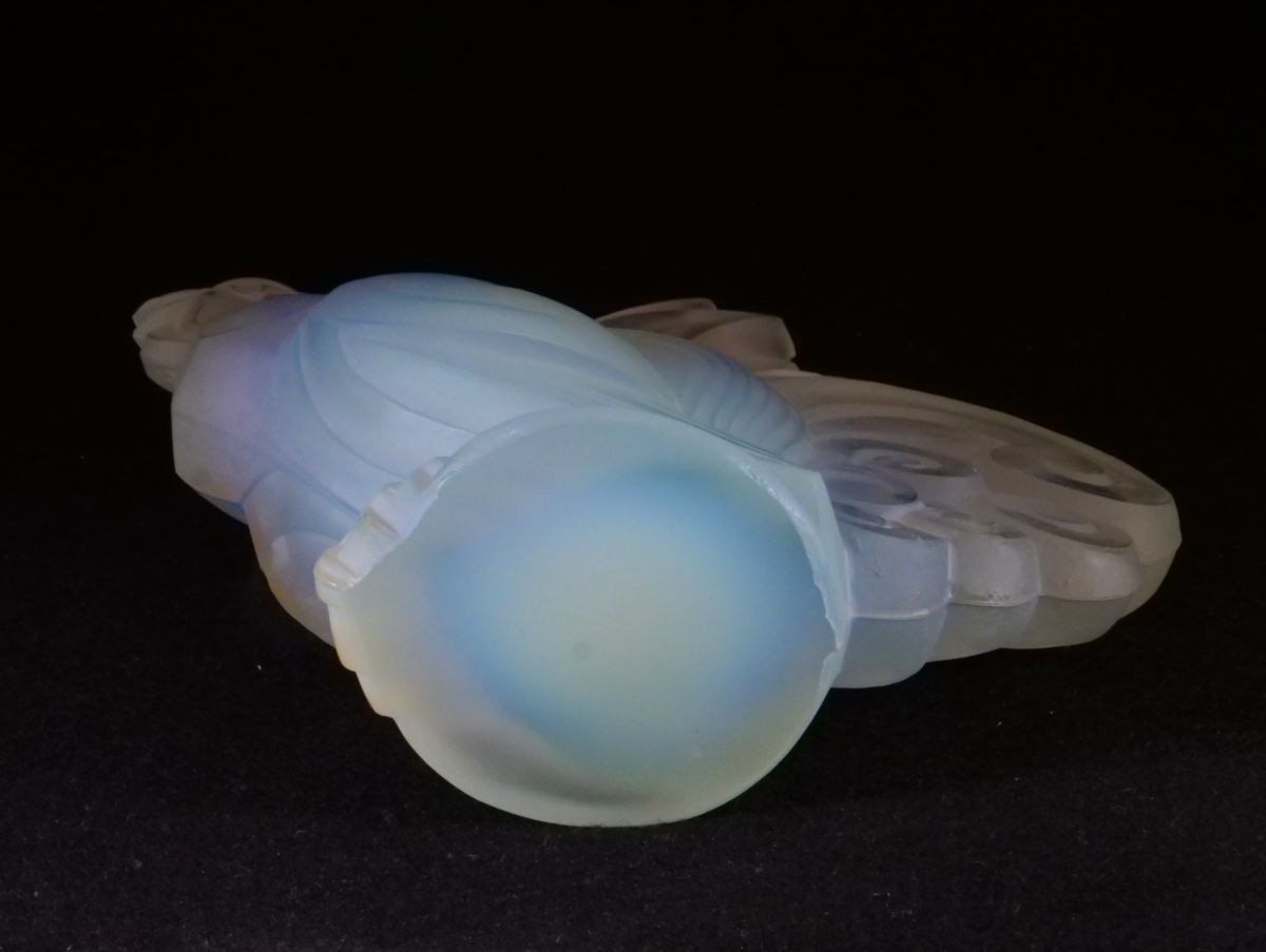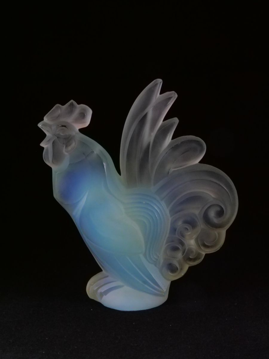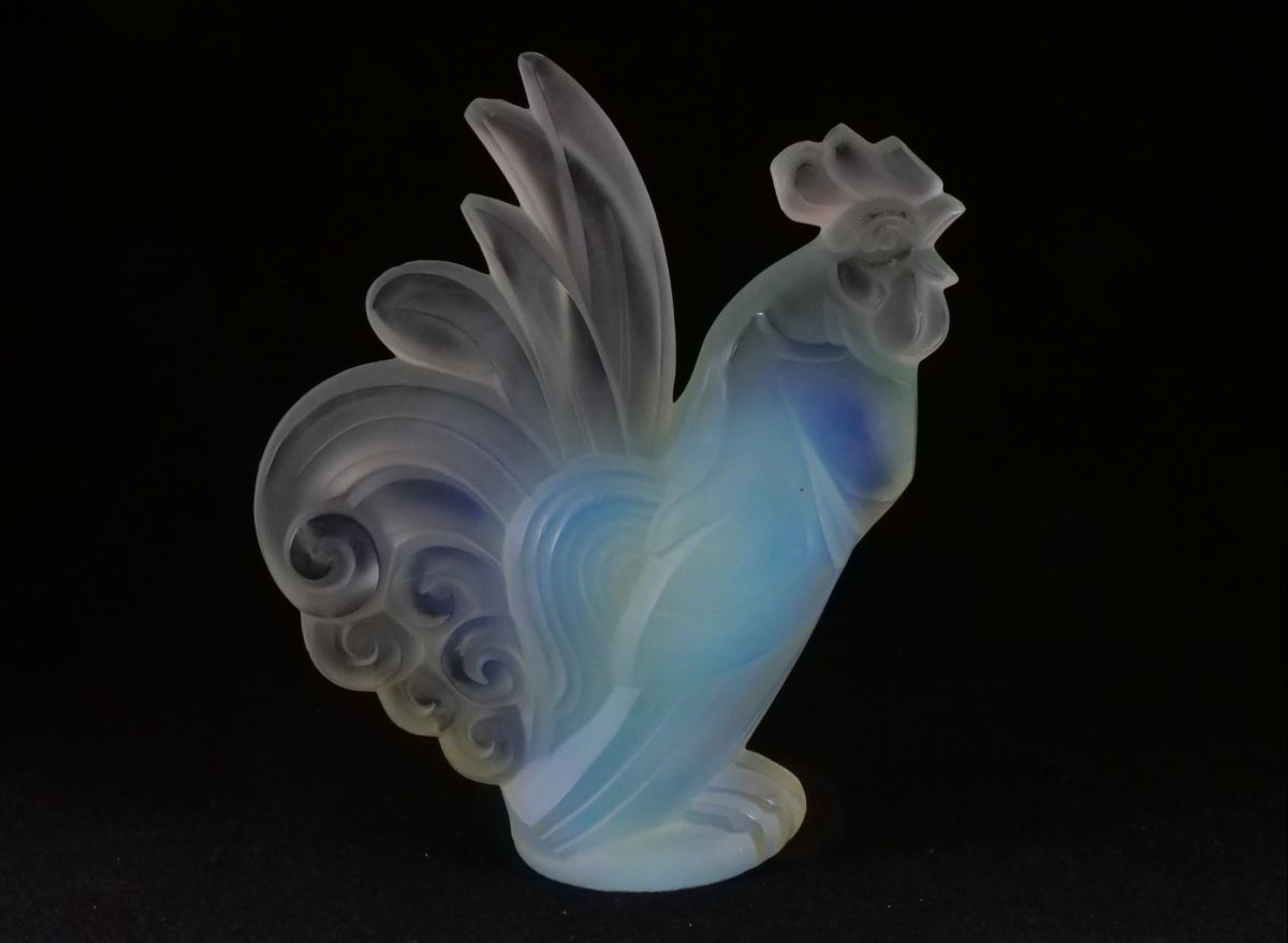 art deco plastika kohouta z výrazně probarveného opálového skla, ”car mascot”, pařížská sklárna Sabino, kolem roku 1930, značeno, výška 19 cm, délka 17,5 cm; francouzský sklářský výtvarník a podnikatel italského původu Marius-Ernest Sabino (1878-1961); sběratelsky zajímavé