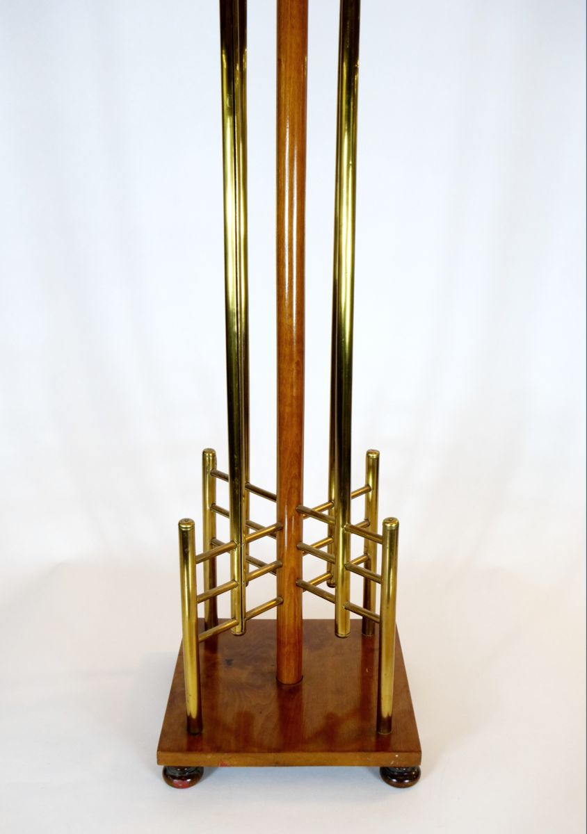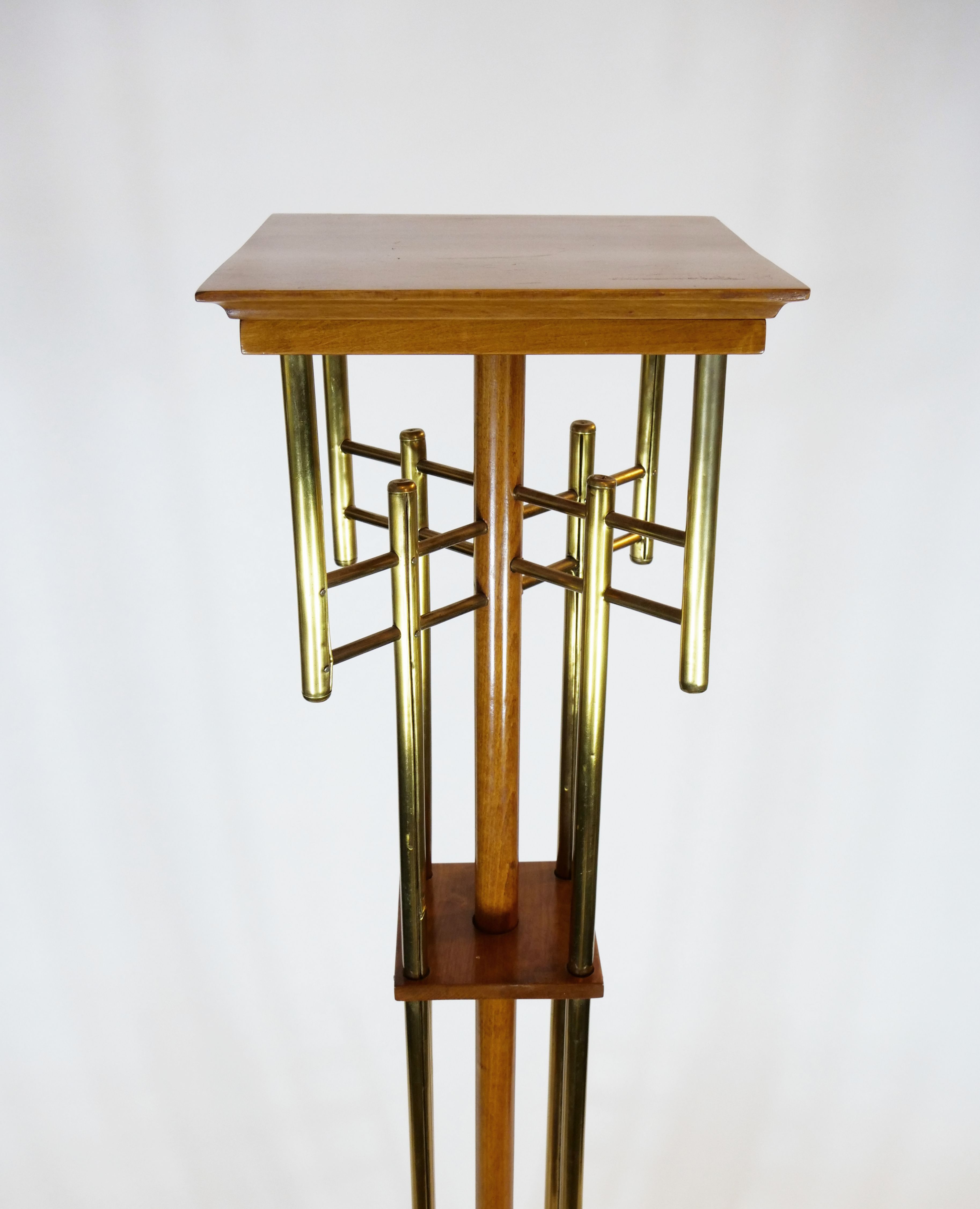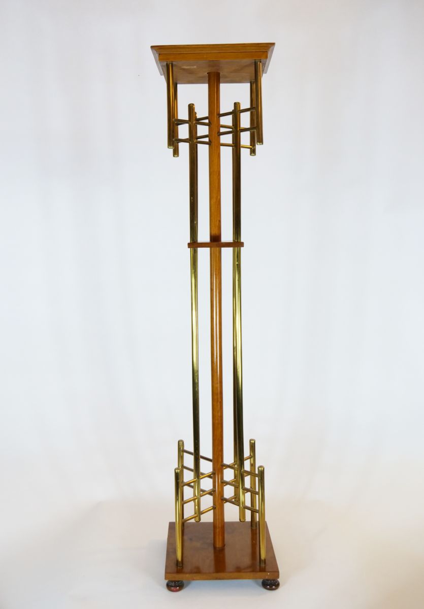 podstavec v japonském stylu na květiny nebo na plastiku, světlý ořech a mosaz, západní Evropa, kolem r. 1915; výška 122 cm, rozměr plochy 25,5 x 26,5 cm