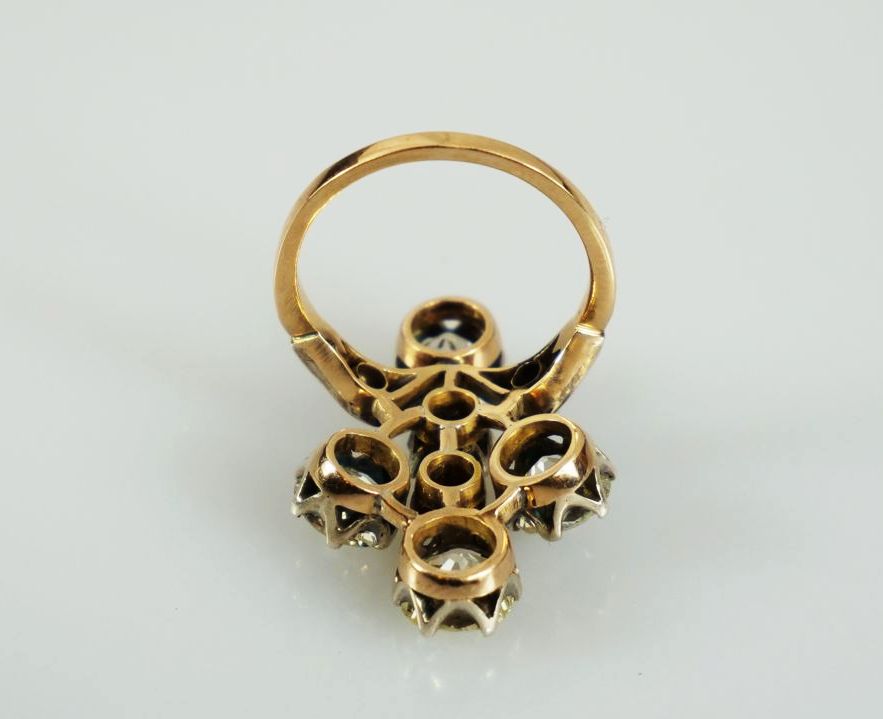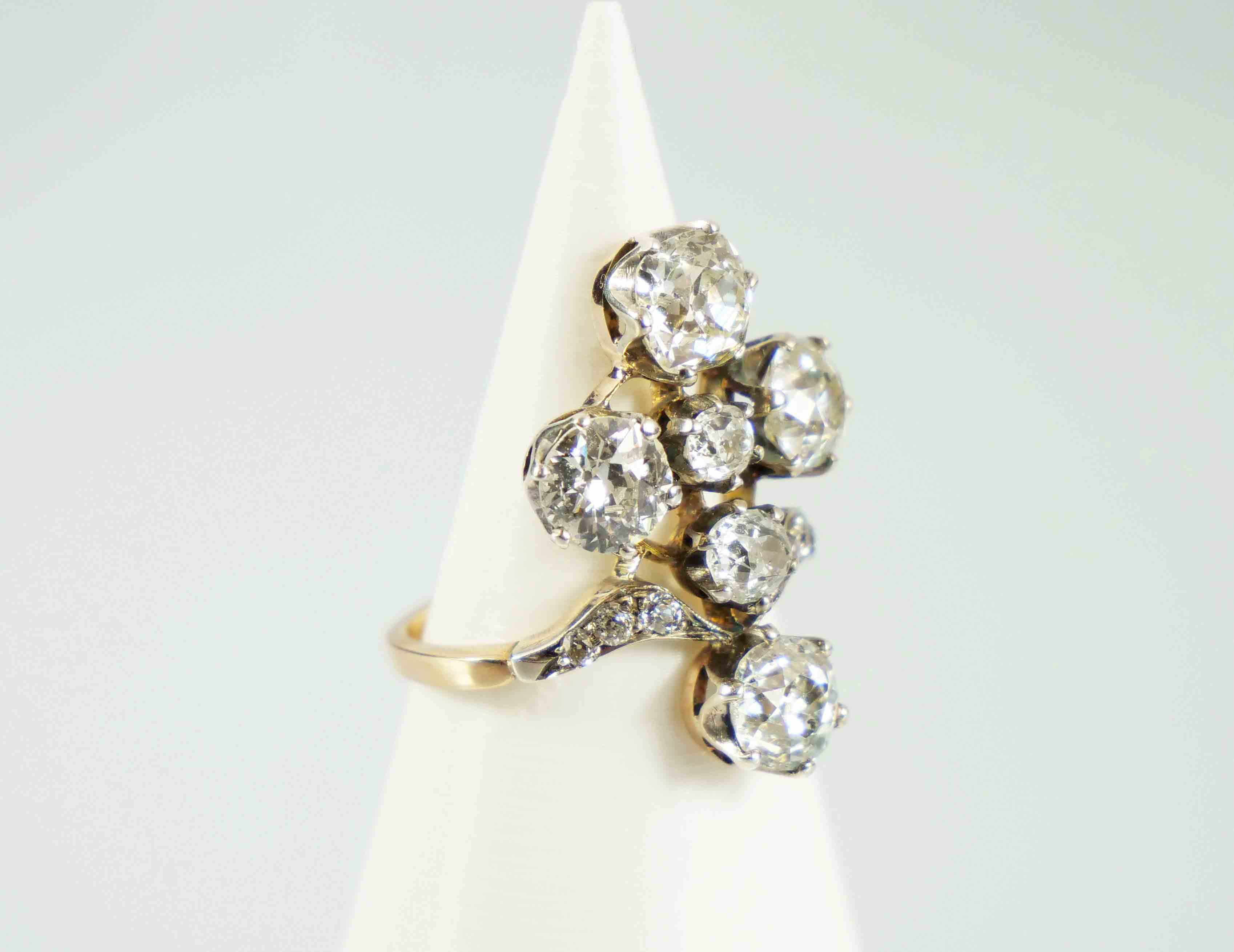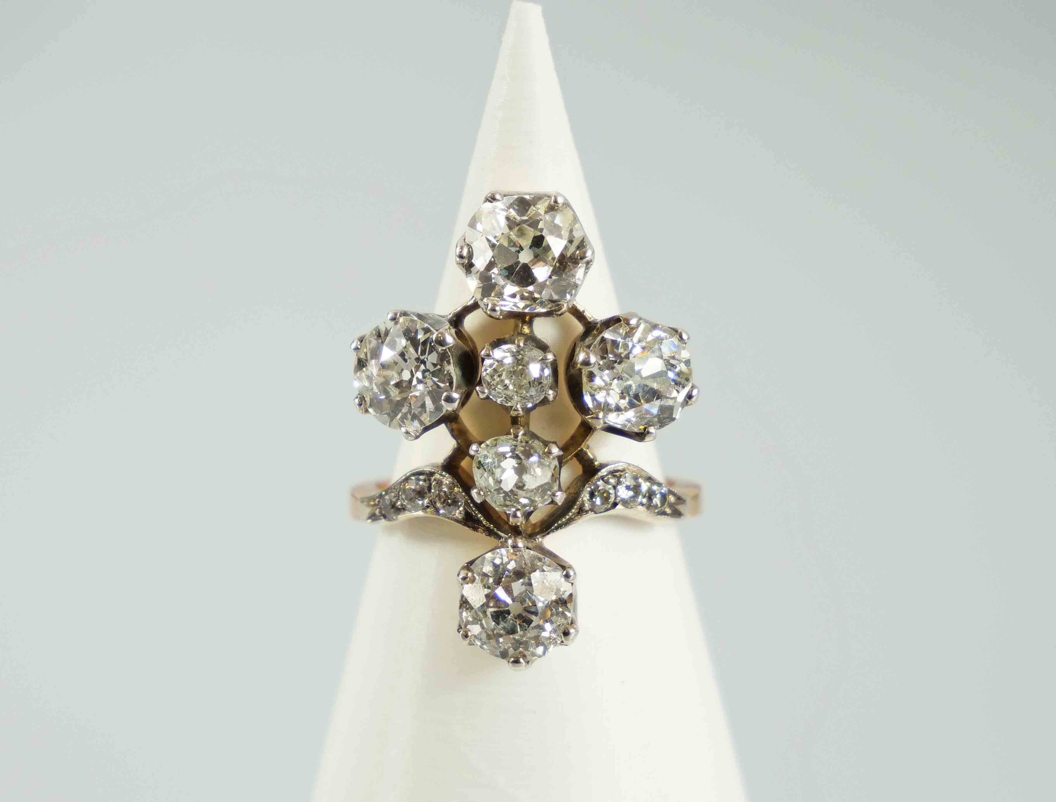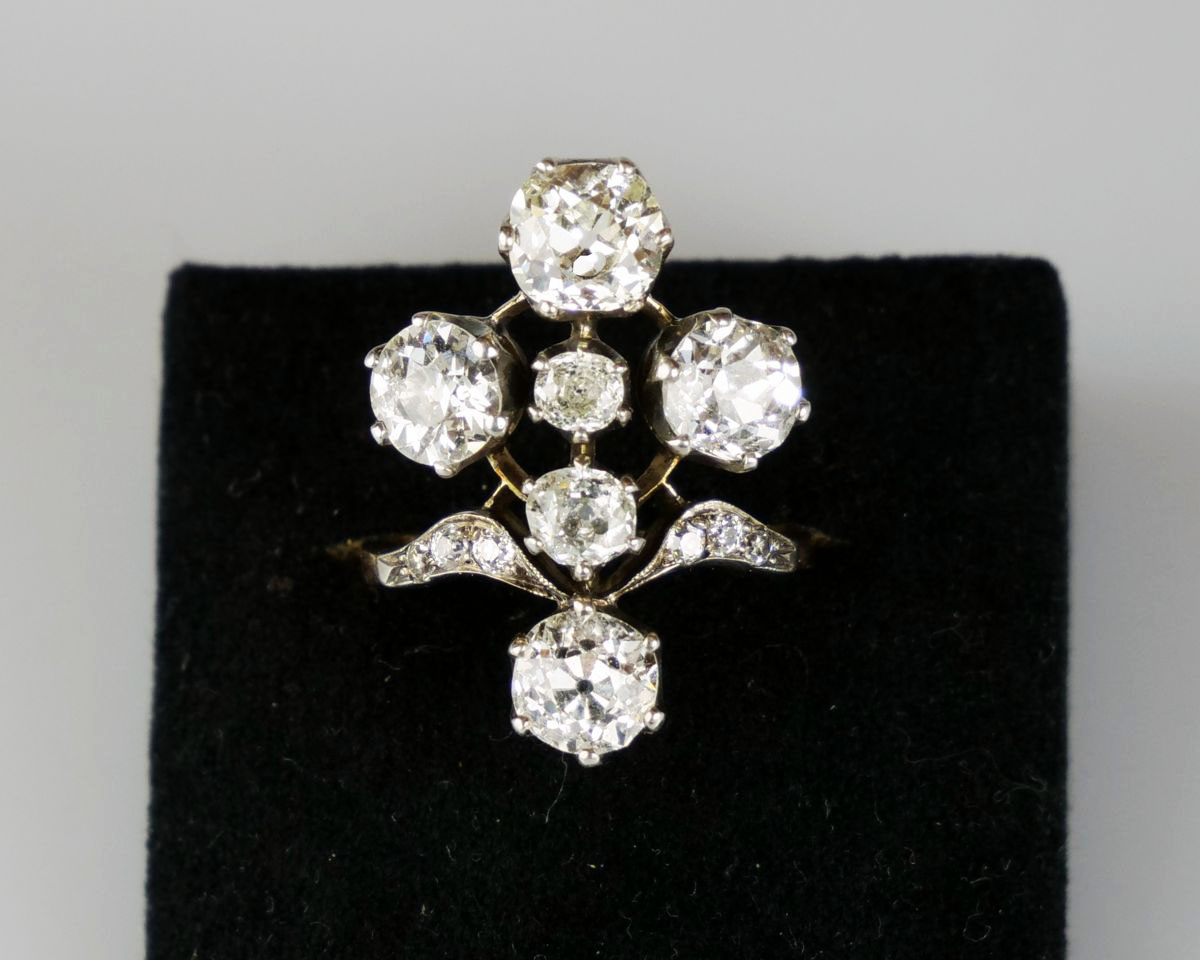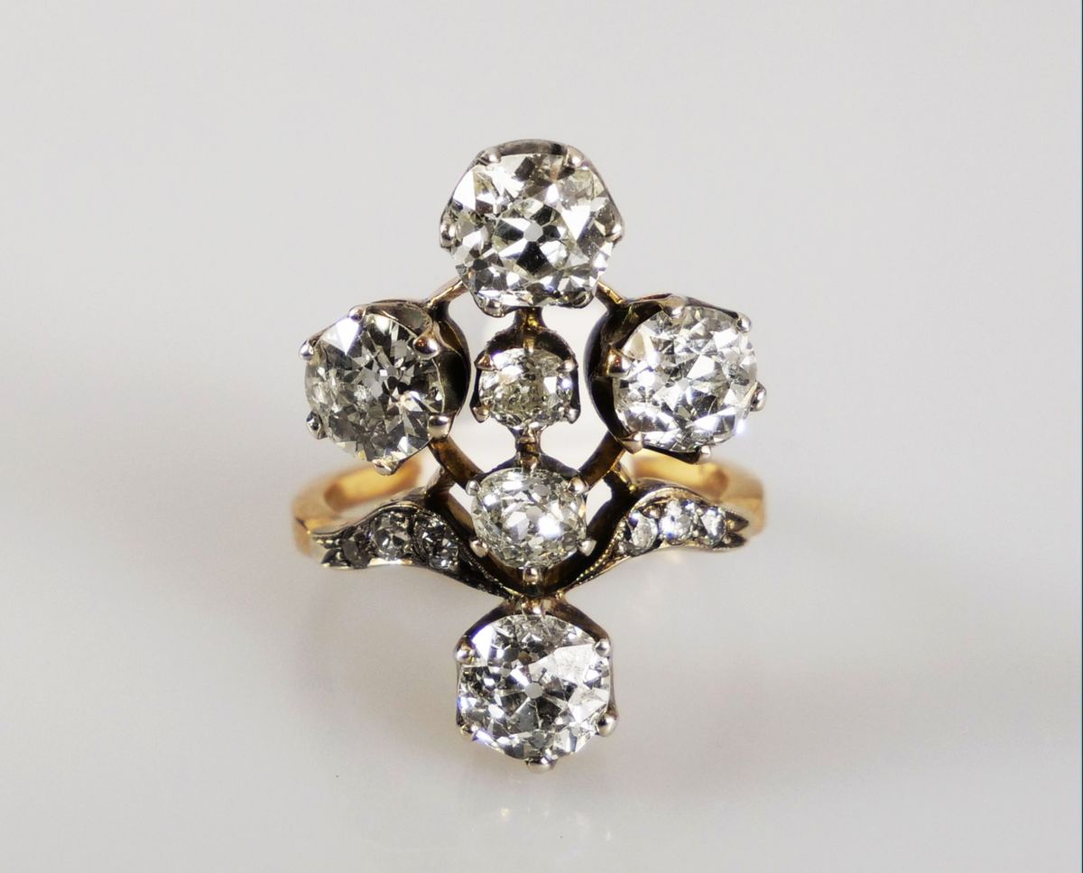 mimořádný zlatý prsten ve tvaru kříže s diamanty briliantového brusu o celkové hmotnosti cca 5,42 ct, Au btto 6,58 g/570/1000, jednotlivé diamanty (zasazené ve stříbře) mají hmotnost 1,26 ct (VS2) + 0,95 ct (Si2) +1,18 ct (P1) +1,25 ct (P1) +0,60 ct; Rakousko-Uhersko, kolem r. 1900, atest Puncovního úřadu, znalecký posudek; rozměry prstenu 2,47 x 2,09 x 2,73 cm; velikost prstenu 56