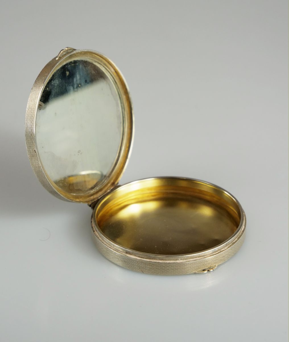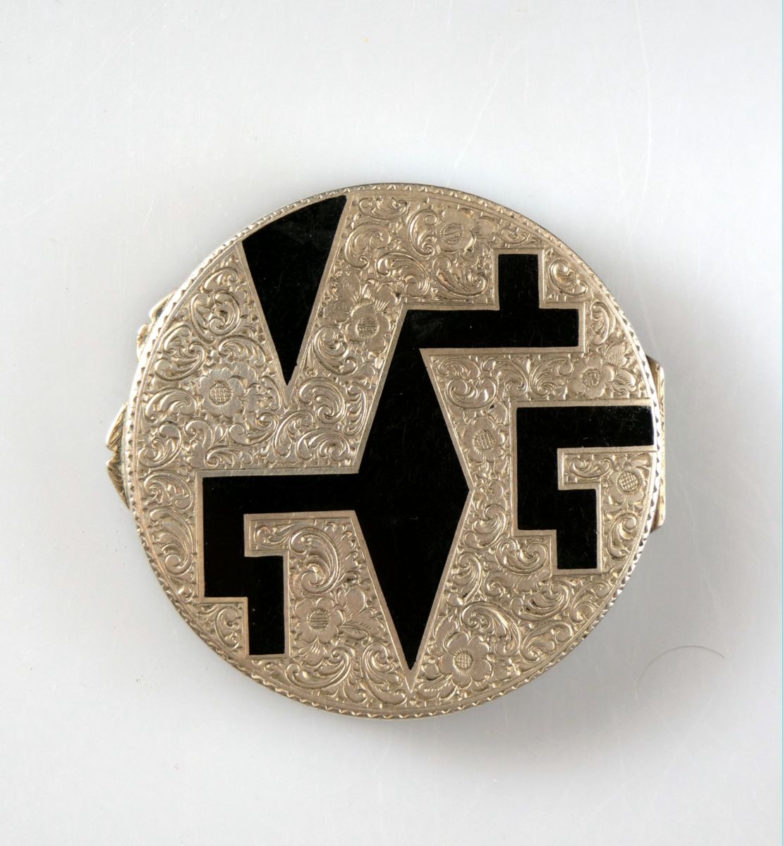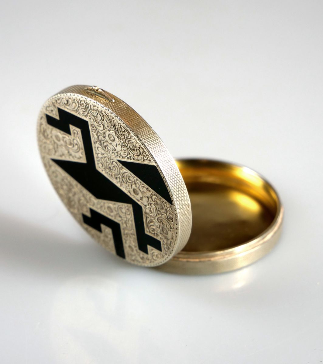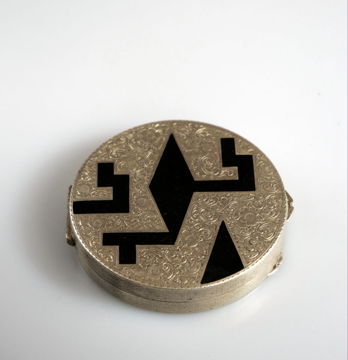 art deco stříbrná pudřenka se zrcátkem, zdobená gravírováním a výrazným černým emailovým dekorem, Ag 77,50g/900/1000, západní Evropa, dobový československý dovozový punc, kolem r. 1930; průměr 6,20 cm