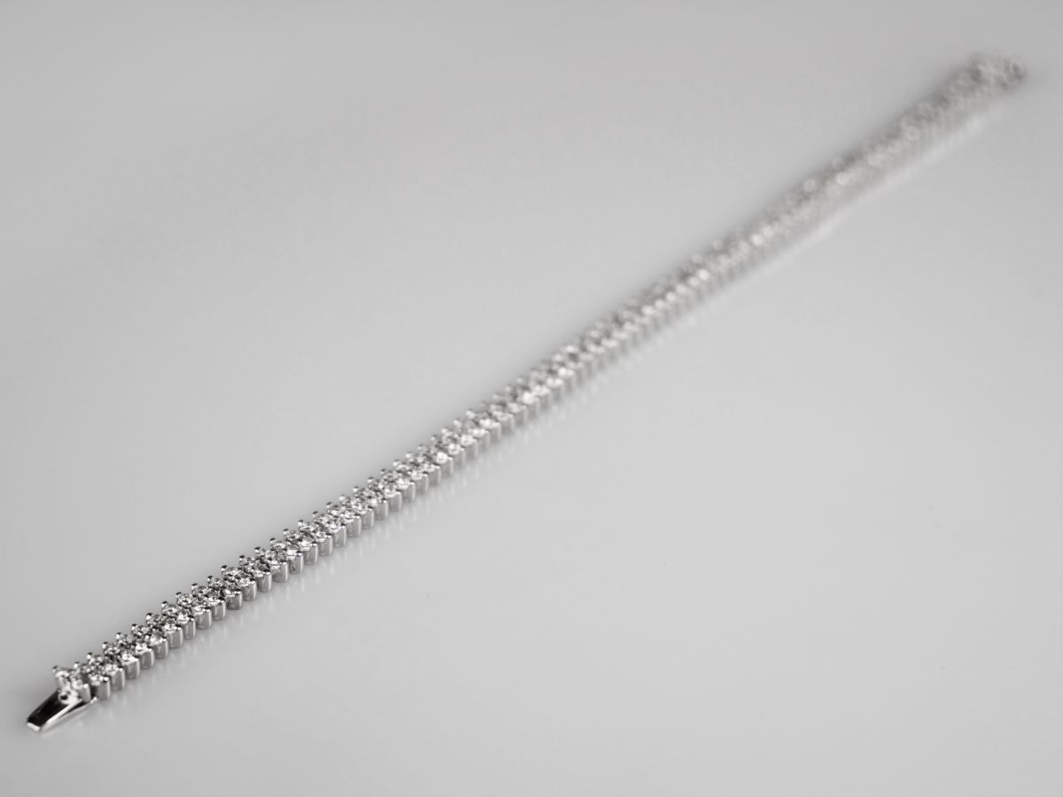 ”tenisový” dvouřadý náramek z bílého zlata se 162 diamanty briliantového brusu o celkové hmotnosti přibližně 5 ct, Au btto 21,61 g/750/1000, západní Evropa, kolem r. 1990; pozdější český punc (kohout), šířka 0,5 cm, délka 20 cm