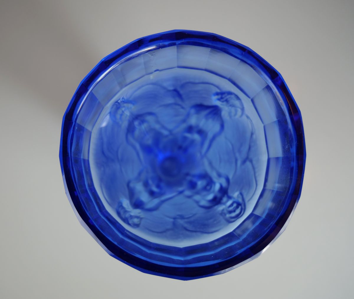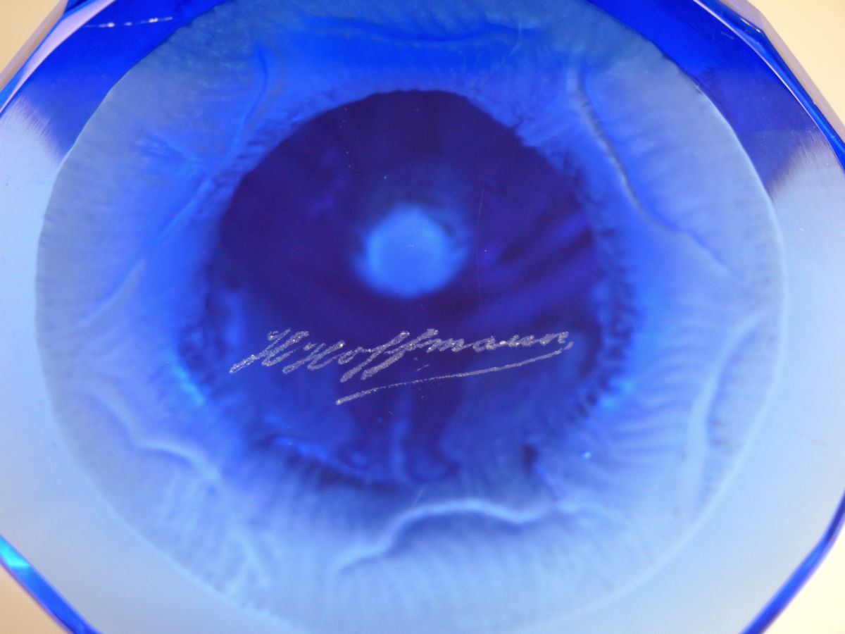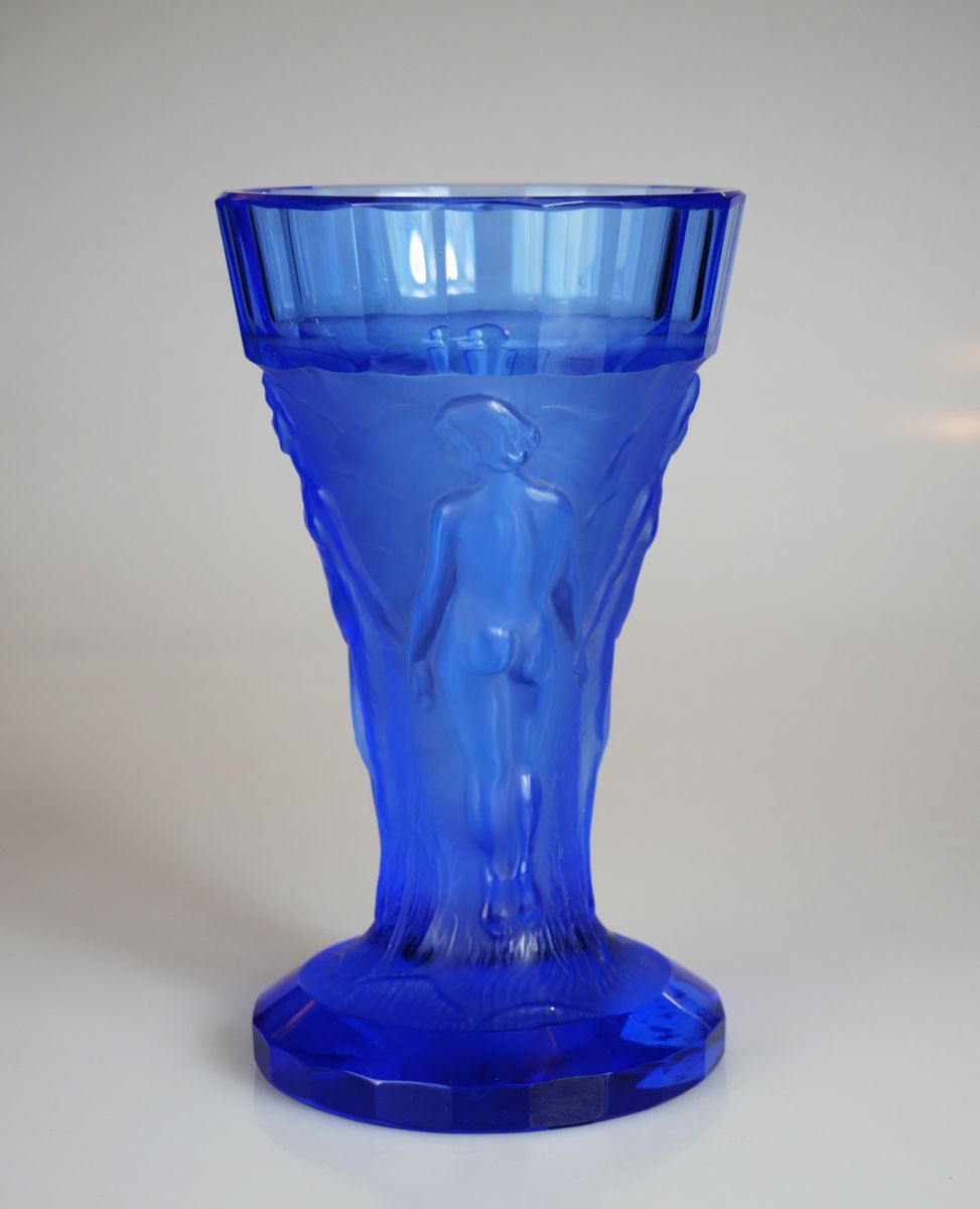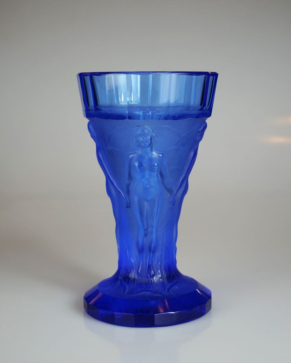 váza s reliéfem 4 ženských aktů, křišťálové sklo modře zbarvené, lisované, matované, broušené a leštěné, firma Heinrich Hoffmann, Jablonec nad Nisou, kolem r. 1928; signováno; výška 16,5 cm; exportní artikl firmy kvalitativně srovnatelný s francouzskou značkou Lalique, sběratelsky zajímavé