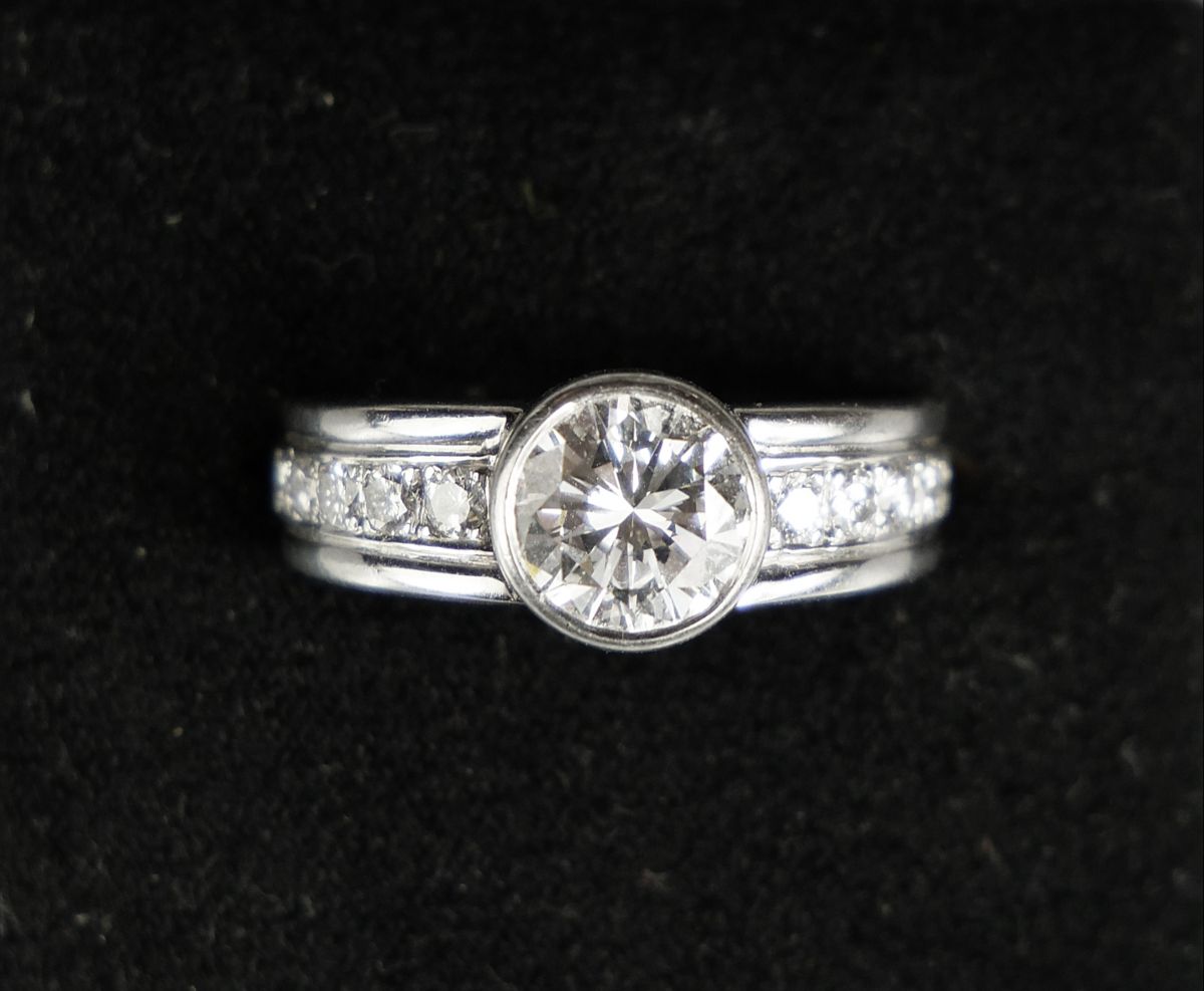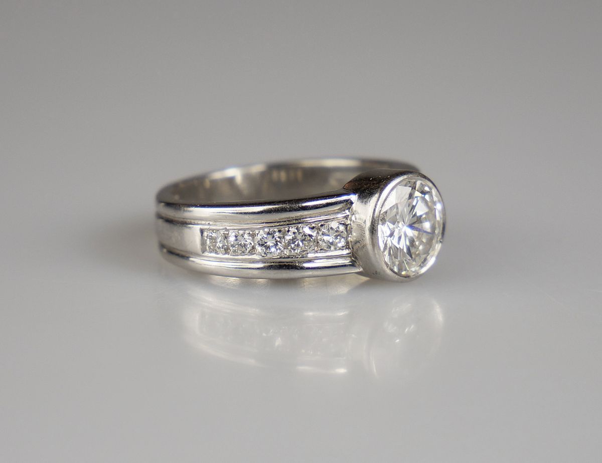 zlatý prsten s diamanty, centrální diamant briliantového brusu o hmotnosti cca 1,61 ct, vzácná bíla barva F-G, čistota VS1, vynikající symetrie brusu, dále na prstenu 10 malých diamantů briliantového brusu o hmotnosti 0,35 ct, Au 7,42 g/750/1000, Západní Evropa, kolem roku 2000; osvědčení Puncovního úřadu, znalecký posudek; velikost prstenu 56