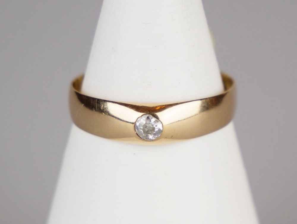 jednoduchý zlatý prsten s diamantem briliantového brusu o hmotnosti 0,1 ct, Au 2,71 g/580/1000, Rakousko-Uhersko, Čechy, kolem r. 1915, dobový punc se značkou pražského puncovního úřadu (liška); velikost prstenu 65