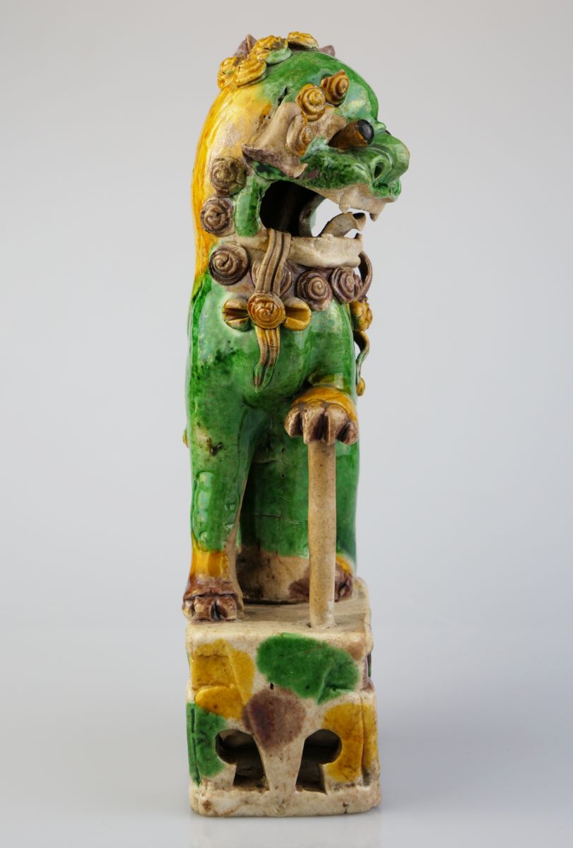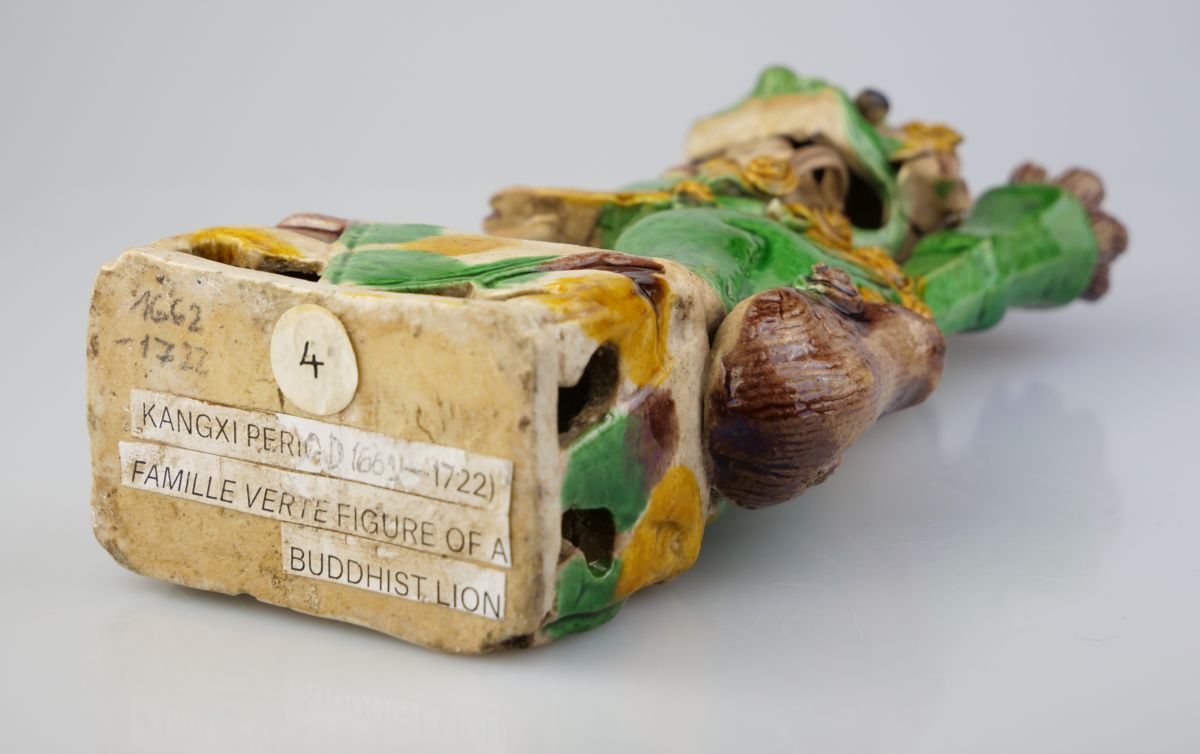 roztomilá buddhistická soška palácového lva z tvrdé barevně glazované póroviny, glazury ve stylu famille verte, Čína, období Kangxi (1622 - 1722), pohyblivé oči, využíváno jako vykuřovadlo, ve velmi dobrém stavu (nepatrné poškození); výška 19 cm, šířka 9 cm, hloubka 5 cm; sběratelsky zajímavé