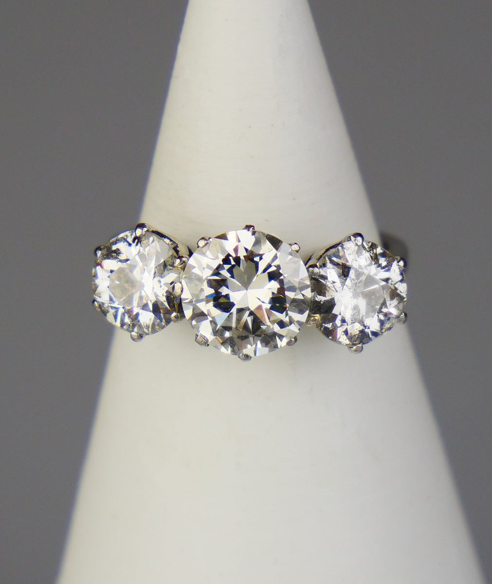 zlatý prsten se 3 diamanty briliantového brusu, Pt btto 4,40 g/950/1000, celková hmotnost diamantů briliantového brusu je 3,66 ct, centrální diamant má hmotnost cca 1,71 ct, barva K-L, čistota VS1, druhý diamant má hmotnost cca 0,97 ct, barva I-J, čistota P1, třetí diamant cca 0,98 ct, barva I-J, čistota P2, Čechy, kolem r. 1995, pozdější puncovní značka, znalecký posudek, velikost prstenu 53