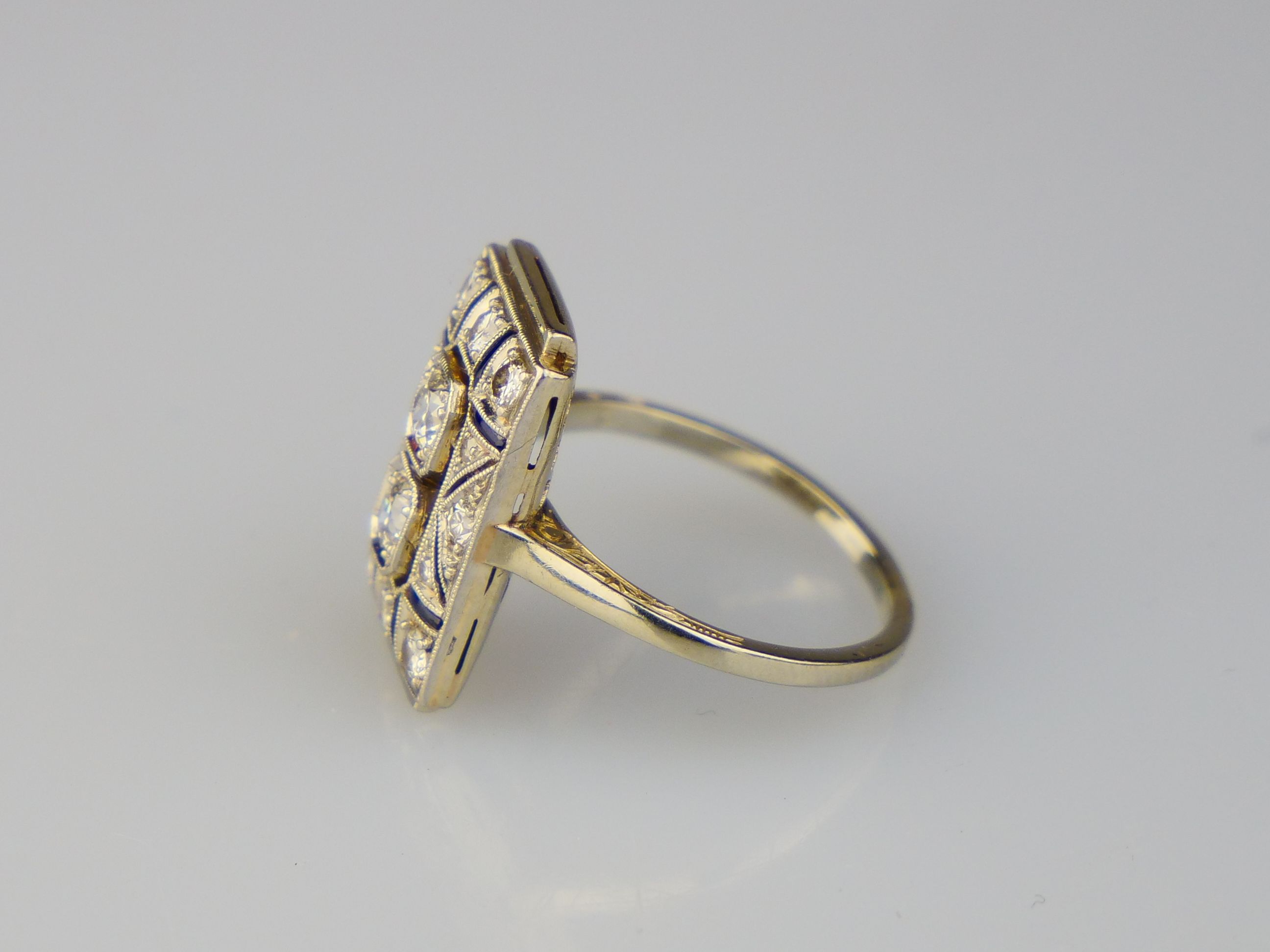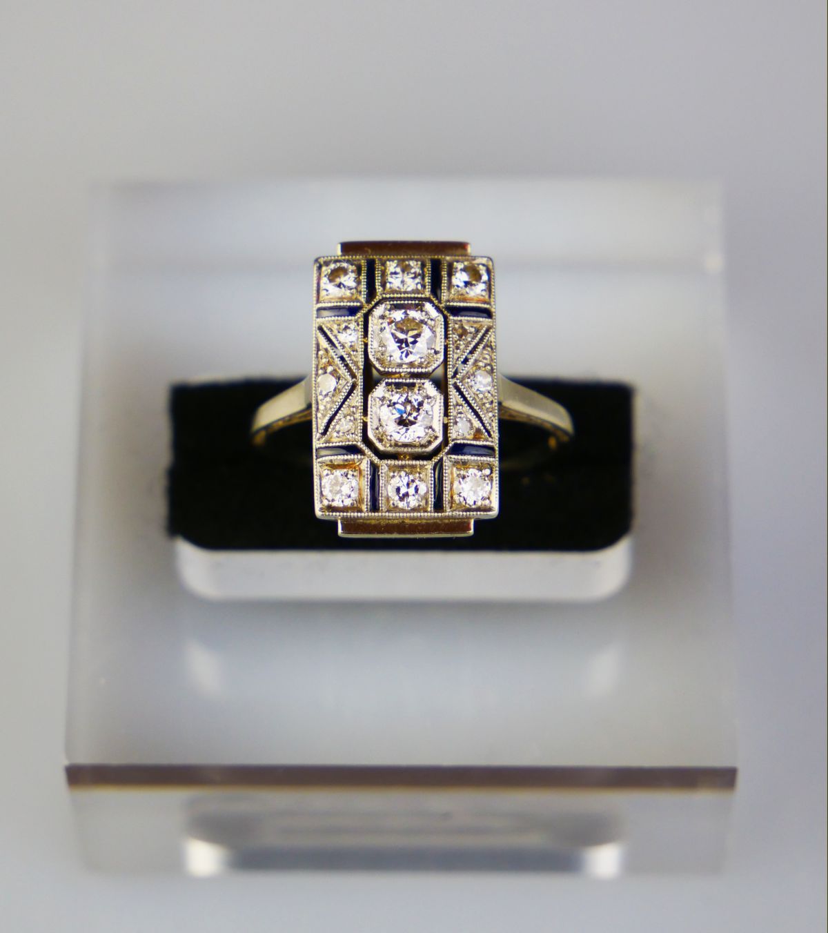 Zlatý art deco prsten s diamanty a safírky