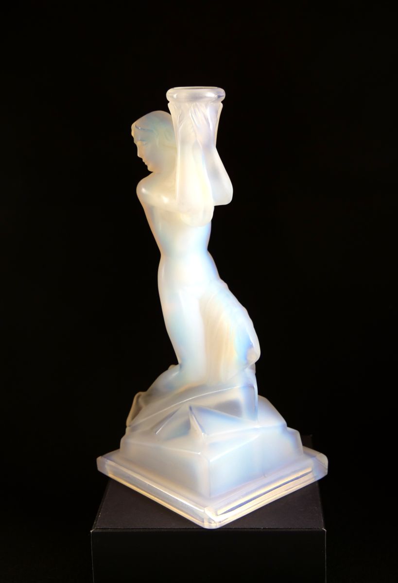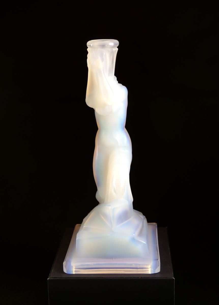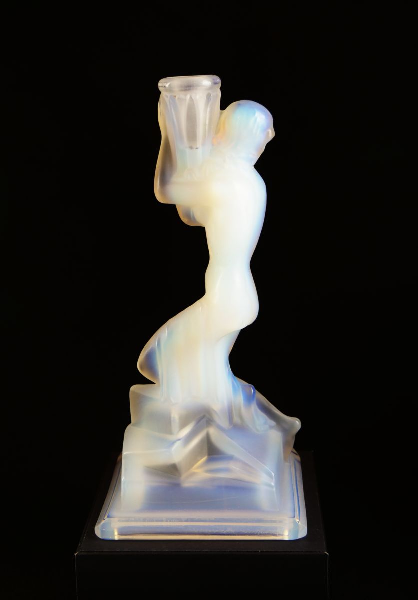 art deco figurální svícen z litého opálového skla, sklárna Josef Riedel, Polubný (Polaun), kolem r. 1930; výška 21,8 cm; model publikovaný v odborné literatuře; sběratelsky zajímavé, na trhu se objevuje zřídka