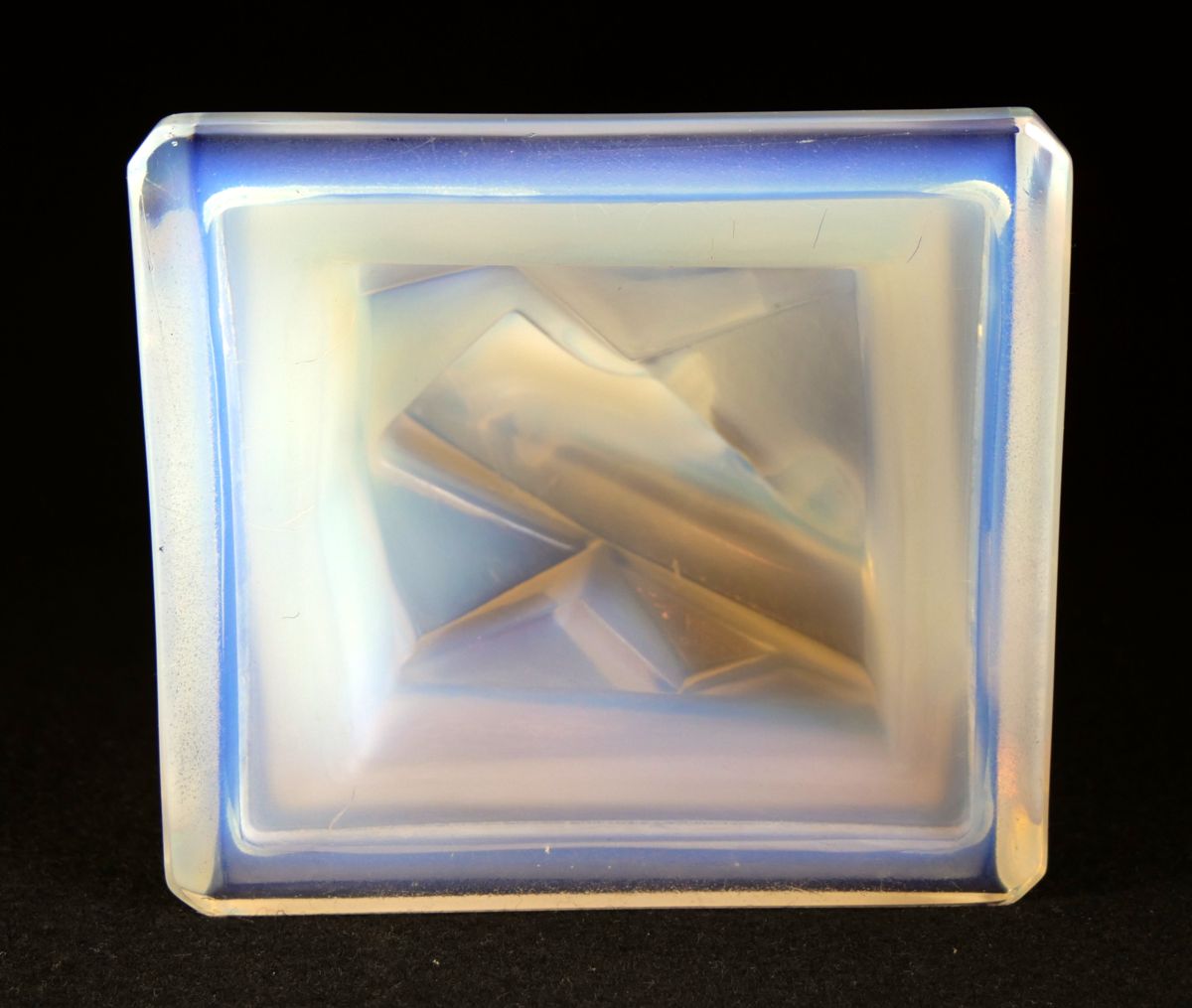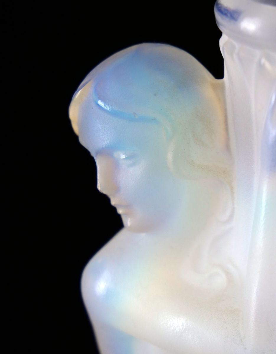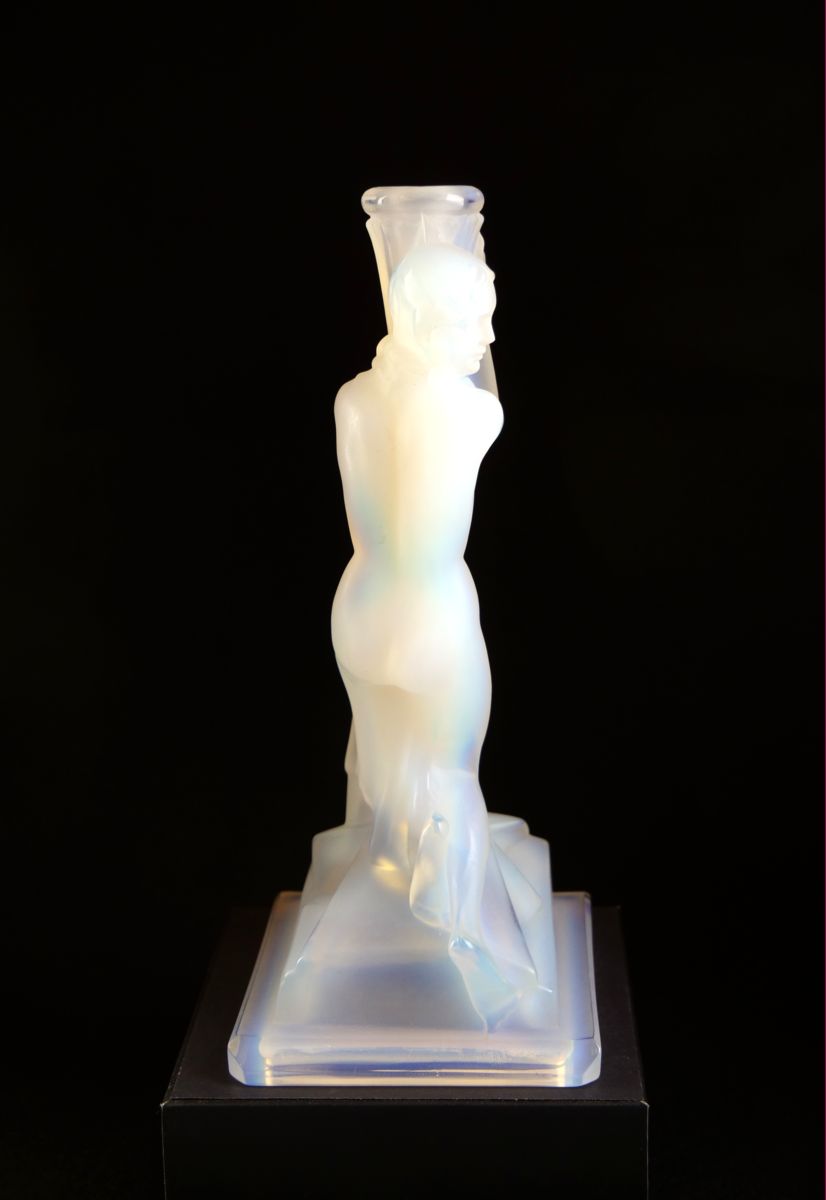 art deco figurální svícen z litého opálového skla, sklárna Josef Riedel, Polubný (Polaun), kolem r. 1930; výška 21,8 cm; model publikovaný v odborné literatuře; sběratelsky zajímavé, na trhu se objevuje zřídka