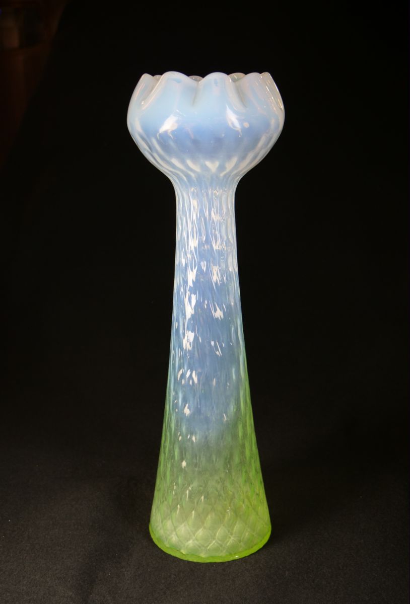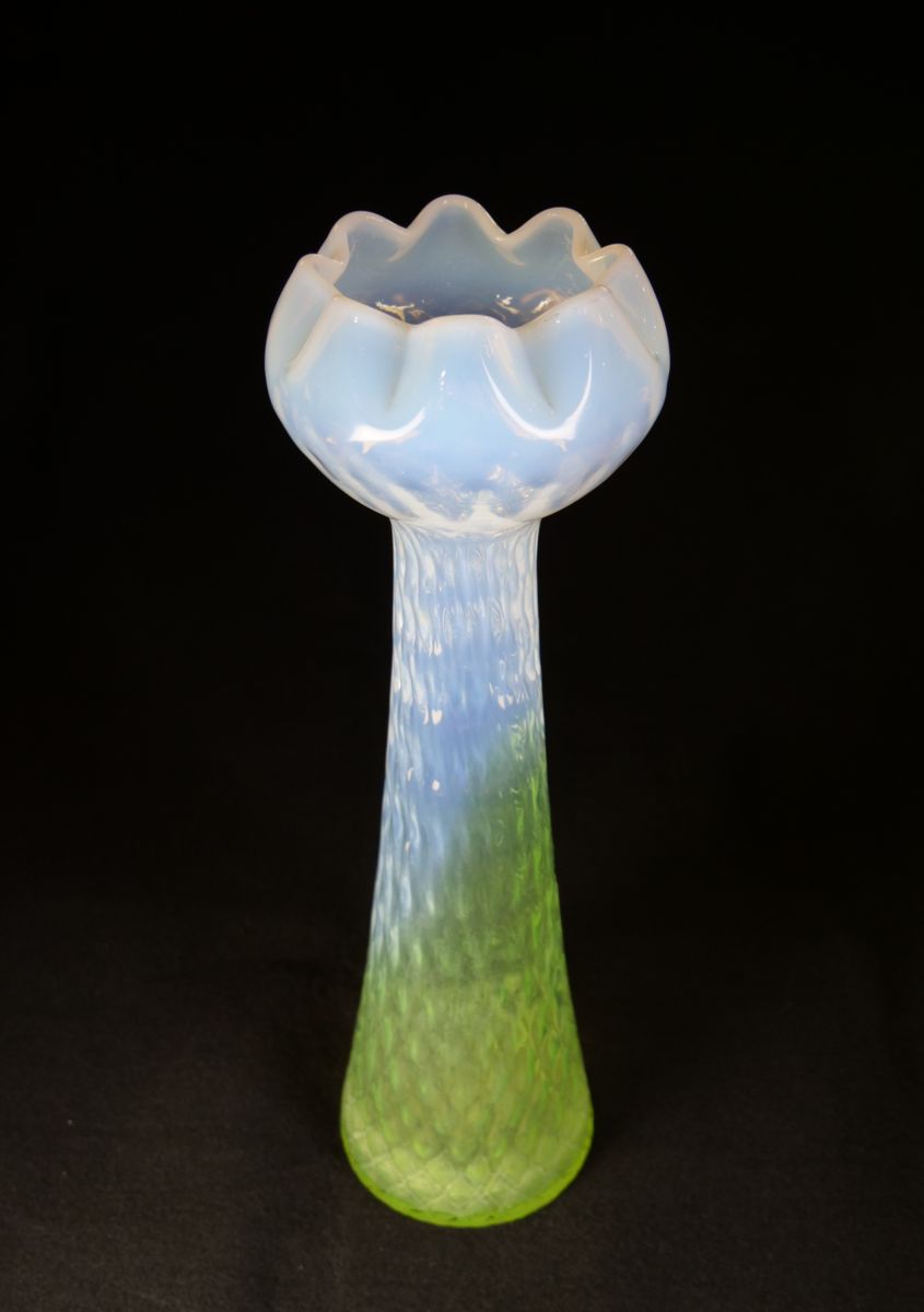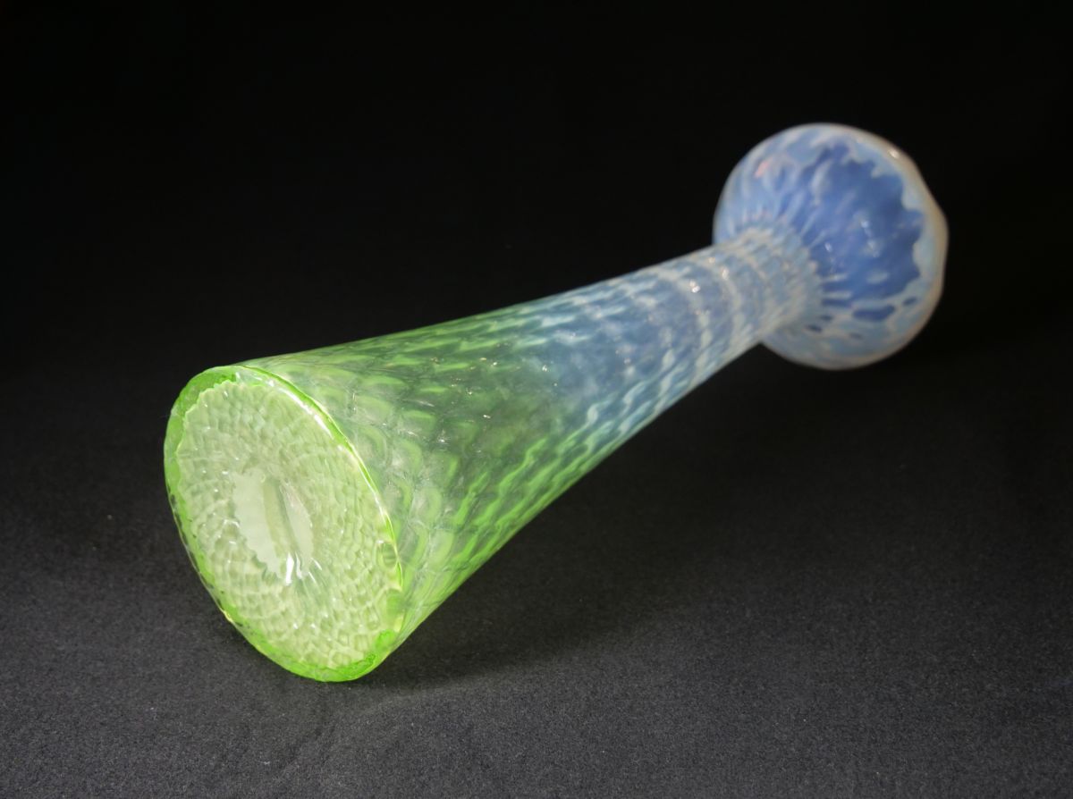 vysoká secesní váza na hyacint, opálové plasticky síťované sklo, zeleně sbíhané, Rakousko-Uhersko, Čechy, pravděpodobně sklárna Harrachov, kolem r. 1910; výška 34,5 cm, průměr 10,5 cm