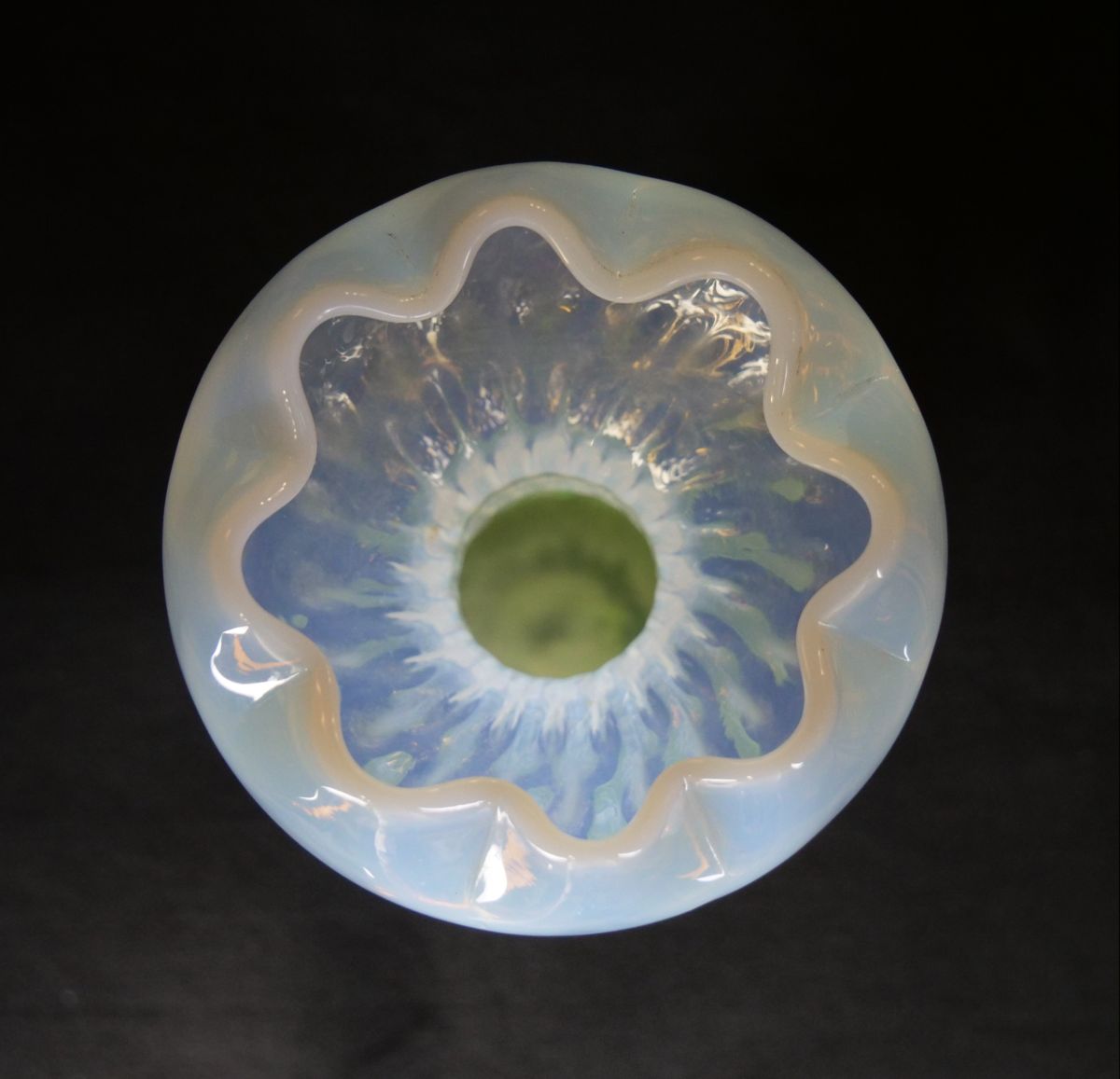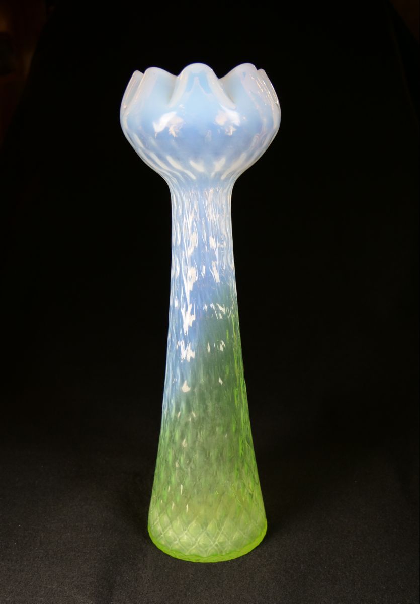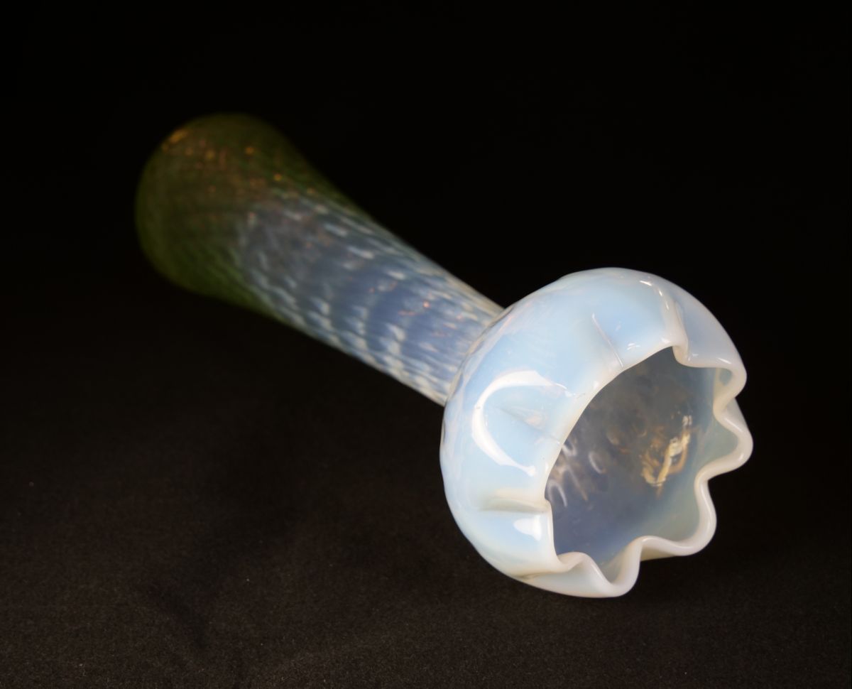 vysoká secesní váza na hyacint, opálové plasticky síťované sklo, zeleně sbíhané, Rakousko-Uhersko, Čechy, pravděpodobně sklárna Harrachov, kolem r. 1910; výška 34,5 cm, průměr 10,5 cm
