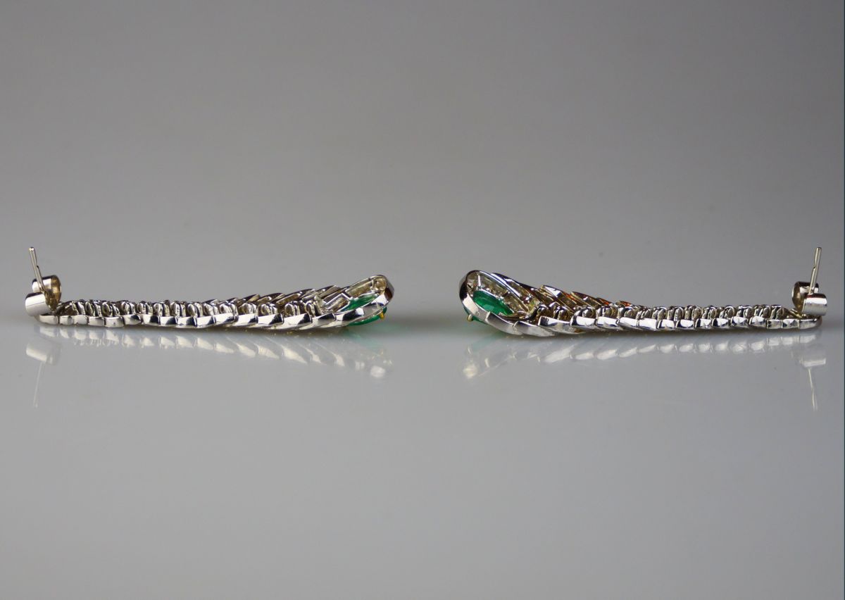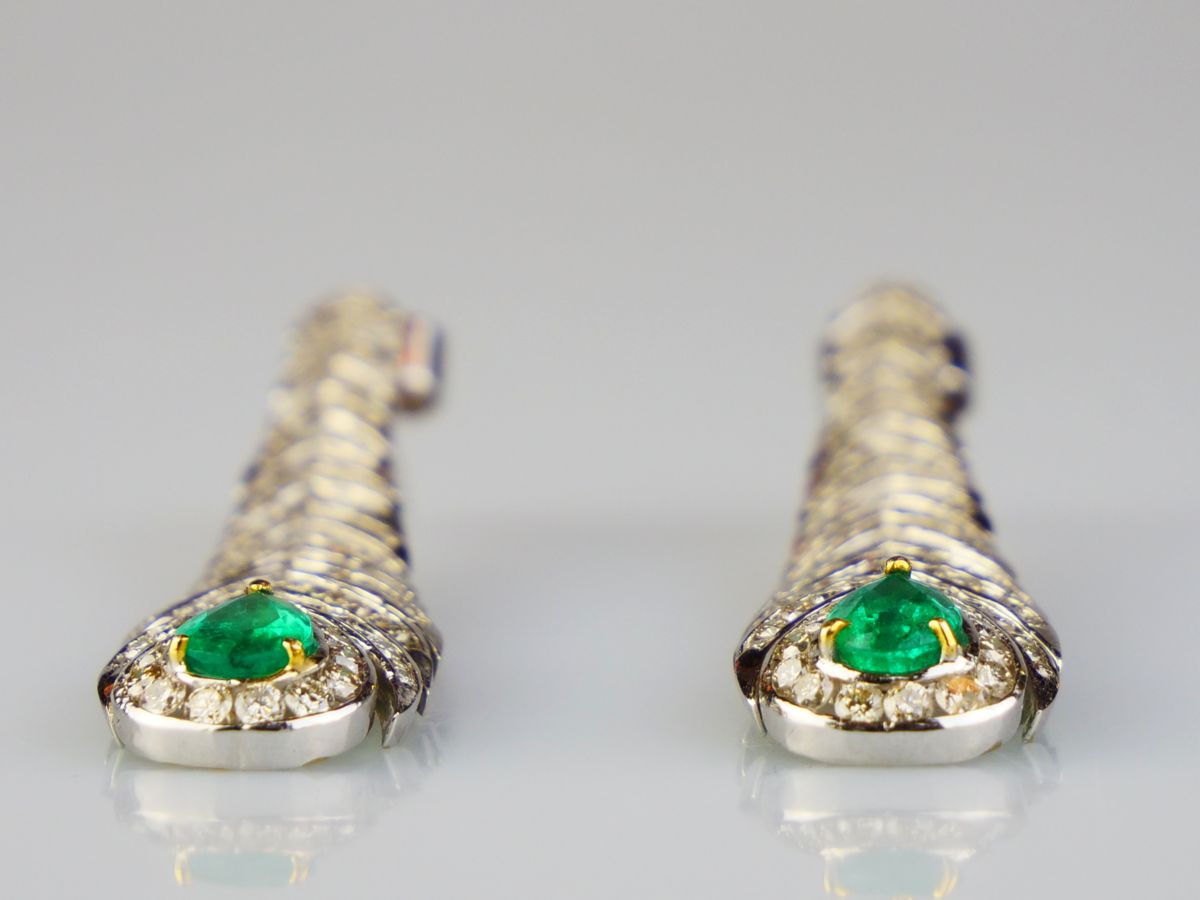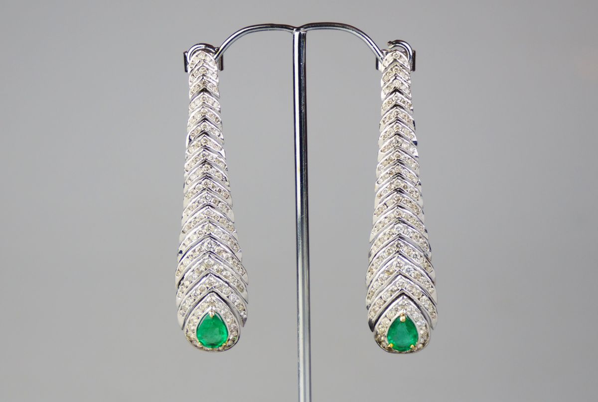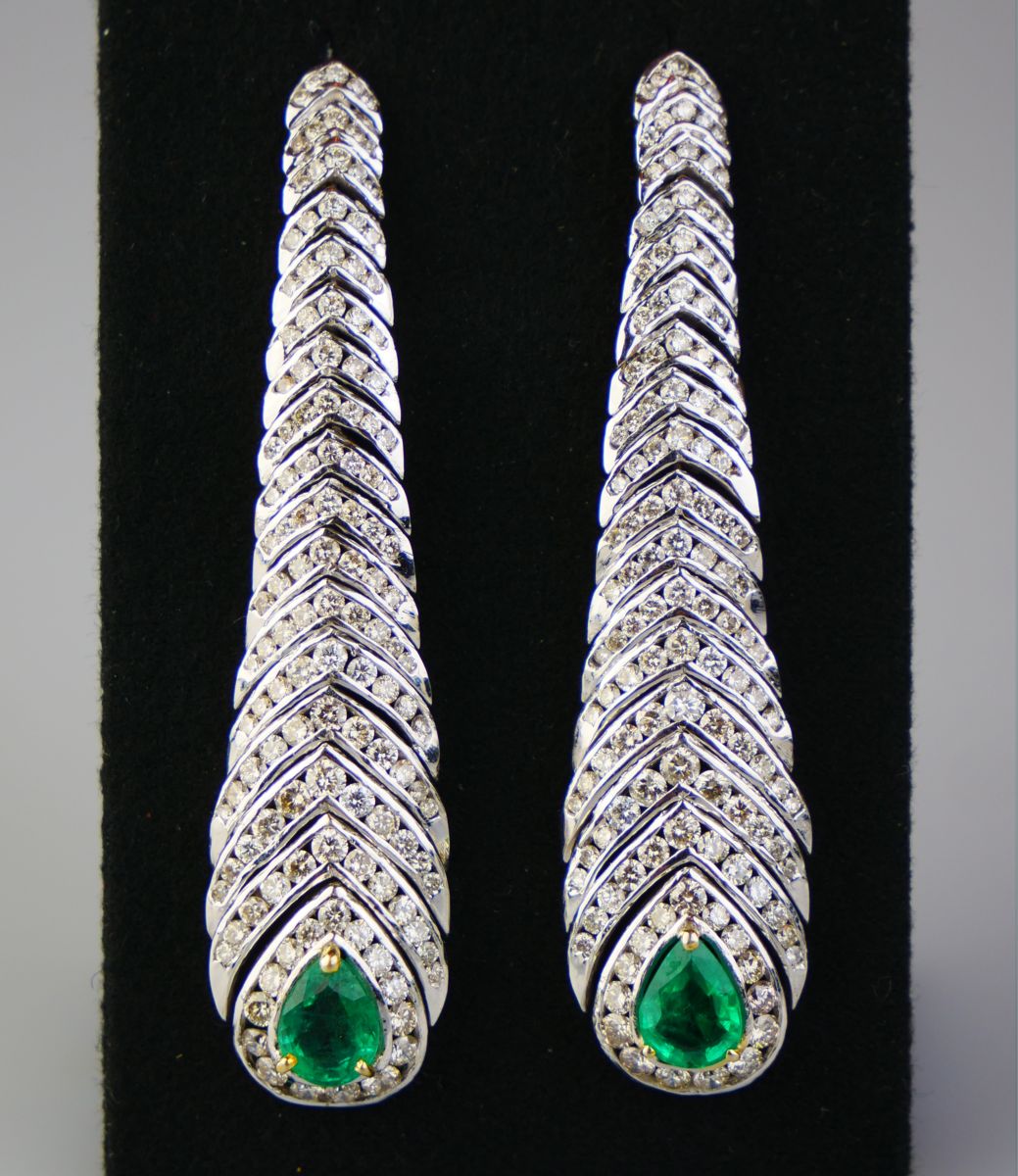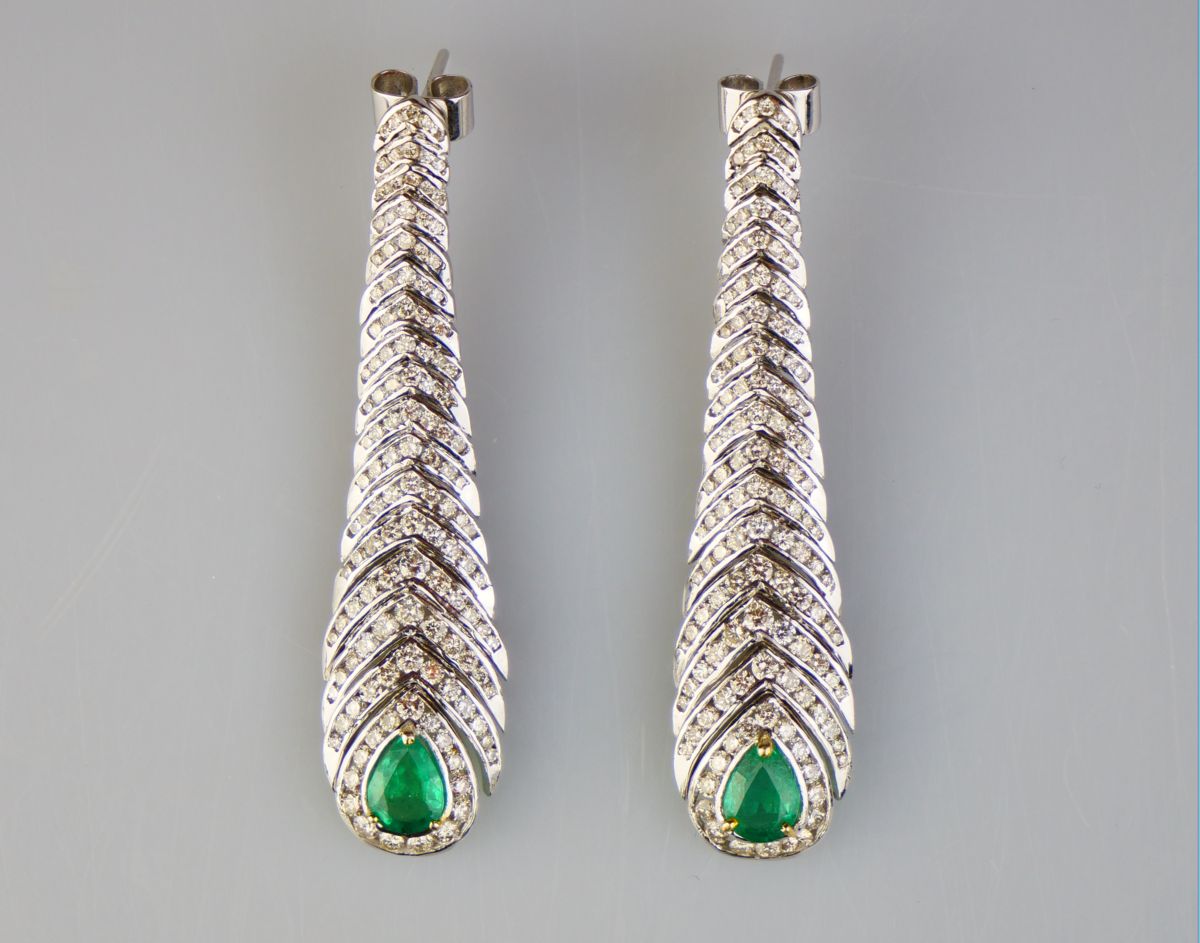 atraktivní dlouhé náušnice z bílého zlata ve stylizaci pavích per, smaragdy o celkové hmotnosti cca 1,7 ct a 250 diamantů briliantového brusu o celkové hmotnosti cca 4,28 ct, Au 17,80 g/585/1000, západní Evropa, kolem r. 1990; atest Puncovního úřadu, znalecký posudek, délka 6 cm