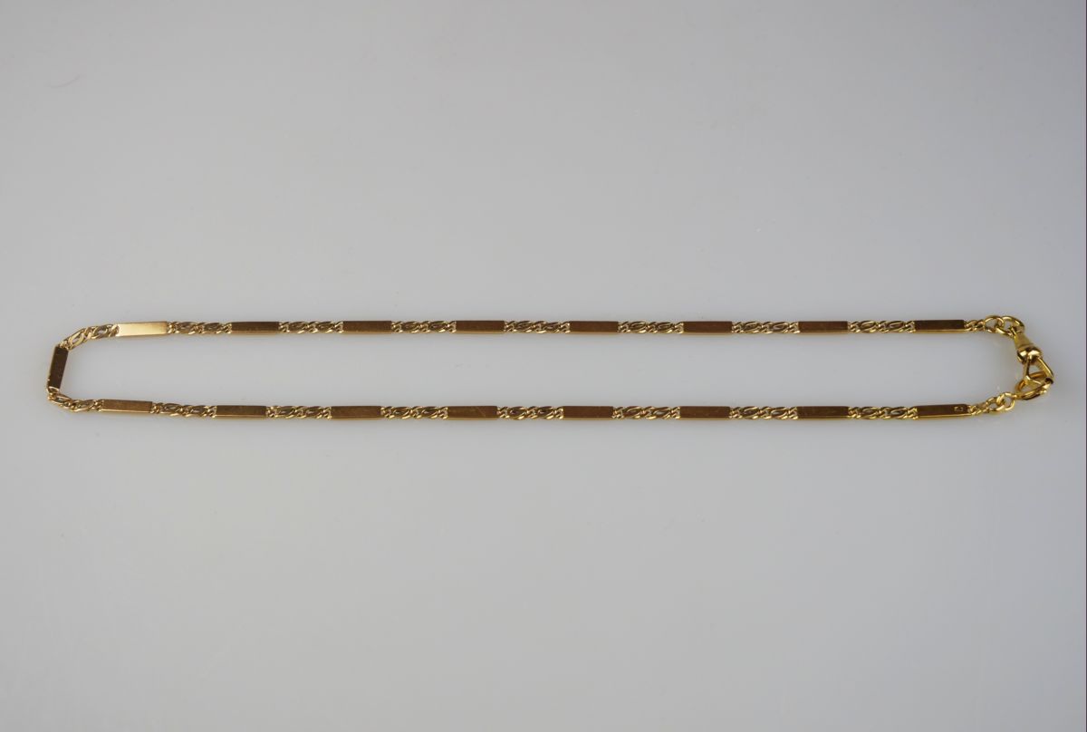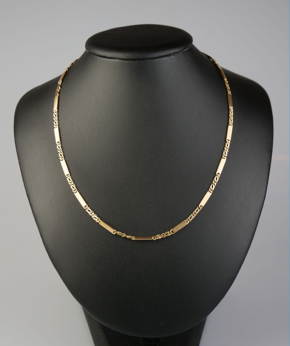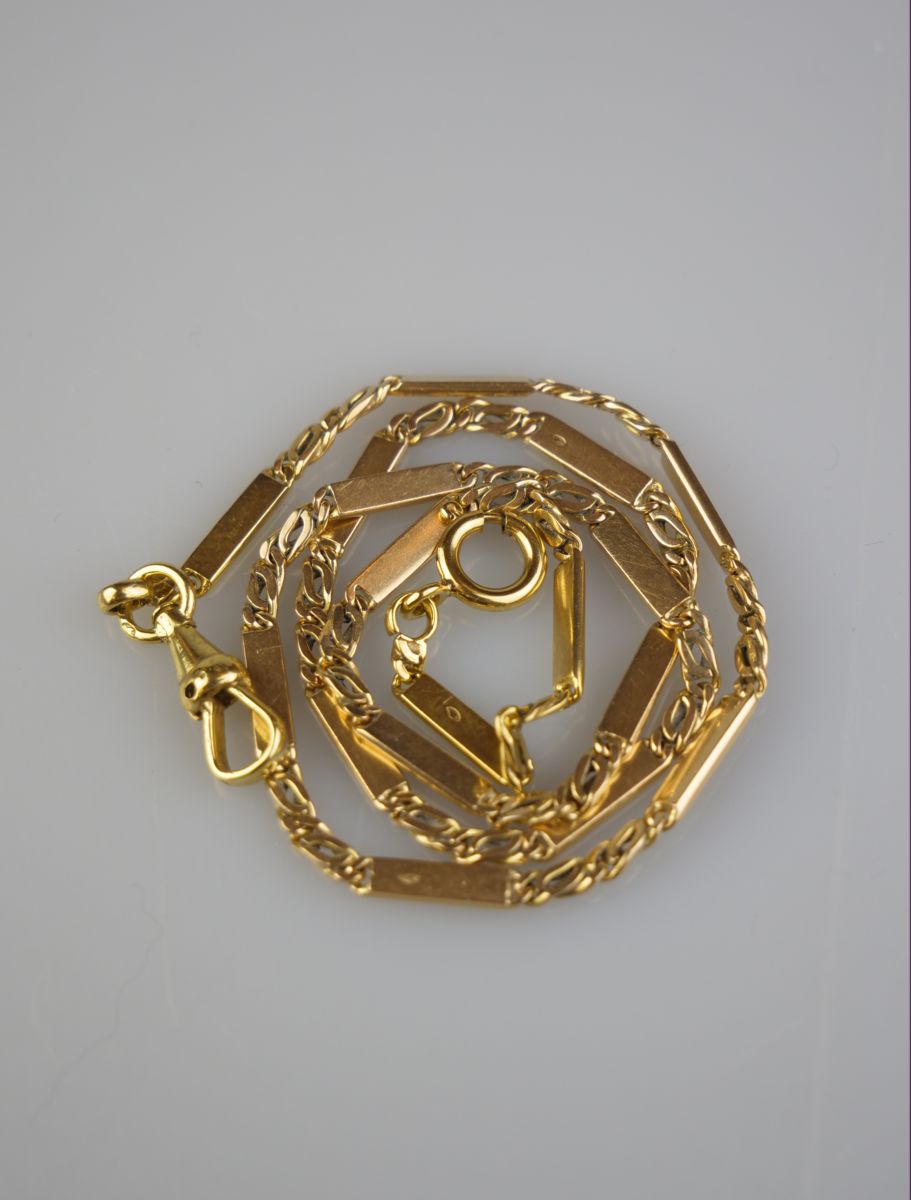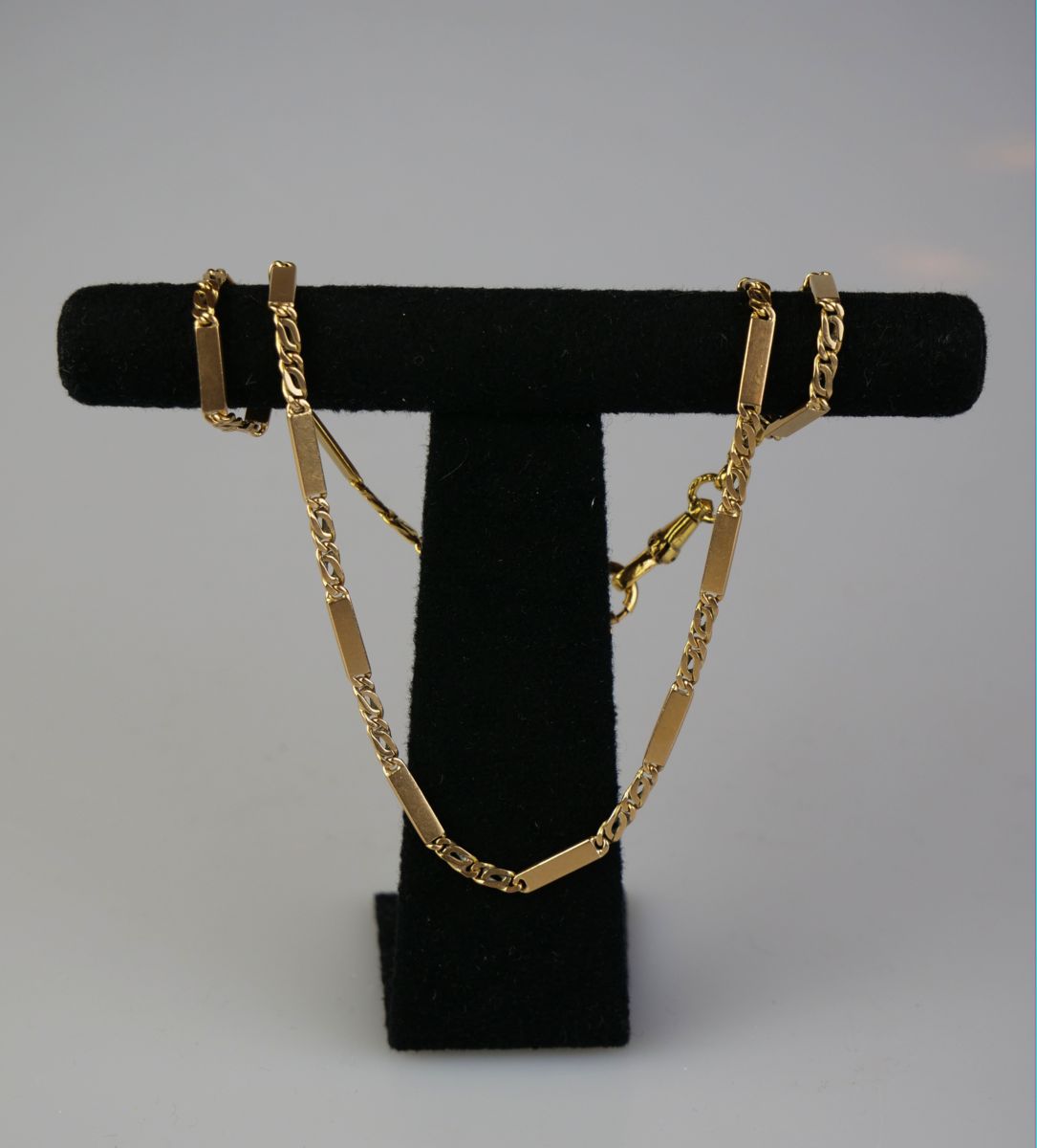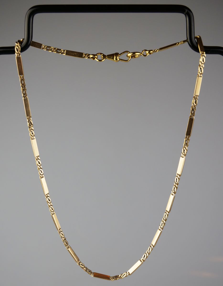 zlatý řetěz z plochých článků spojených esovitými řetízky, Au 13,56 g/580/1000, Československo, kolem r. 1925, dobová puncovní značka (stará čejka); délka 40,5 cm