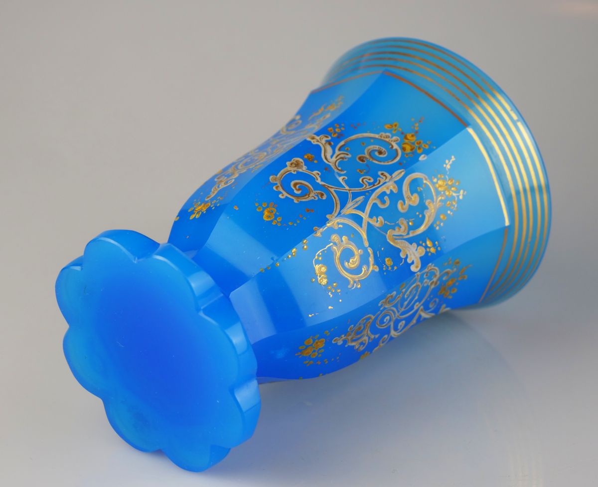 sklenice z modrého kostního alabastrového skla z období biedermeieru, fasetově broušená do osmistěnu, malba rozvilin okrovým a bílým emailem, zlacené linky, Čechy, kolem r. 1850; výška 13,5 cm; v pěkném zachovalém stavu