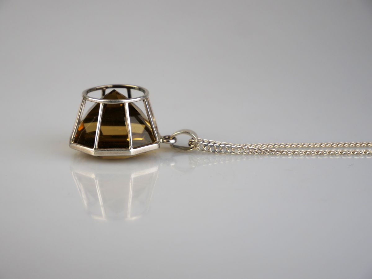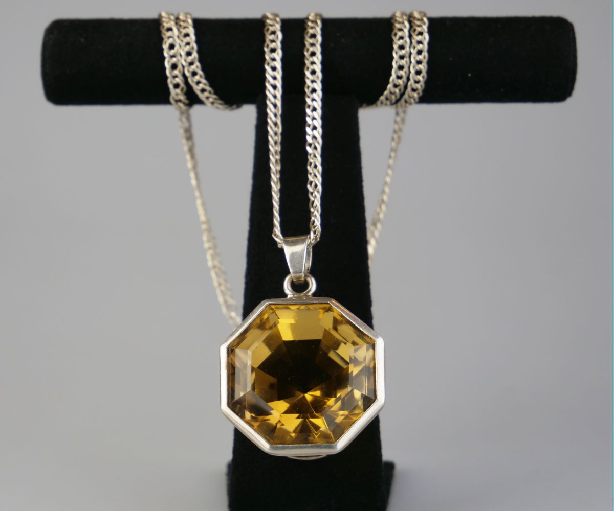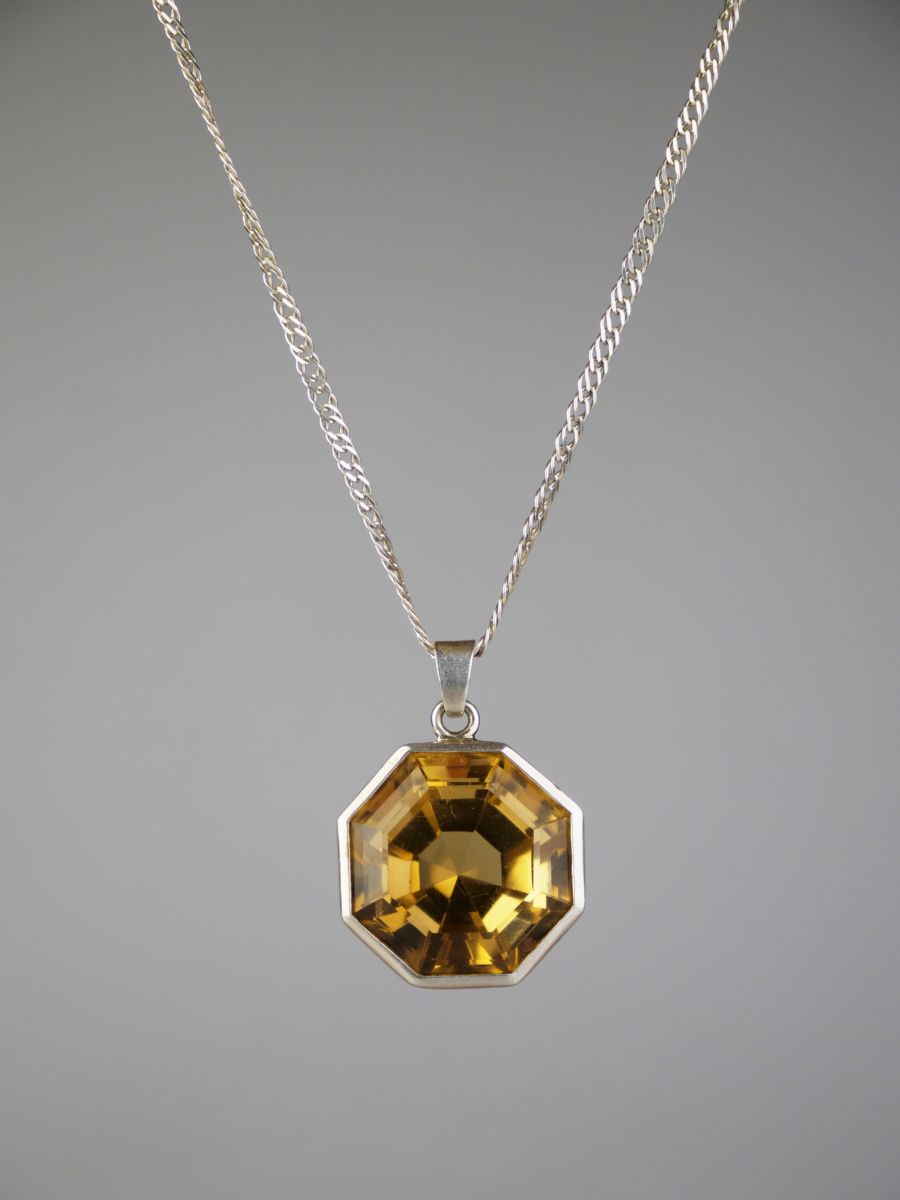 stříbrný závěs s velkým citrínem a stříbrným řetízkem, Ag 28,30 g/925/1000, západní Evropa, kolem r. 1995, dobový český punc (kamzík); průměr závěsu 3 cm, délka řetízu 50 cm