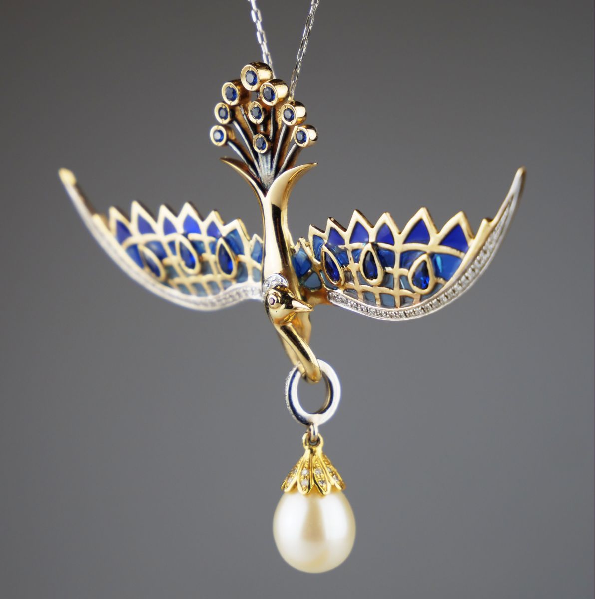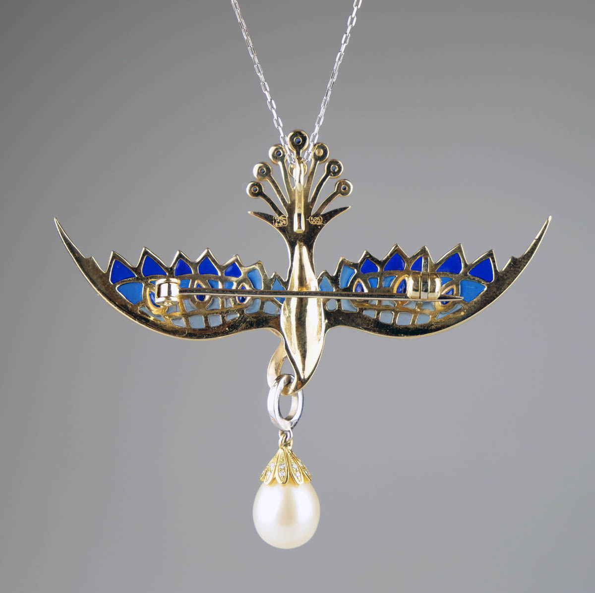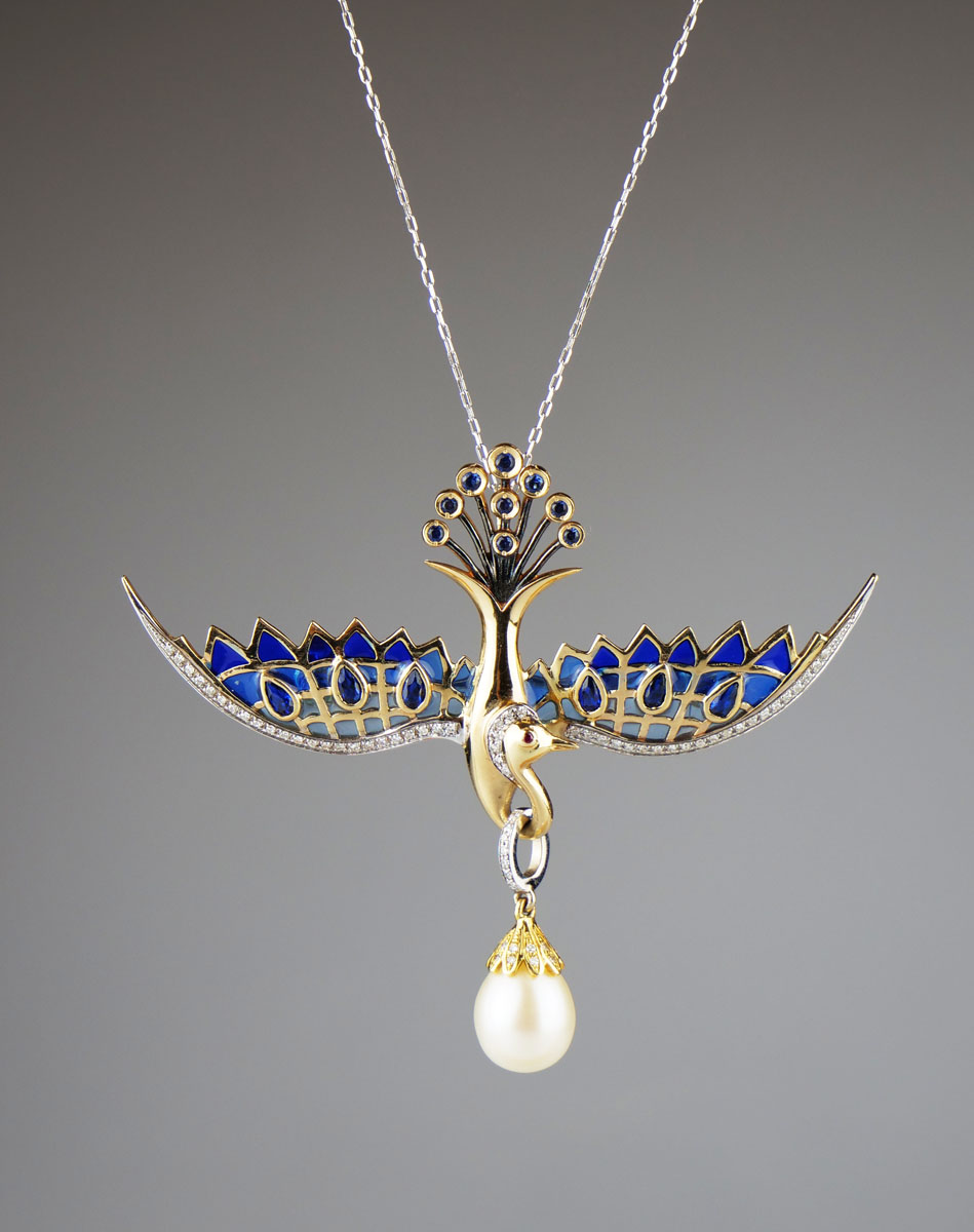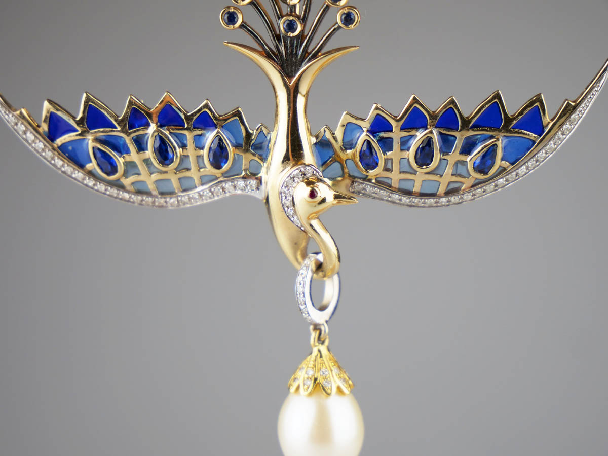 zlatý závěs (zároveň i brož) ve tvaru letícího fantaskního ptáka s 80 drobnými diamanty briliantového brusu o celkové hmotnosti cca 1,2 ct, s 15 modrými safíry a s velkou kultivovanou perlou vejčitého tvaru, křídla zdobená modrým okénkovým emailem, Au btto 13,17 g/585/1000, východní Evropa, kolem r. 1995, současný český punc (labuť); rozměry závěsu 5,5 x 7 cm, délka řetízku 44 cm