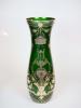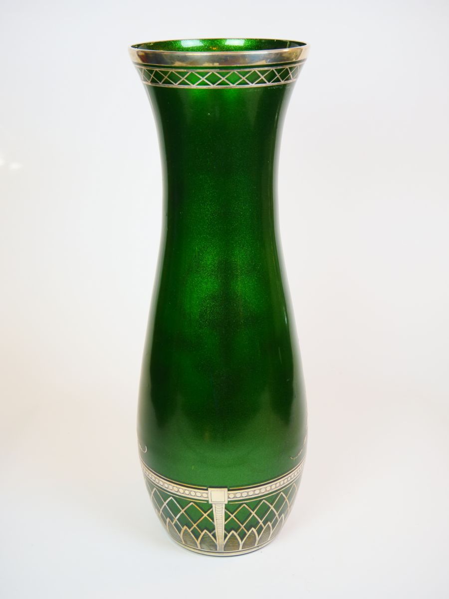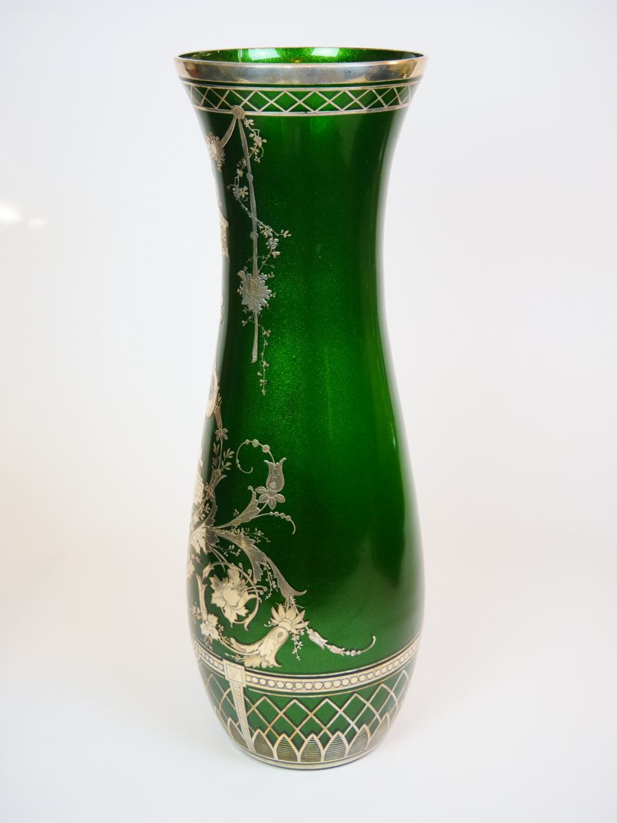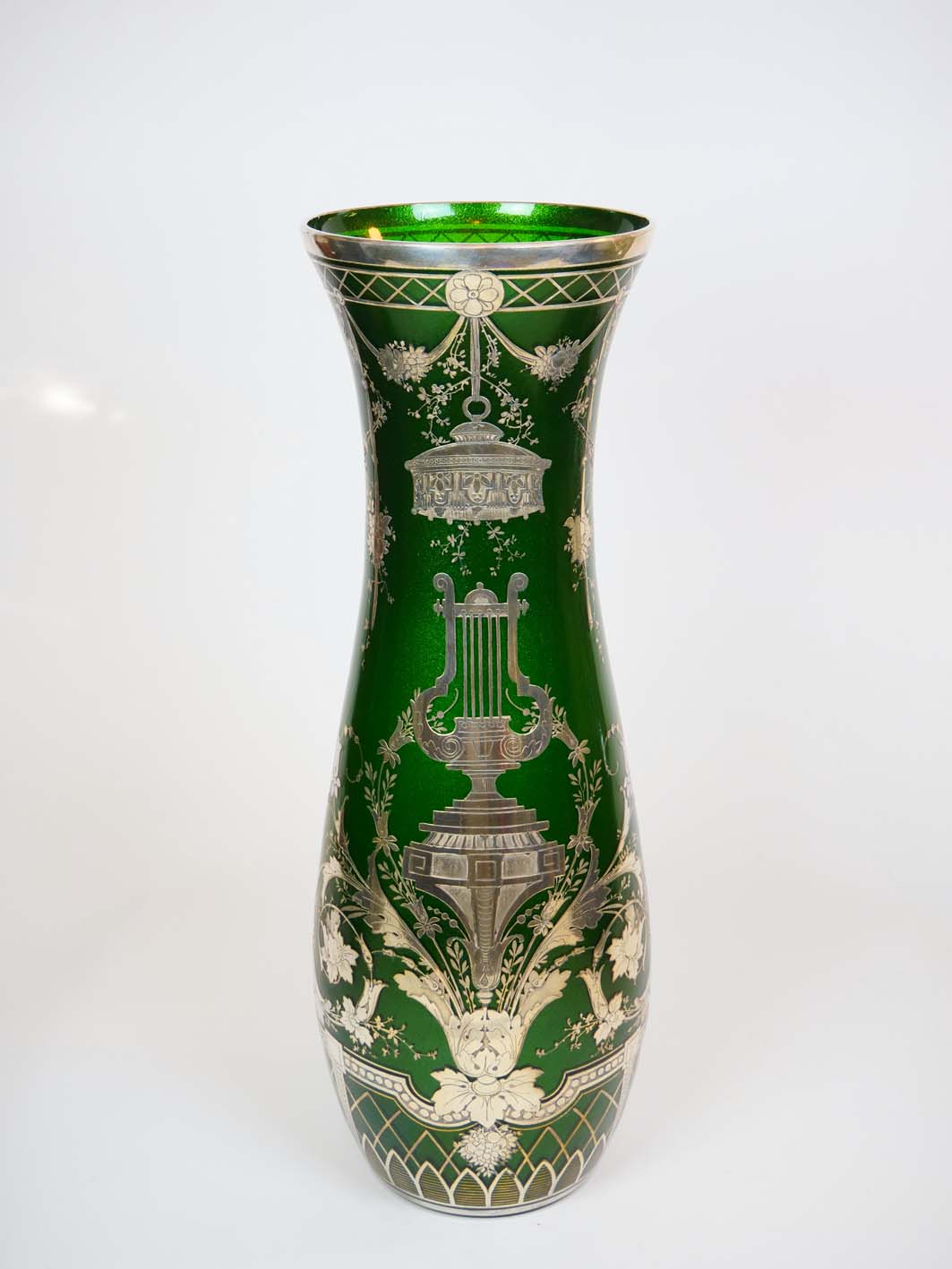 monumentální skleněná váza, bezbarvé sklo podjímané jiskřivým zeleným aventurinovým sklem, výrazný stříbrný ornamentální galvanicky provedený dekor s motivem lyry jako symbolem hudby, poezie, umělecké inspirace, harmonie a vznešenosti., vyrobila česká sklárna Harrachov, kolem r. 1890, výška 63 cm; váza získala Cenu prezidenta Asociace starožitníků na 52. veletrhu ANTIQUE v dubnu 2025 v Praze, sběratelsky zajímavé