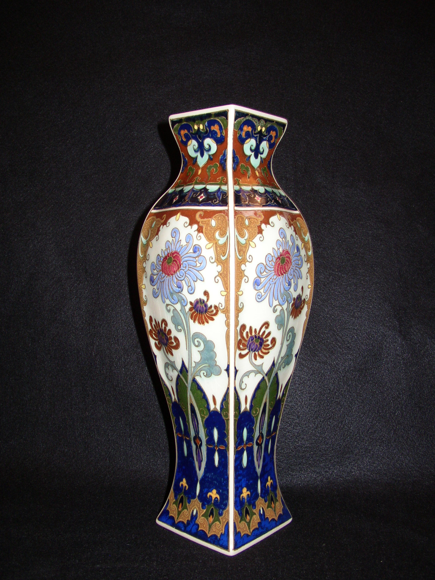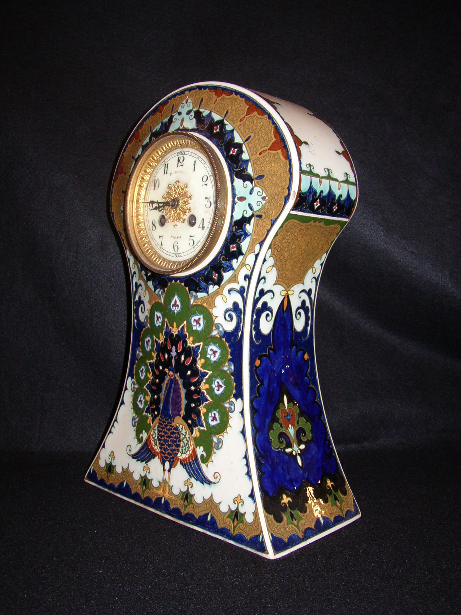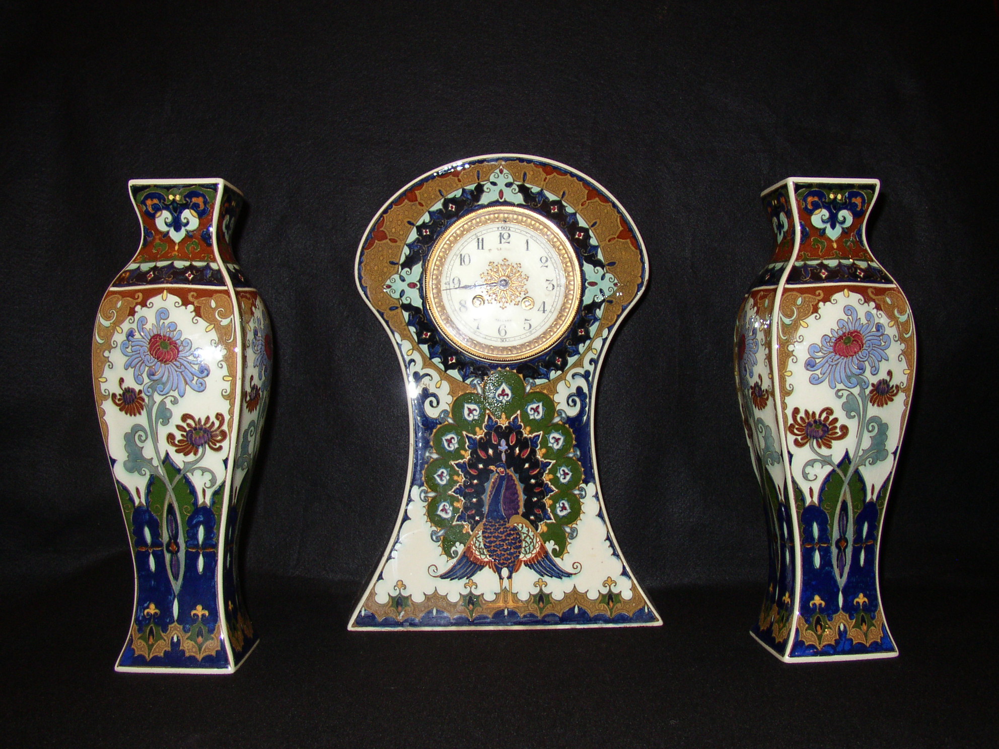 holandské secesní hodiny s párovými vázami, silnostěnný porcelán s asijským dekorem, značeno Rozenburg - Den Haag, výška hodin 37 cm, výška váz 33,5 cm