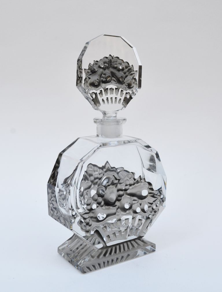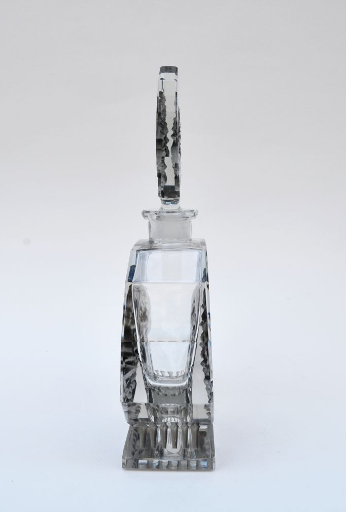 art deco likérová karafa, firma Bruno Posselt, Tanvald, lisované a broušené křišťálové sklo se stříkaným efektem; Československo, 1935; výška se zátkou 21,5 cm, bez zátky 13,5 cm, délka 11 cm, hloubka 4,5 cm