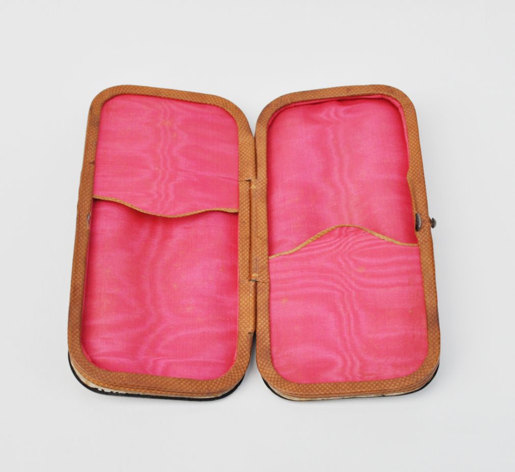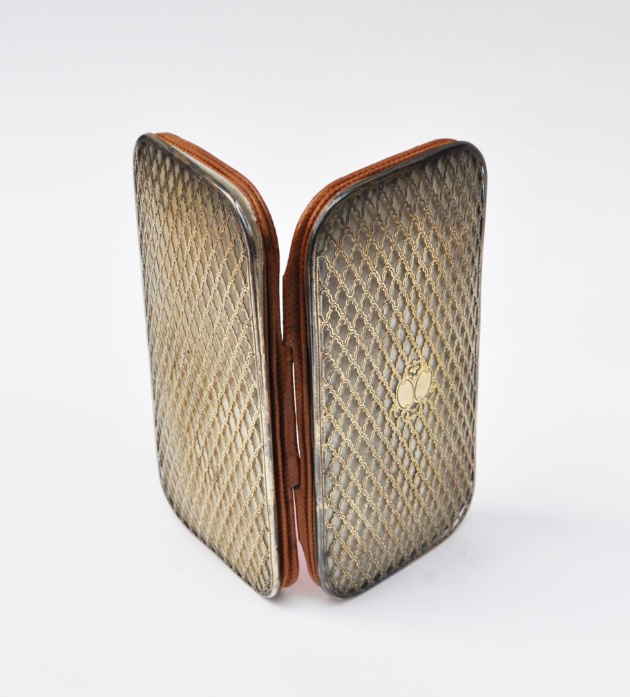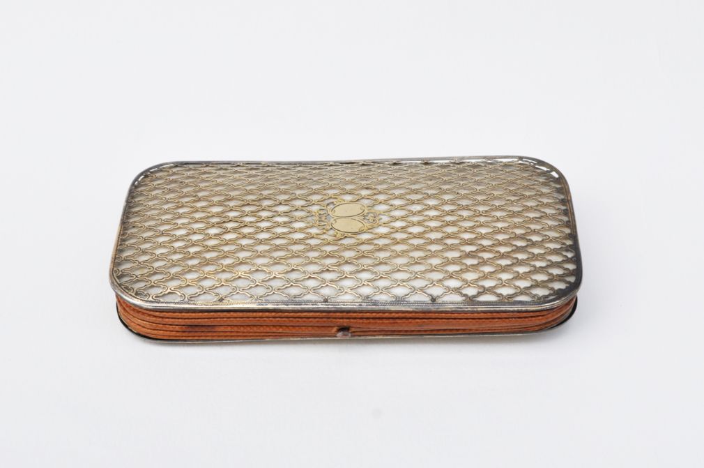 elegantní kožené pouzdro na lorňony s bohatě prolamovanou ozdobnou mřížkou, Ag btto 111,50g/800/000, kolem roku 1880, mřížka lehce odchlíplá (viz foto), střední Evropa; délka 14 cm, šířka 7 cm, hloubka 2 cm