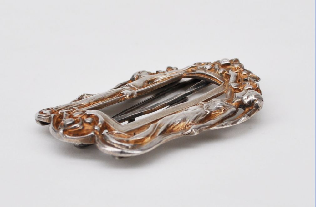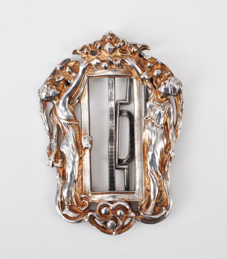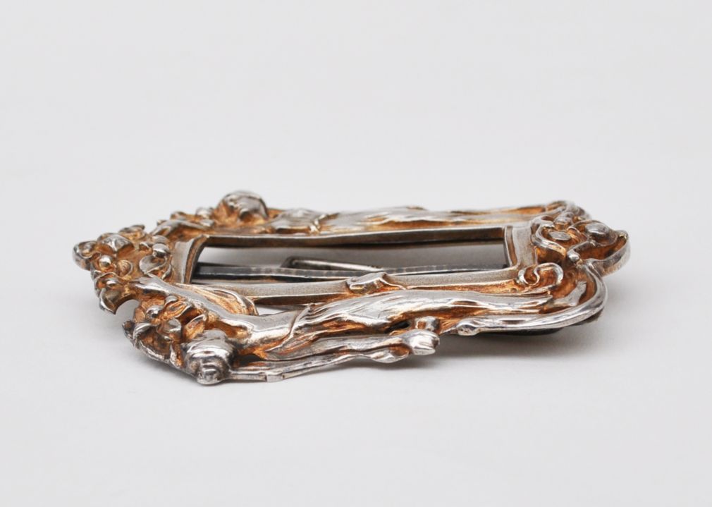 velká secesní stříbrná spona k textilnímu opasku, použitelná na šátek nebo šál, výrazně plasticky zdobená, kvalitní stříbrnická práce, Ag 36,55g/800/000, kolem roku 1900, západní Evropa; atest Puncovního úřadu; délka 7,5 cm, šířka 5,5 cm