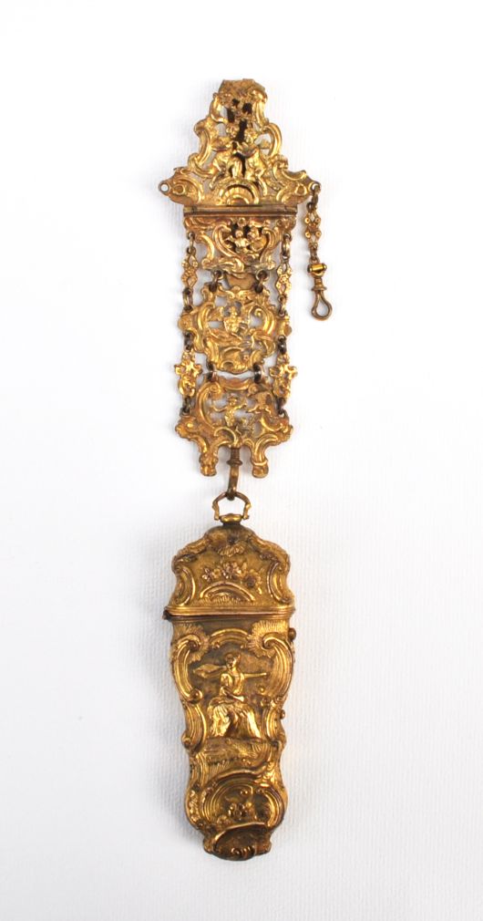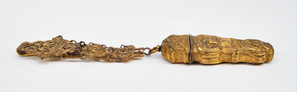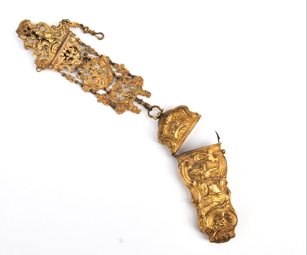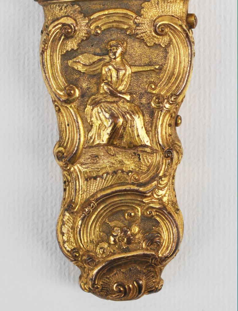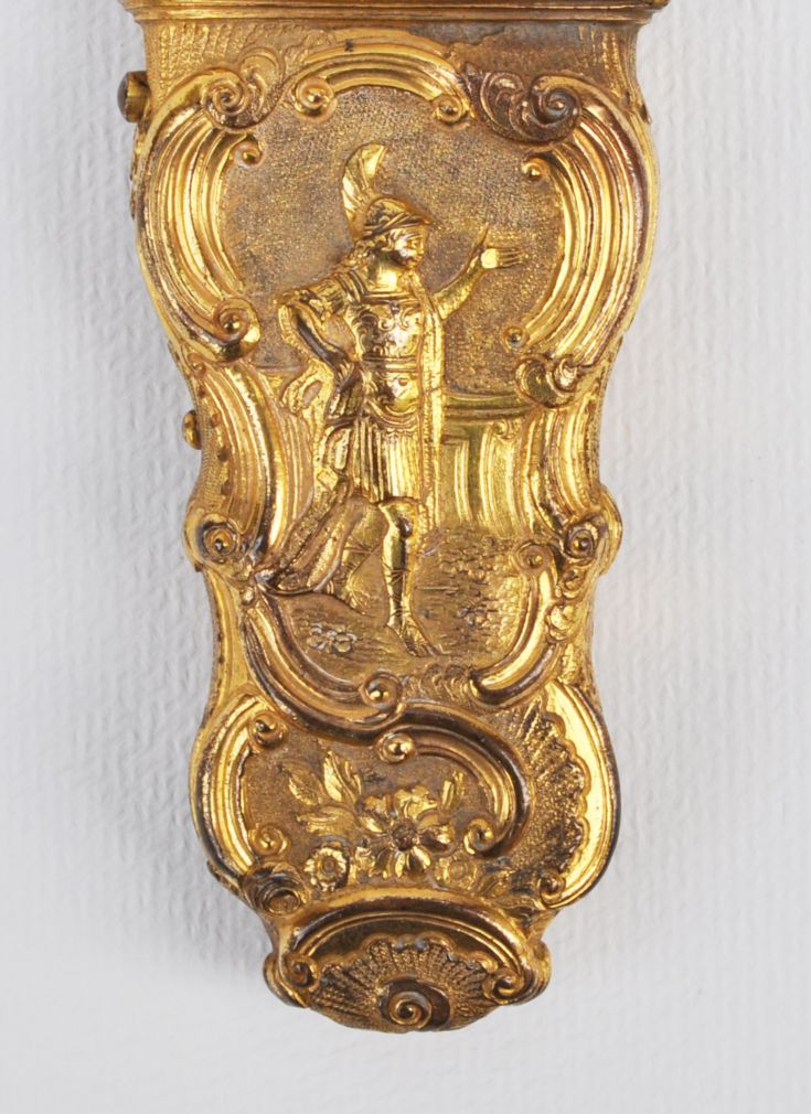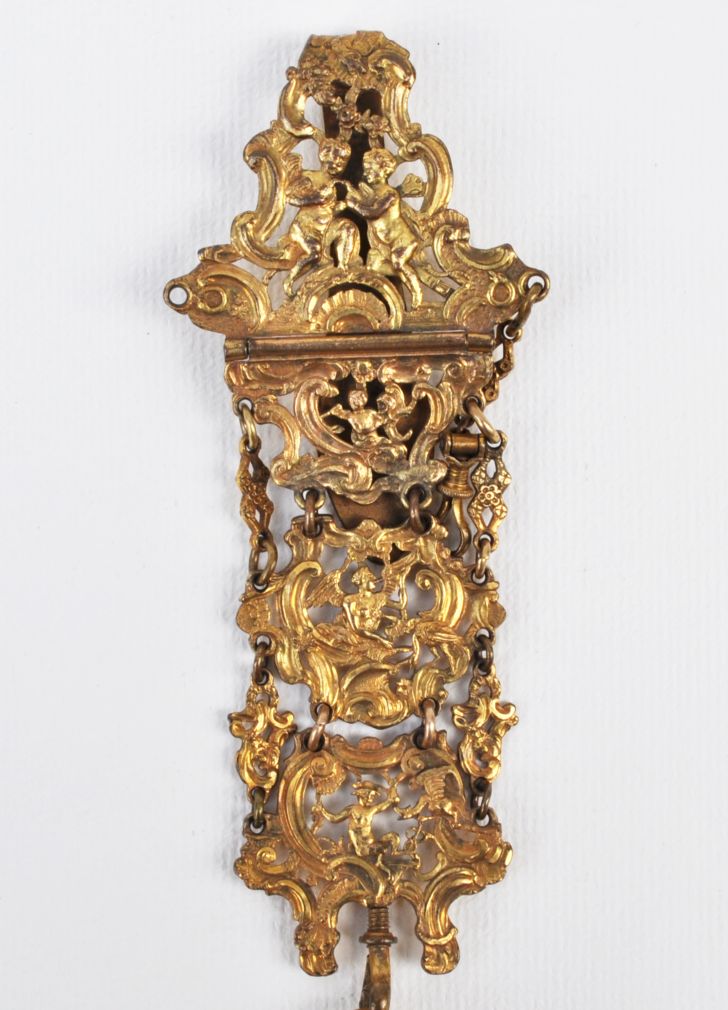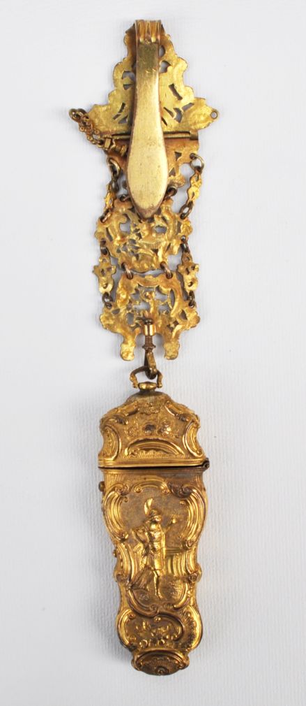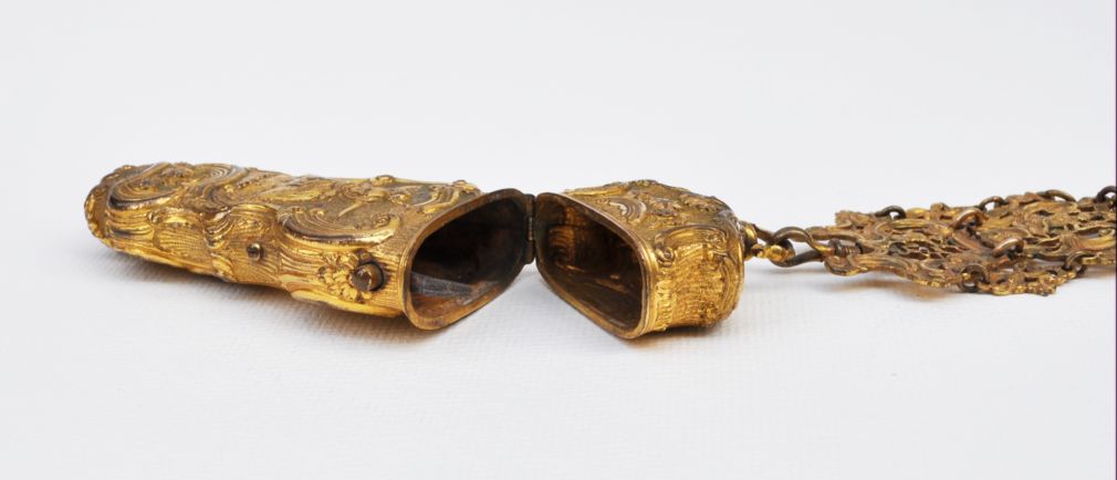 rokokový necesér ze zlaceného tepaného mosazného plechu, bohatě zdobený reliéfy s amorky, antikizujícími postavami a kartušemi, střední Evropa, kolem roku 1760; délka 25 cm, v původním stavu, chybí jeden ověsek; objekt muzeální hodnoty