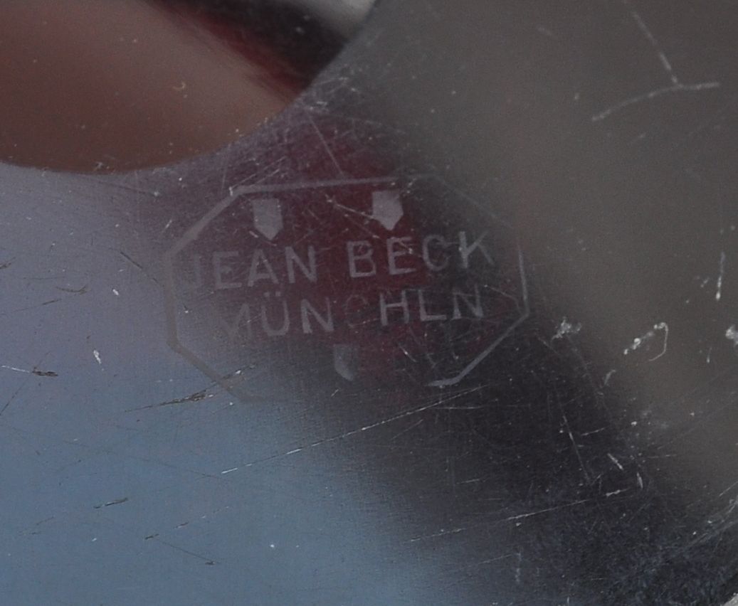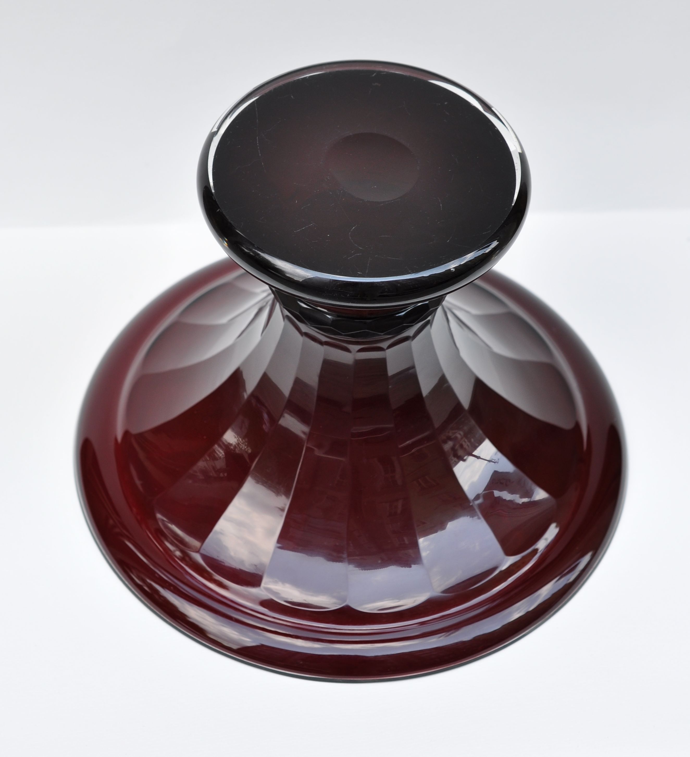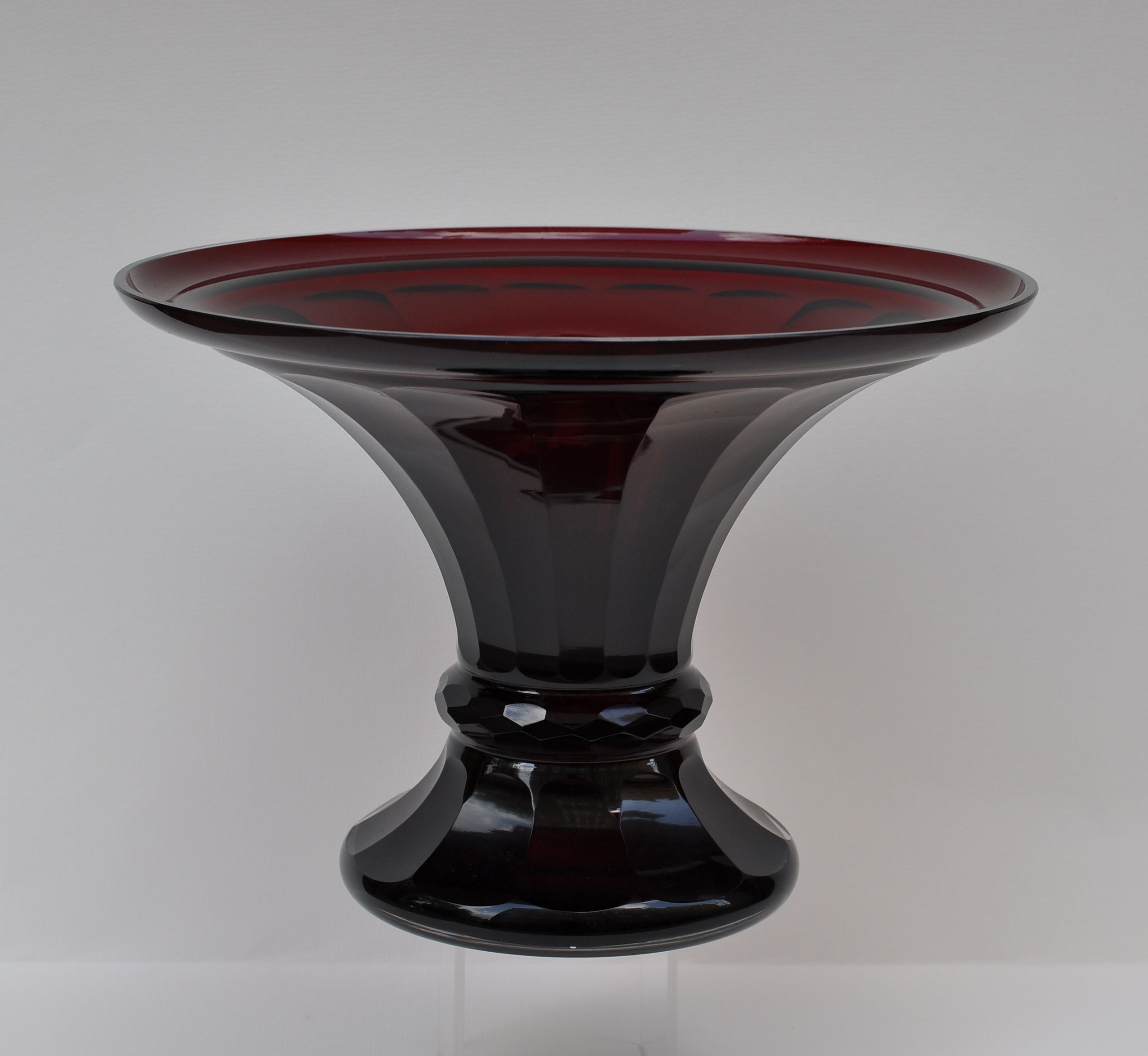 art deco váza z čirého broušeného skla podjímaného sklem granátově červeným, značeno Jean Beck - Mnichov; Šířka 25 cm, Výška 17,2 cm; kolem roku 1925