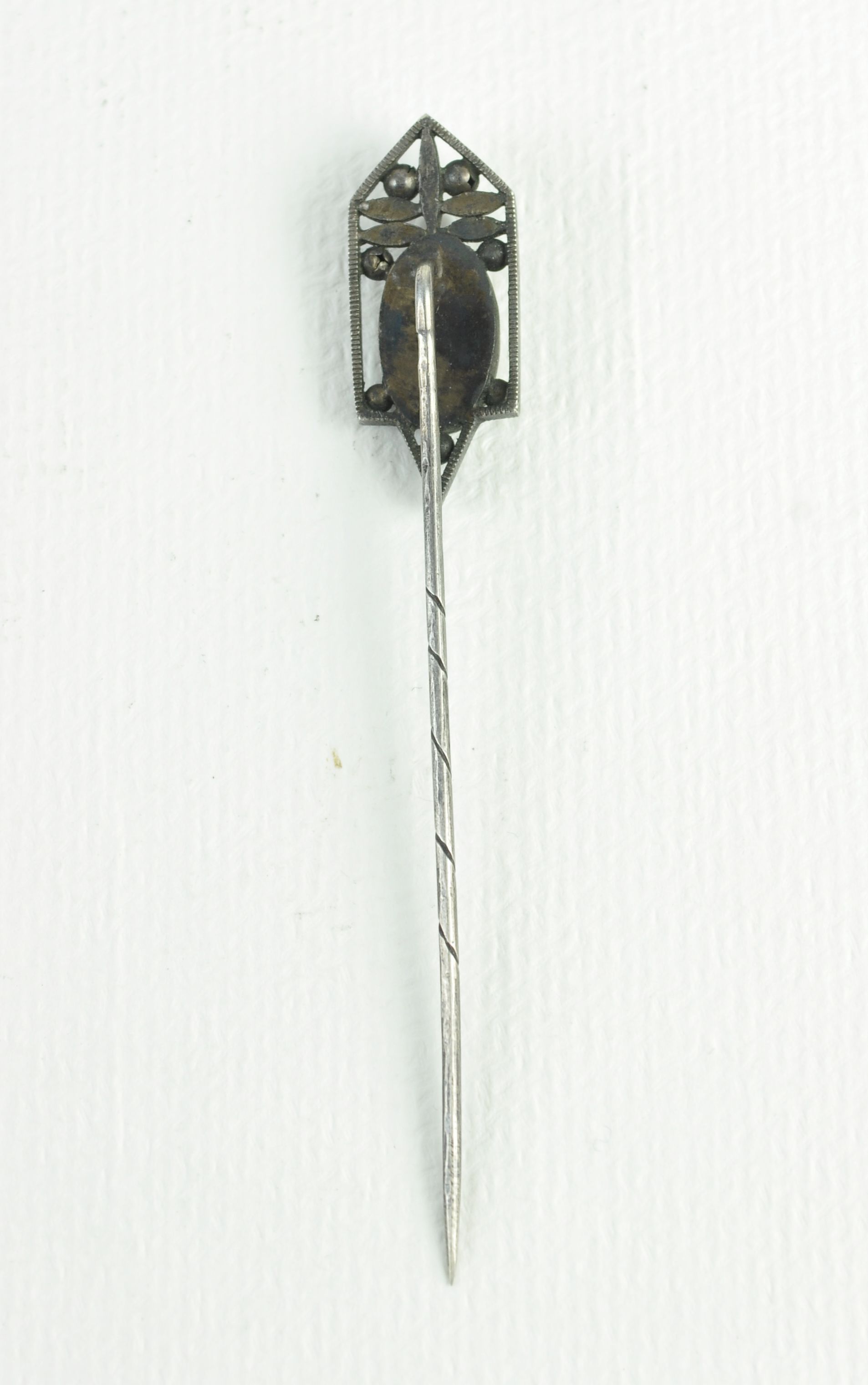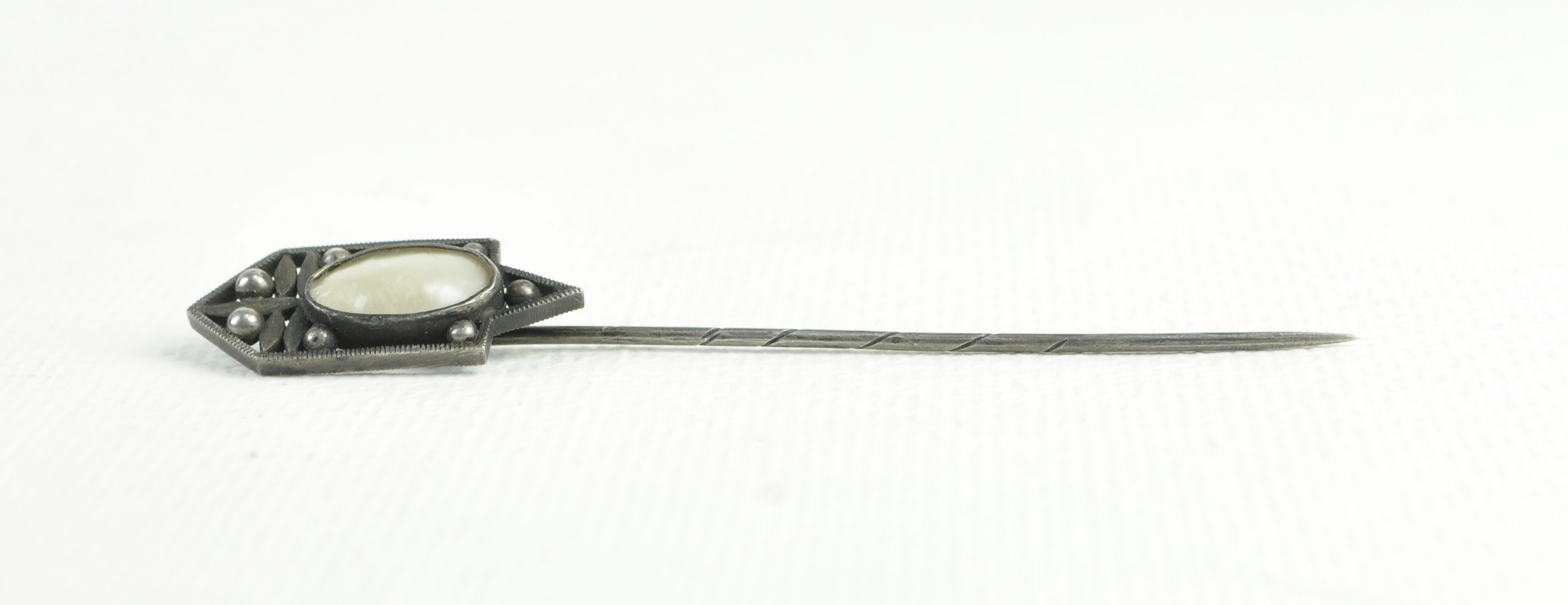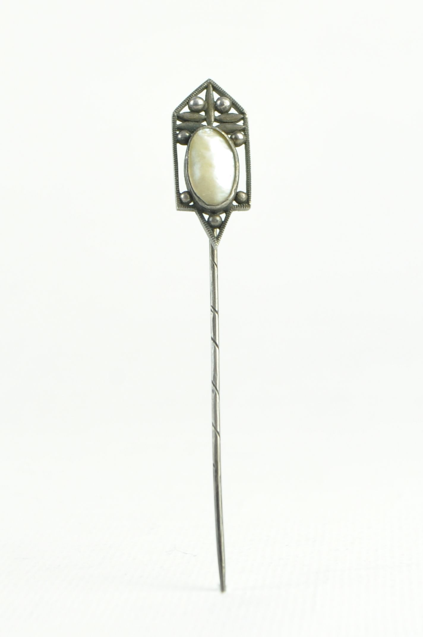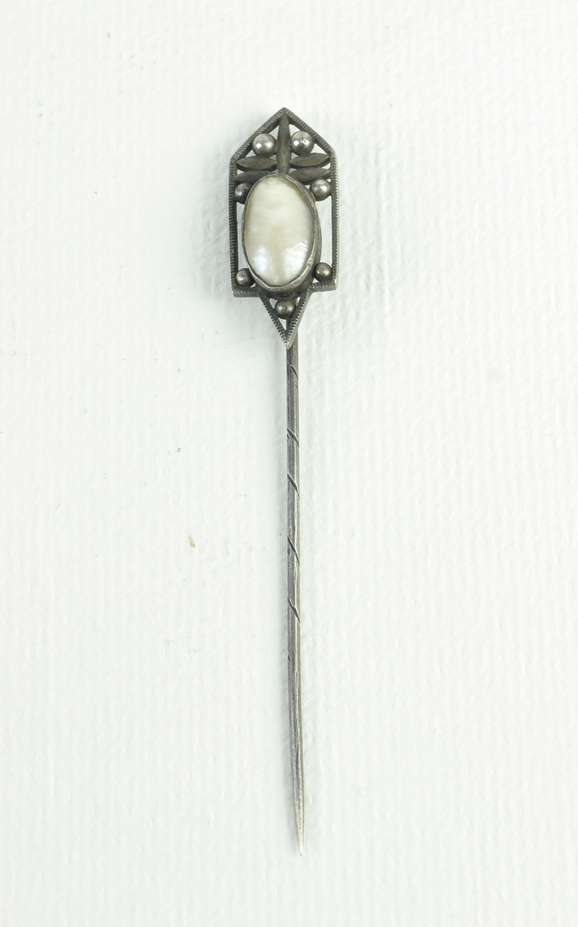 stříbrná secesní jehlice s perletí, Ag btto 2,90g/800/000, podle návrhu Marie Křivánkové zhotovil zlatník Antonín Pešula, značeno mistrovskou značkou, kolem r. 1910; délka 8 cm, šířka 1,1 cm; atest Puncovního úřadu; sběratelsky zajímavý šperk