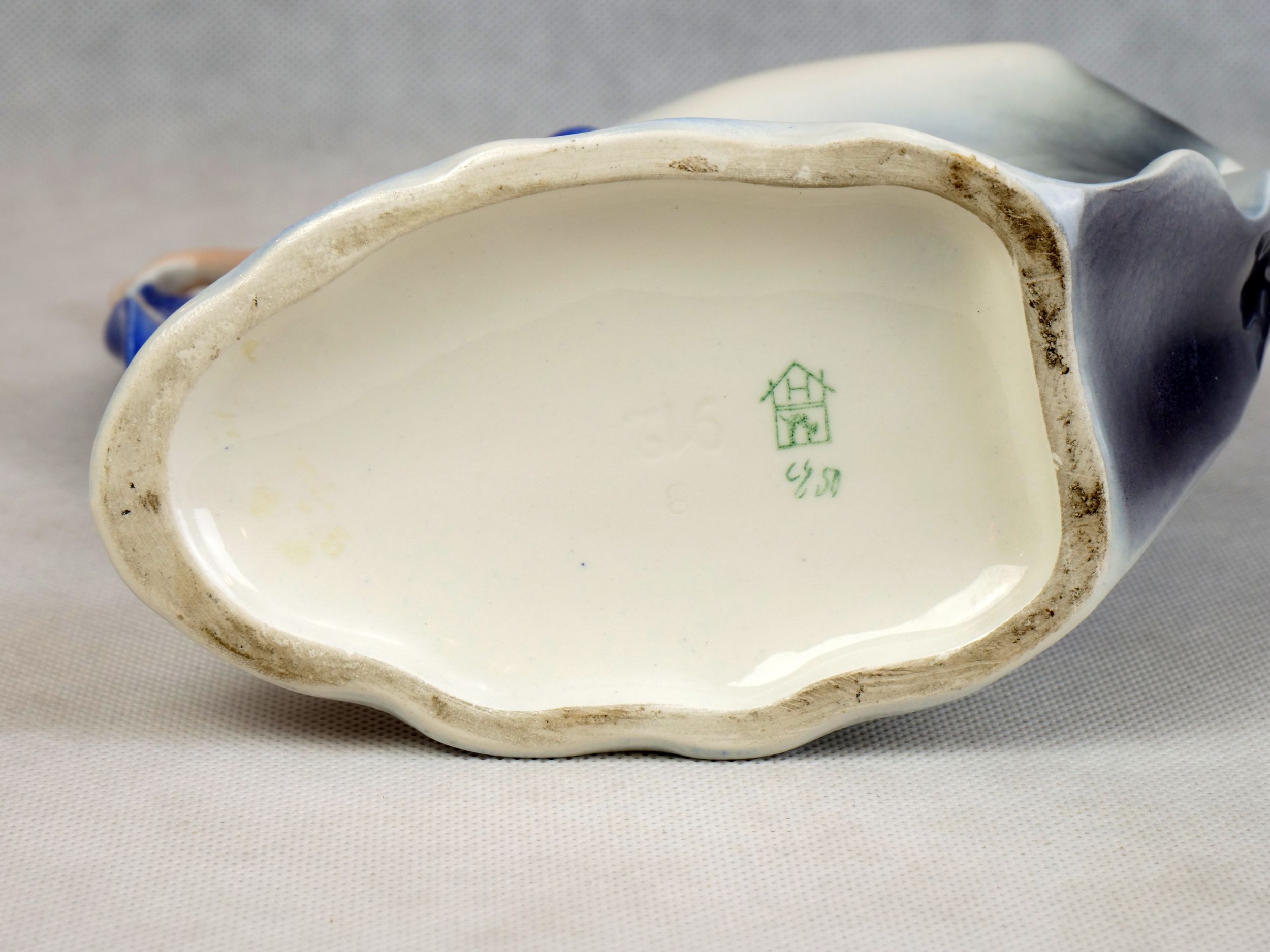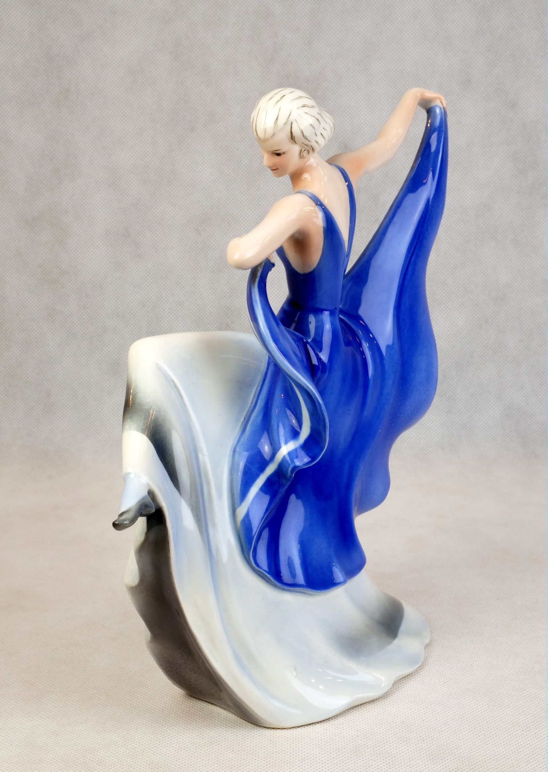 soška tančící dívky, barevná tvrdá kamenina, kolem roku 1930 vyrobila továrna Porzellanfabrik Hertwig & Co. v durynském Katzhütte, výška 25,5 cm