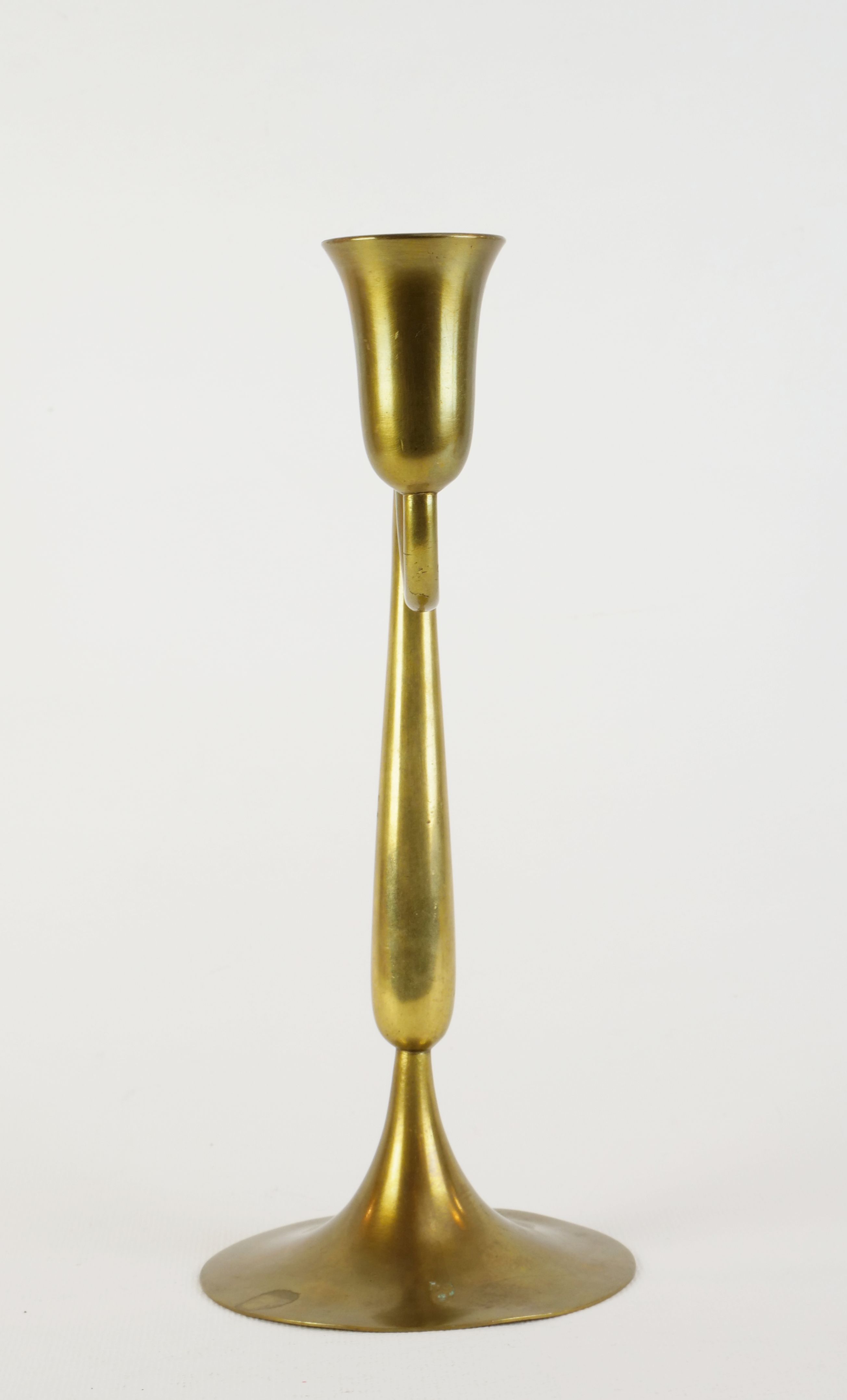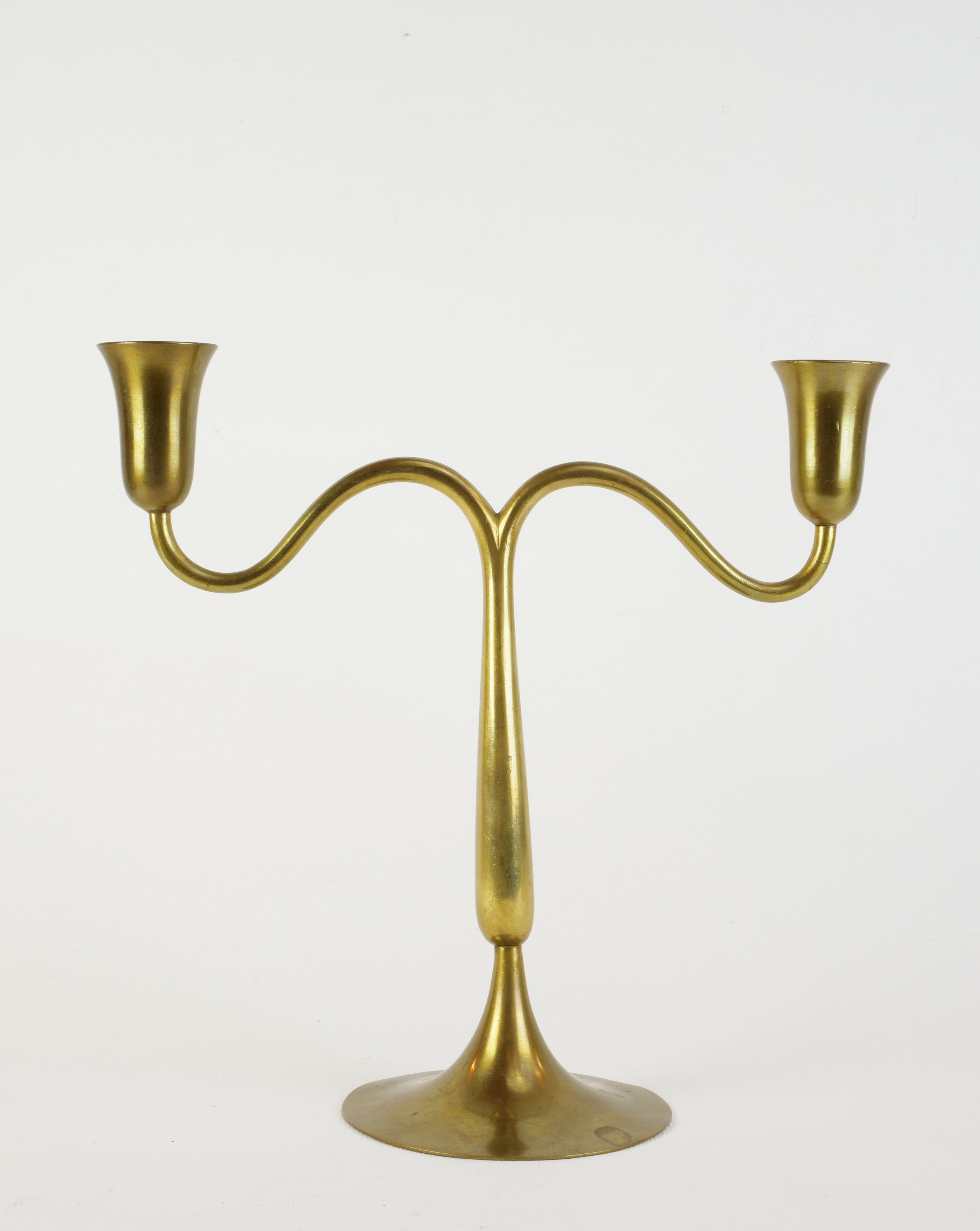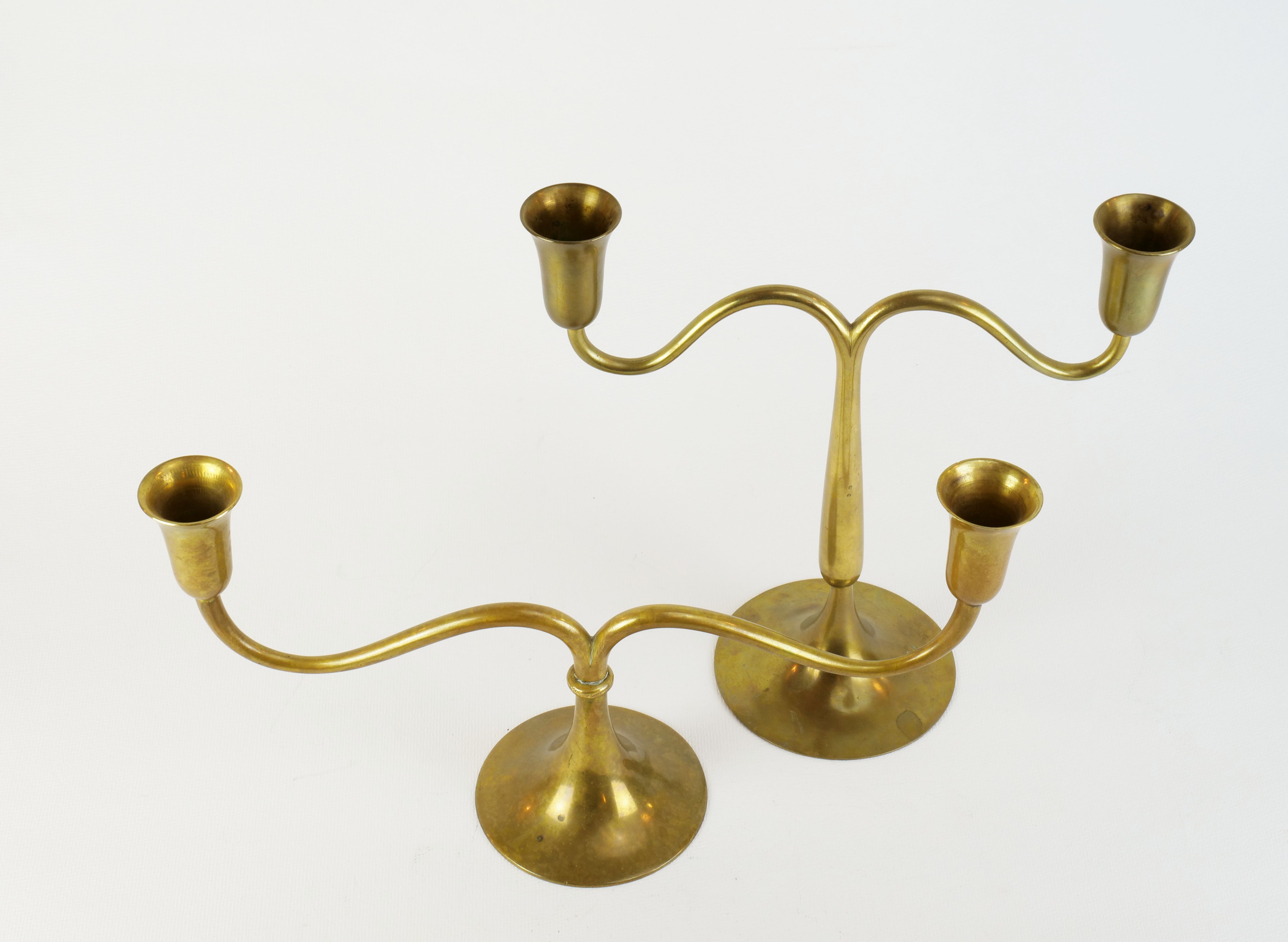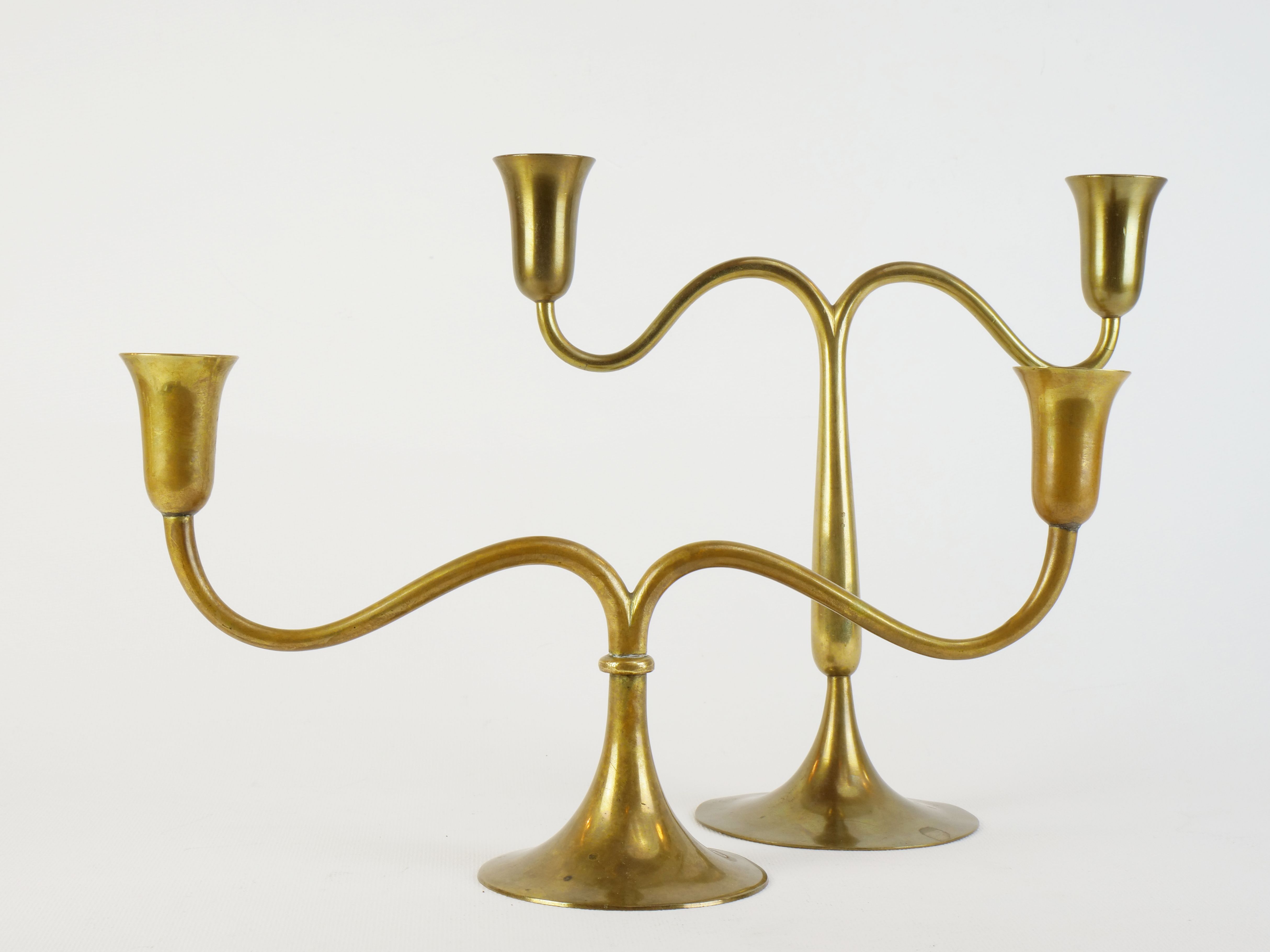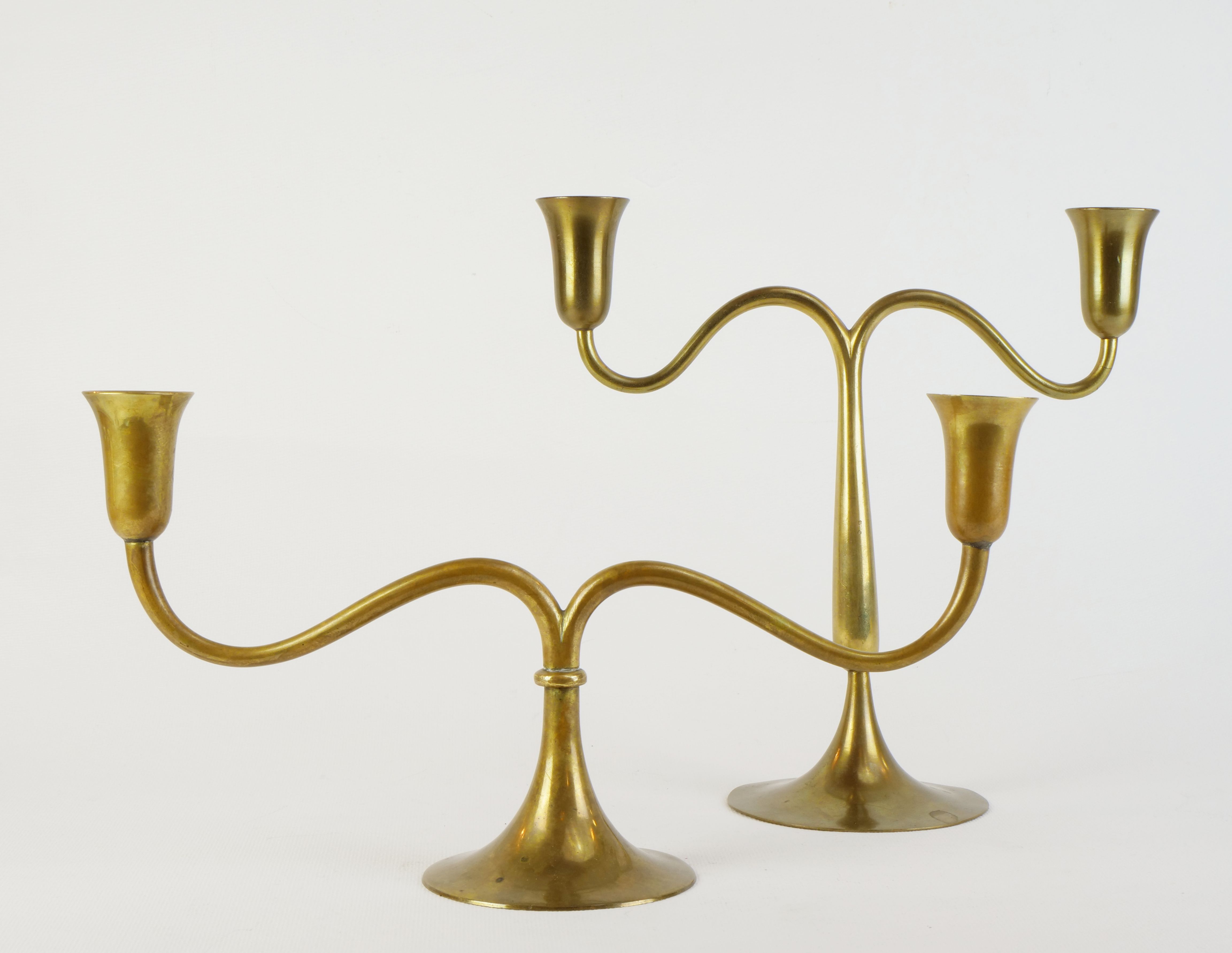 dva dvouplamenné mosazné svícny o různé výšce, dílny Hagenauer, Rakousko - Vídeň, kolem r. 1935, značeno dílenskými značkami; výška 22 cm/15,6 cm, šířka 22,6 cm/30,2 cm; cena za pár