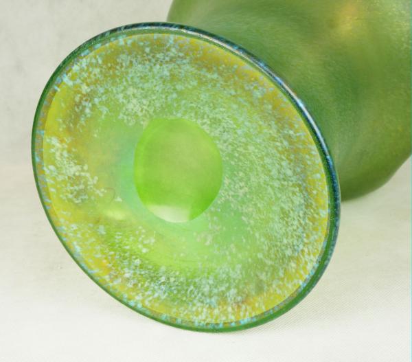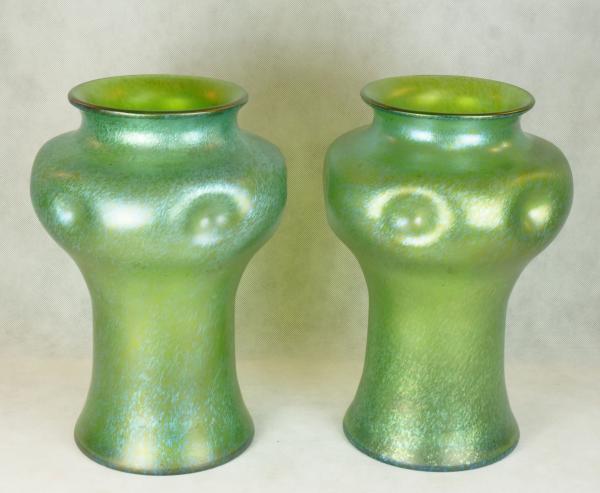 dvojice mohutných secesních váz šumavské sklárny Loetz z Klášterského Mlýna, promačkávané irisované sklo, dekor Delphi, kolem roku 1910; výška 32,5 cm, průměr hrdla 15 cm