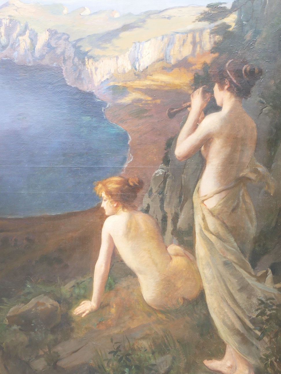 reprezentativní obraz s romantickým antickým námětem, dvě ”vestálky” na skalisku na pobřeží Středozemního moře, kolem r. 1890, signováno nečitelně; rozměr plátna 130x110 cm, vnější rozměr rámu 150 x 130 cm; odborně ošetřeno