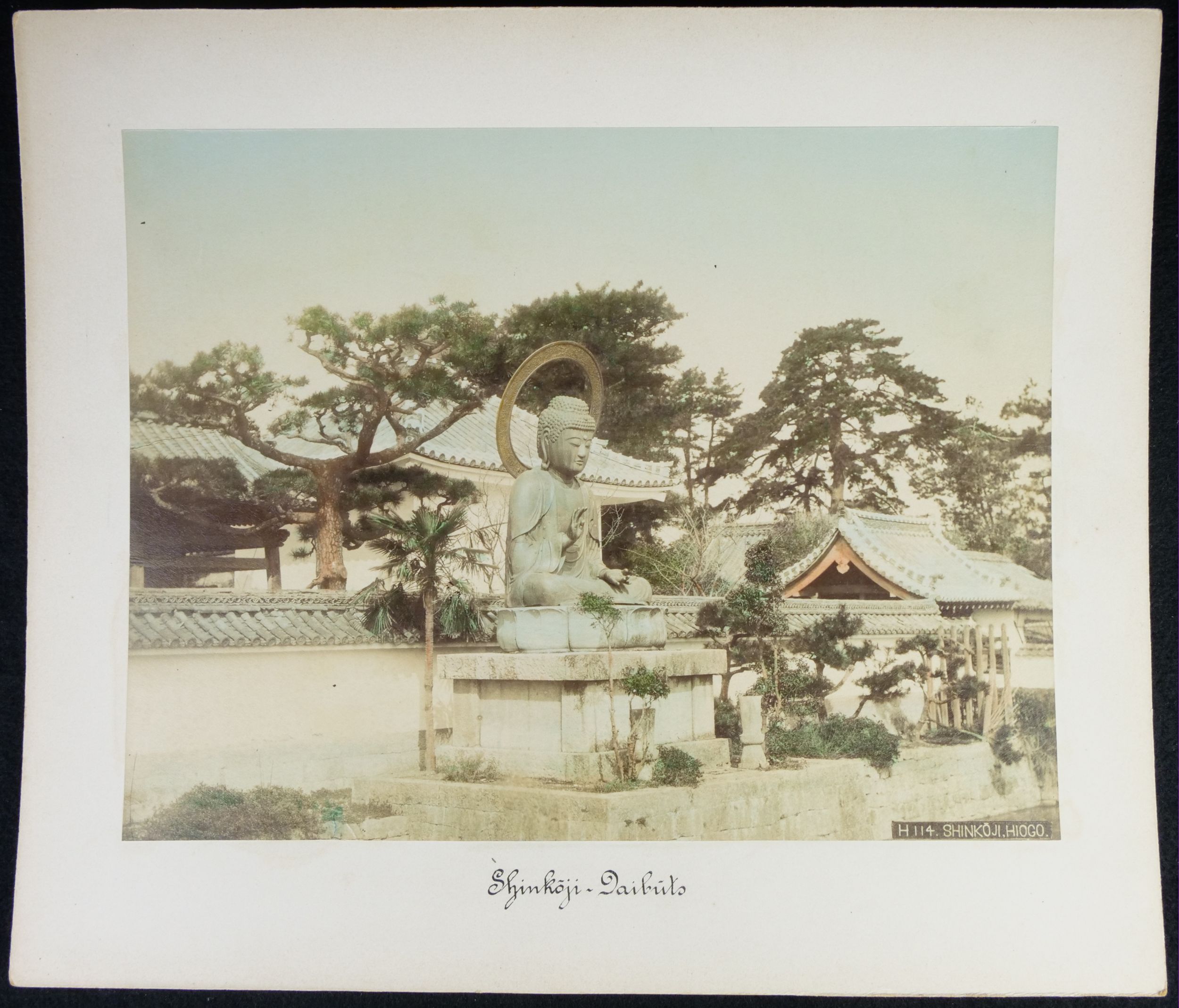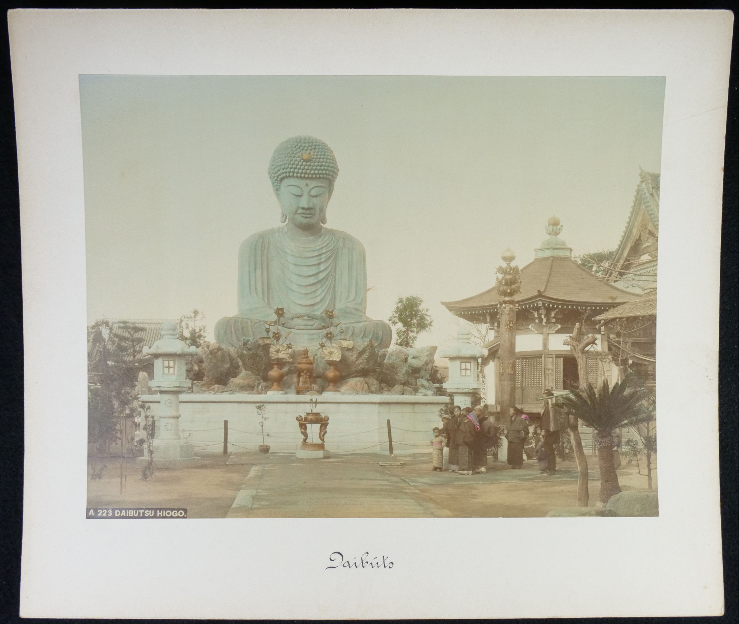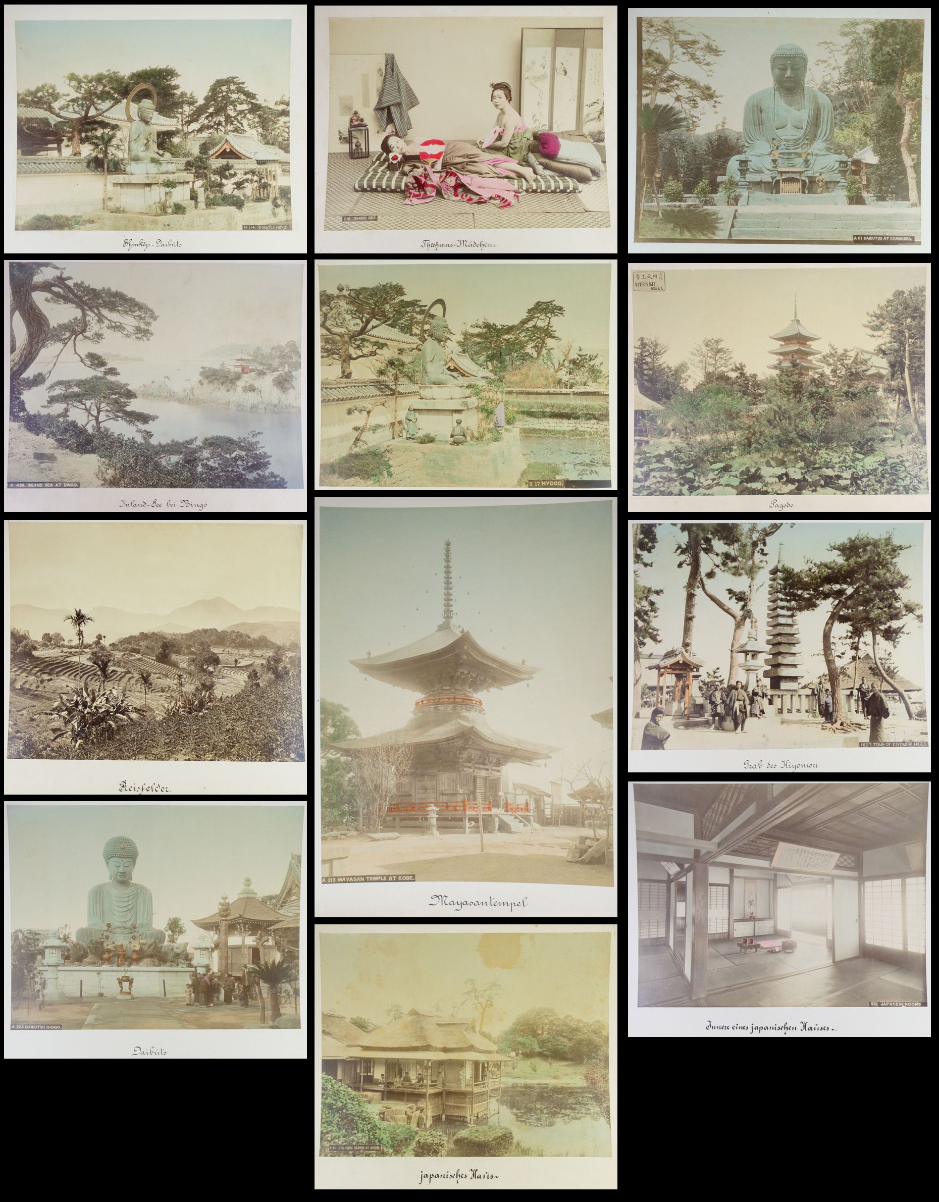 soubor 12 černobílých kolorovaných cestopisných fotografií z Japonska, pravděpodobně 1. dekáda 20. století, celková velikost 33 x 28 cm, velikost fotografií 26,5 x 20,5 cm, poslední foto s Buddhou - celková velikost 43 x 31 cm, velikost fotografie 28 x 22 cm