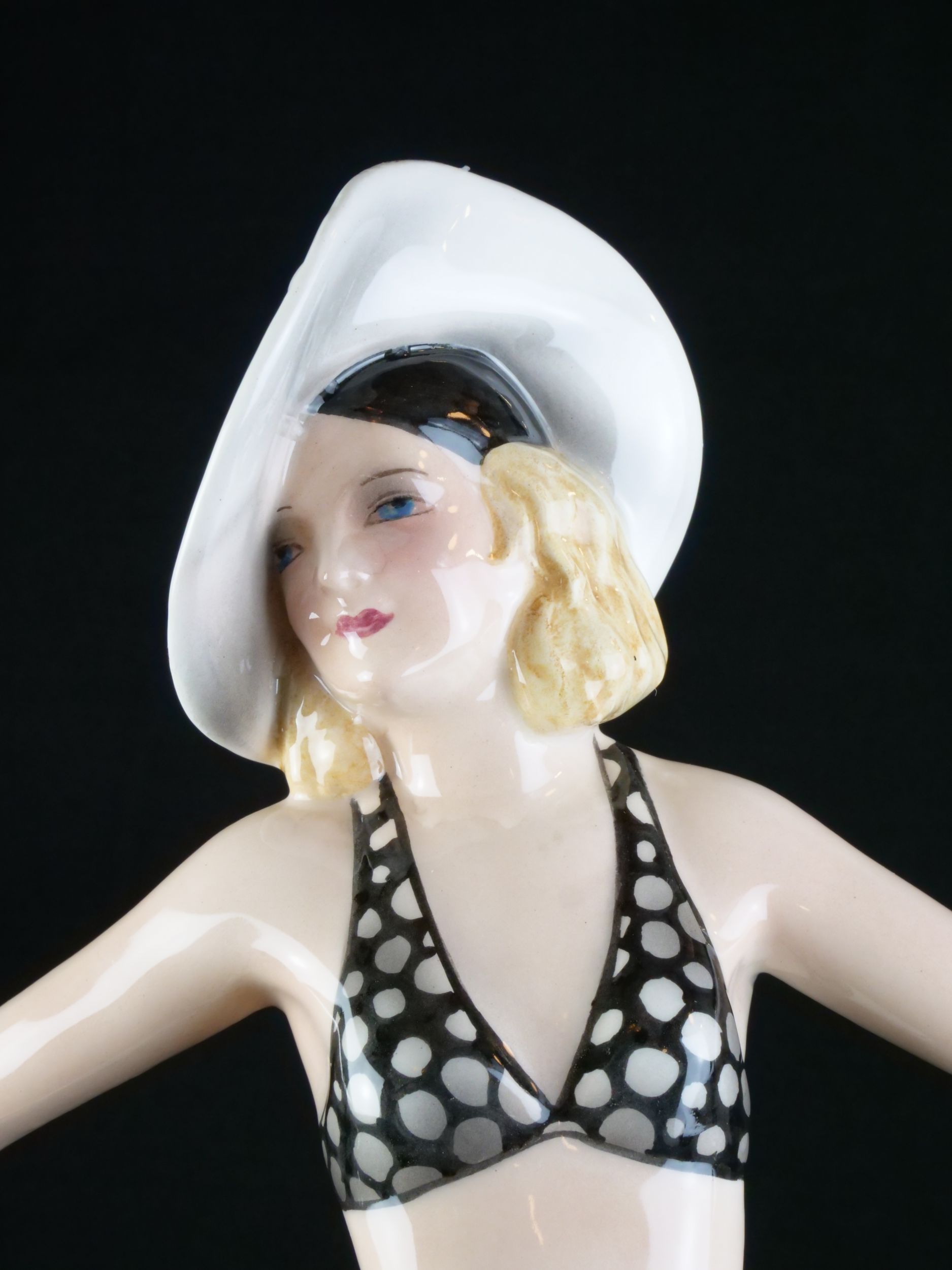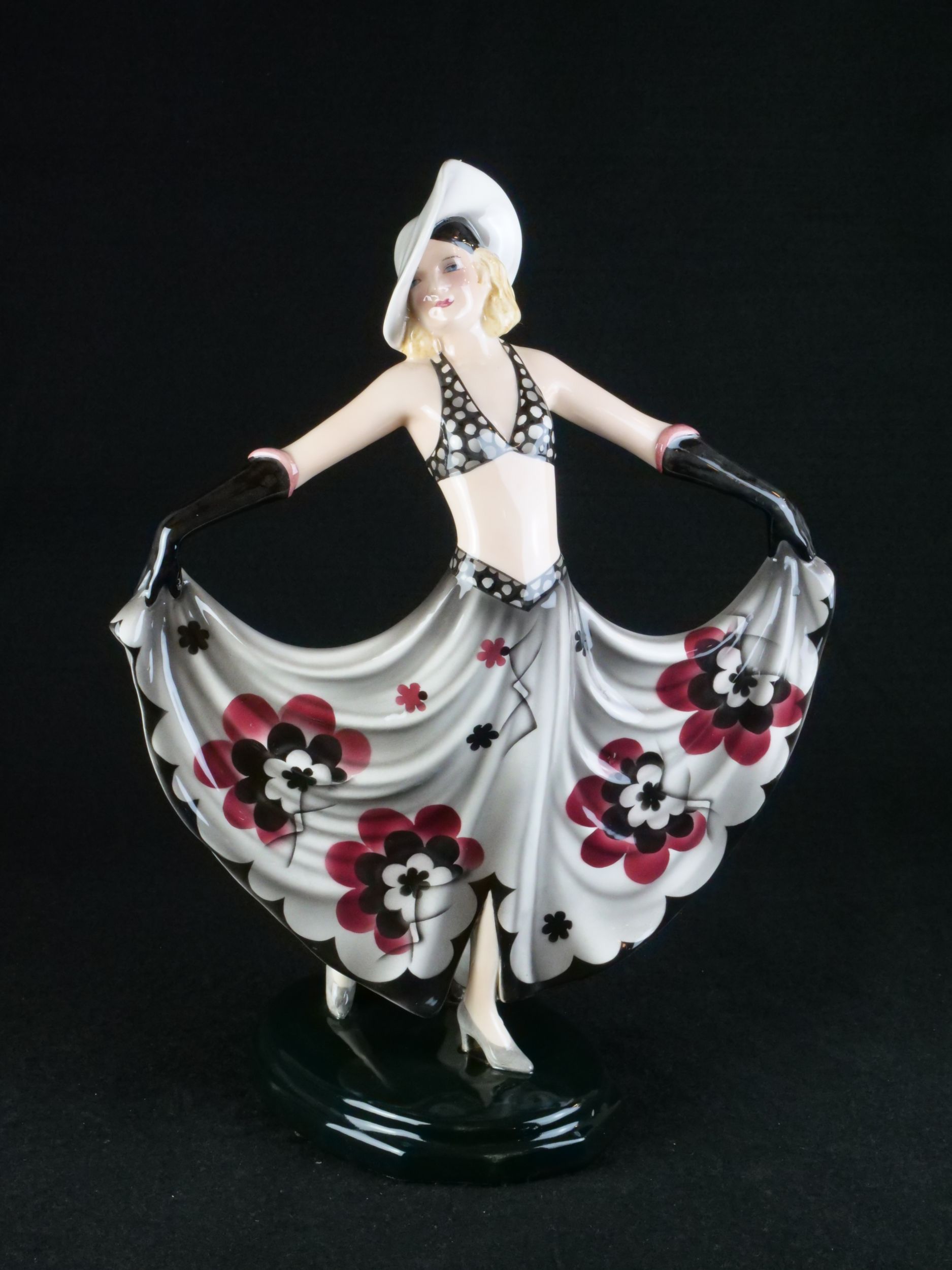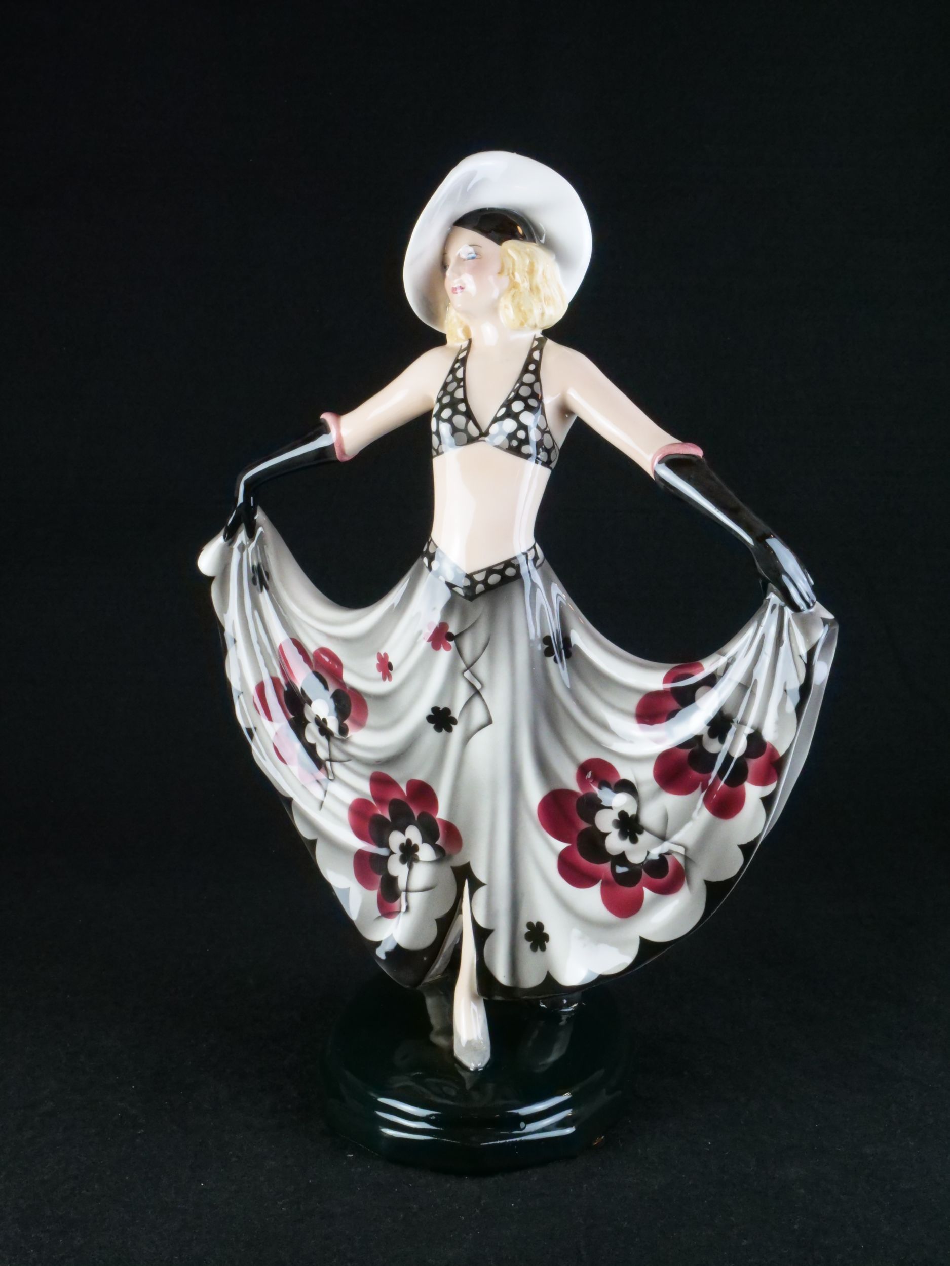 kameninová figura dívky, vyrobila vídeňská manufaktura Goldscheider, model 6757, modelér Stephan Dakon, Rakousko, 30. léta 20. století, značeno, signováno, publikováno ve firemním katalogu; výška 34 cm, šířka 25 cm