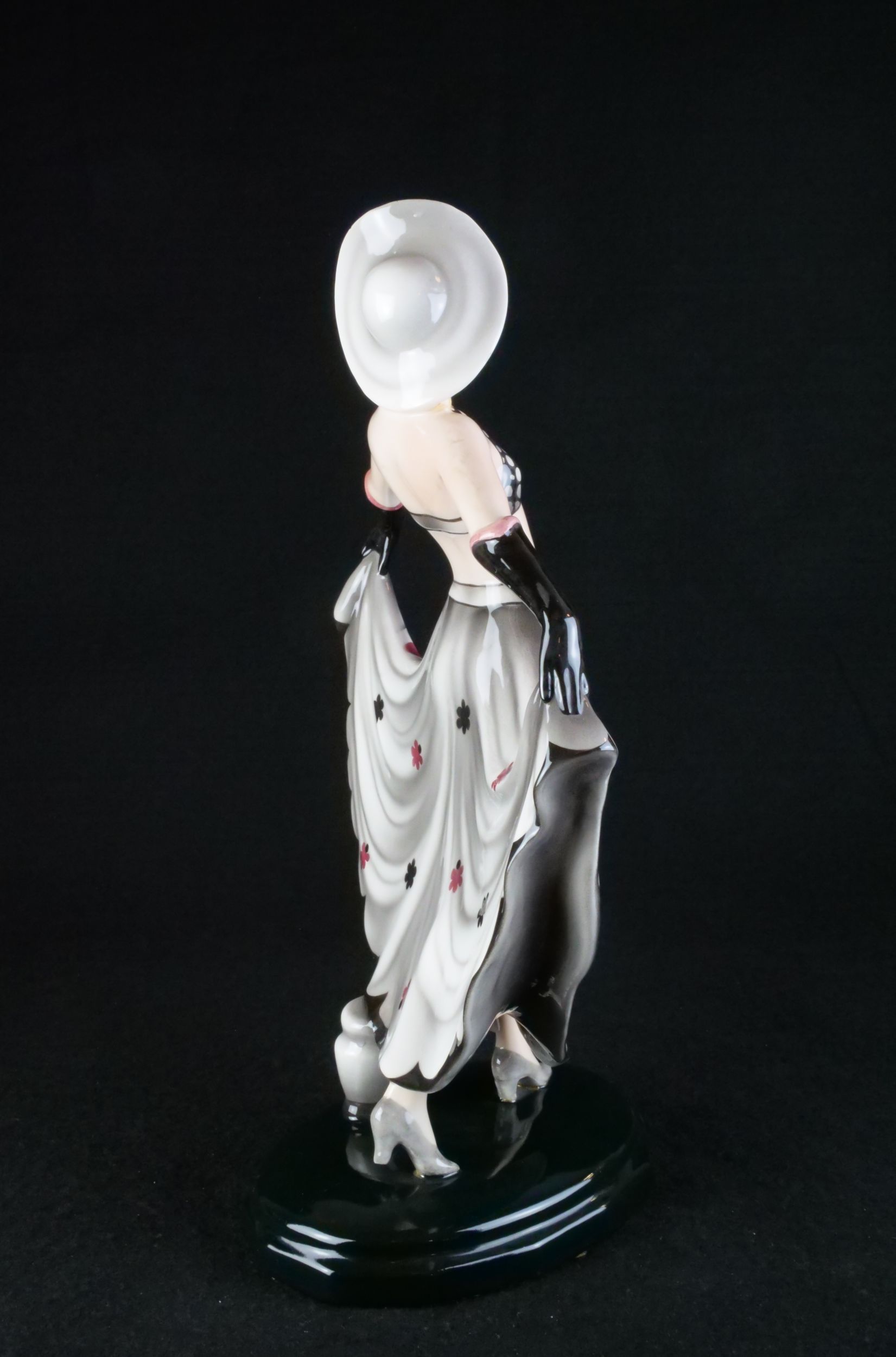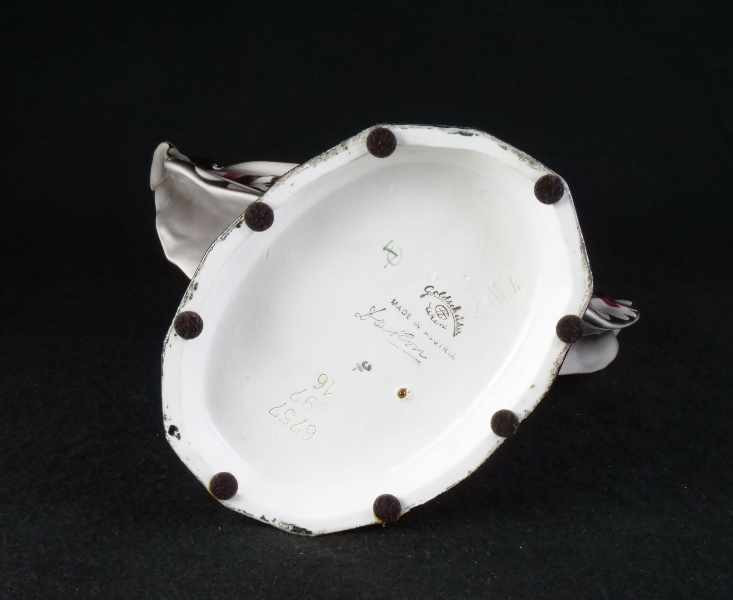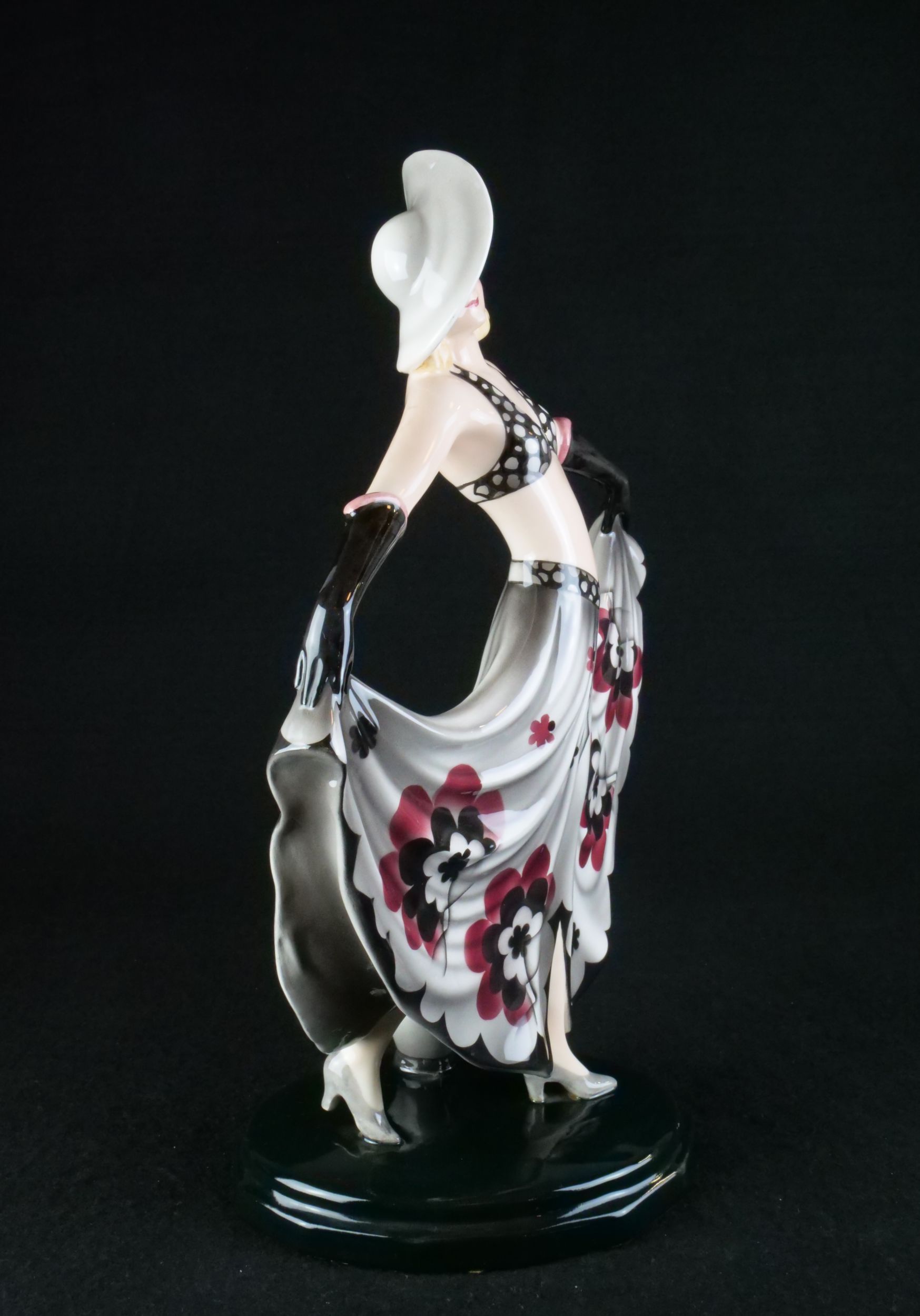 kameninová figura dívky, vyrobila vídeňská manufaktura Goldscheider, model 6757, modelér Stephan Dakon, Rakousko, 30. léta 20. století, značeno, signováno, publikováno ve firemním katalogu; výška 34 cm, šířka 25 cm