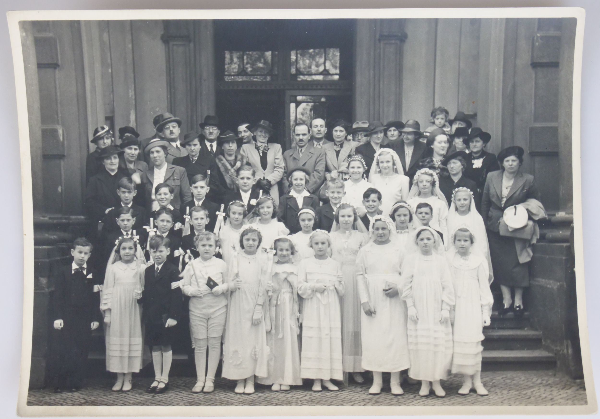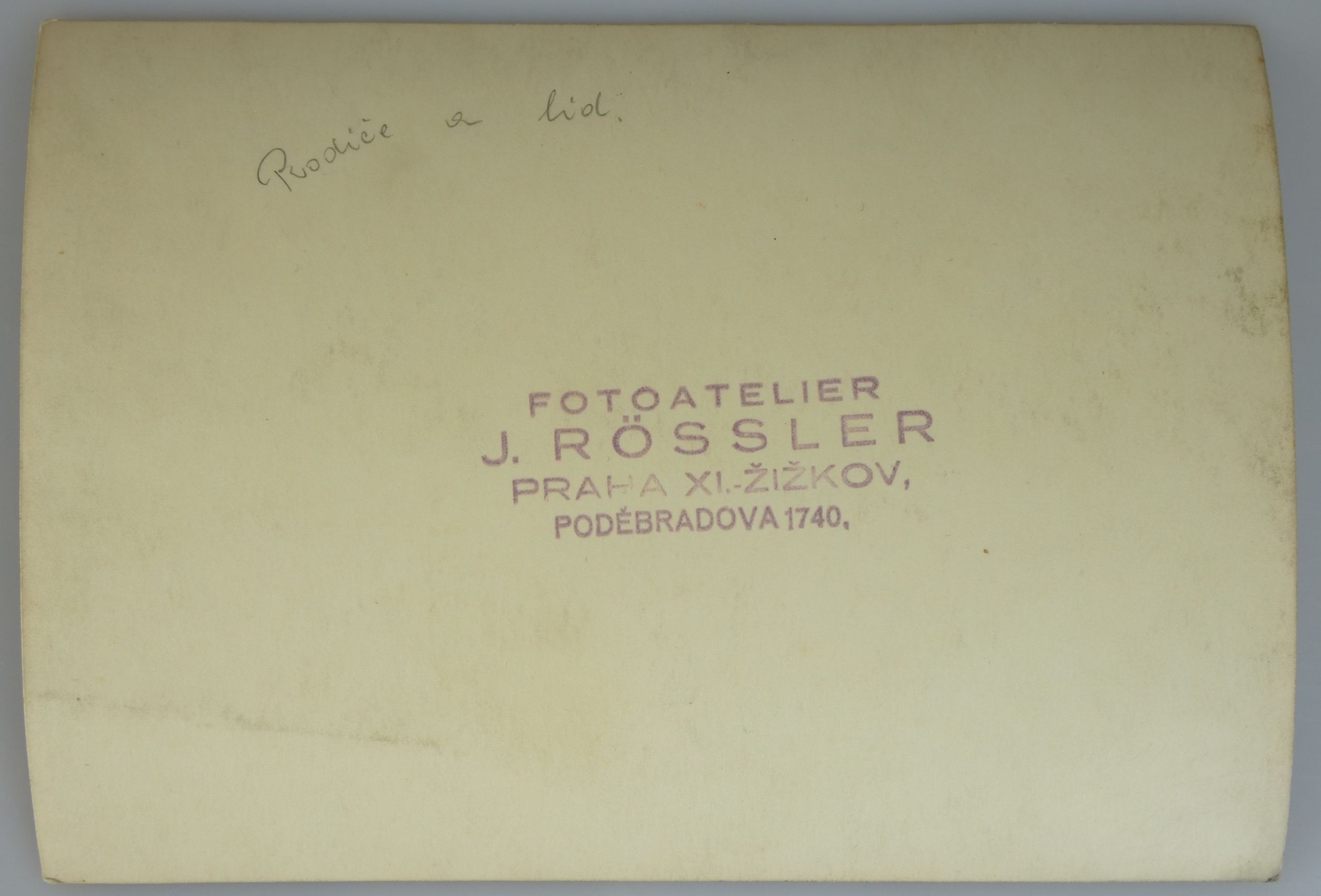 skupinová černobílá fotografie ze svatého přijímání, razítko pražského fotoateliéru významného československého fotografa Jaroslava Rösslera, 30. léta 20. století, velikost 17 x 12 cm