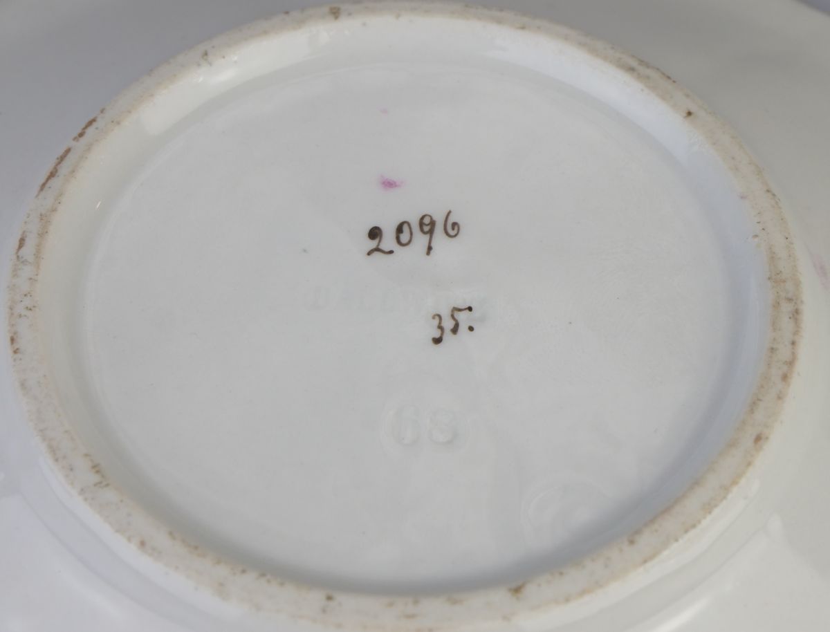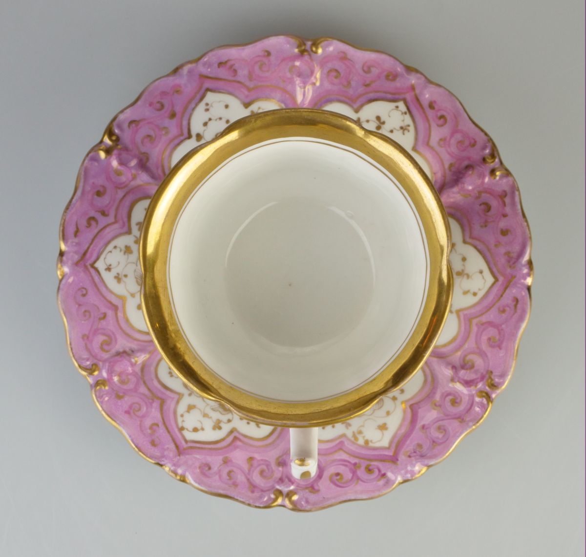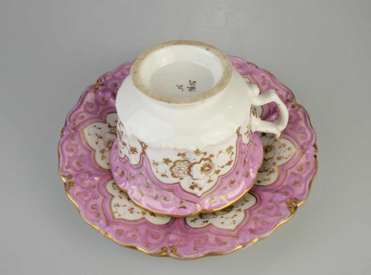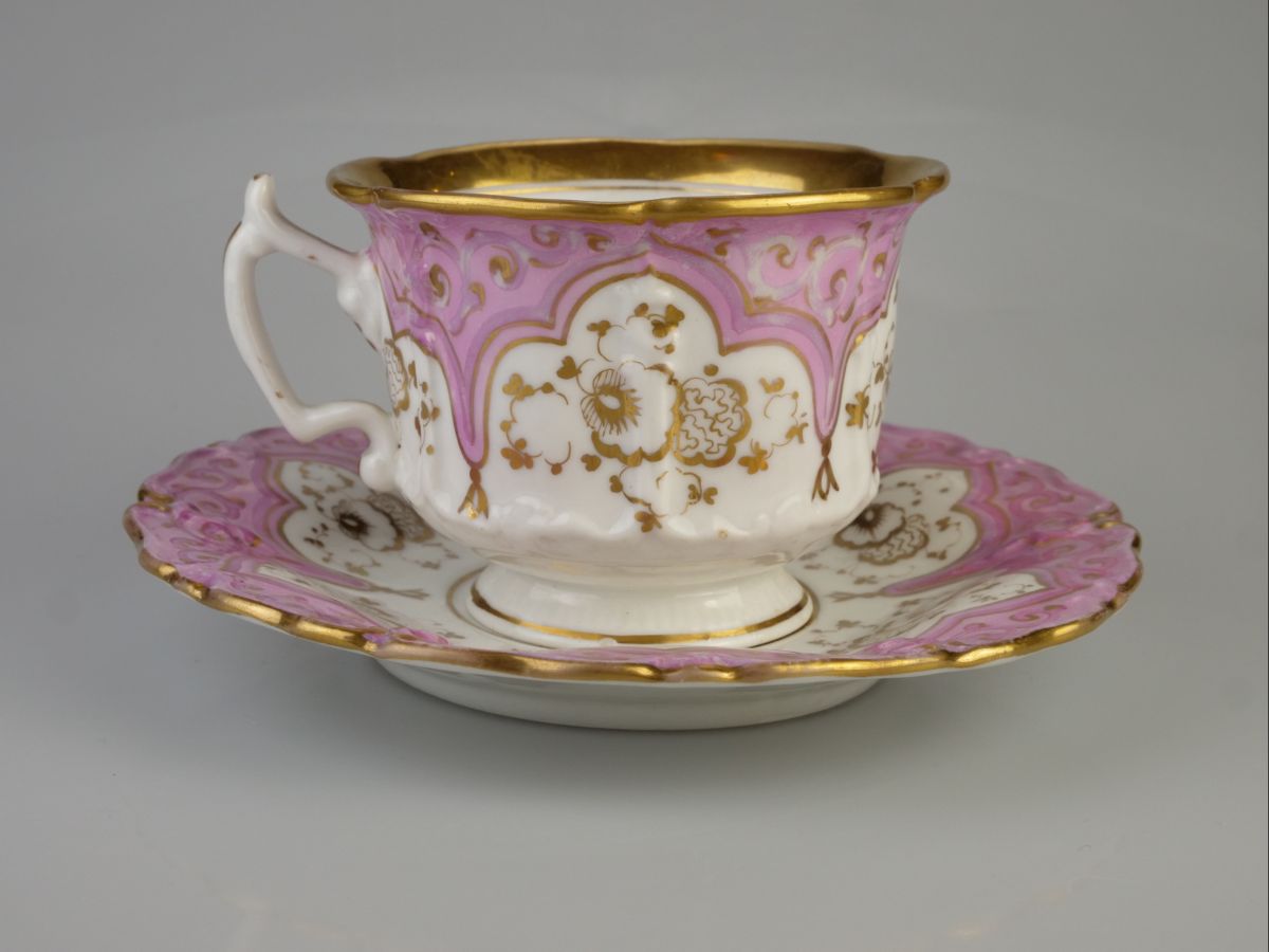 porcelánový šálek s podšálkem, malovaný růžový a zlacený květinový dekor, Dalovice, Čechy kolem roku 1850, značeno; výška šálku 6,5 cm, průměr podšálku 16 cm