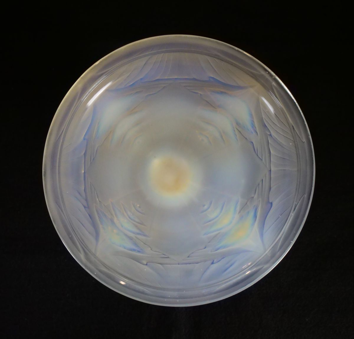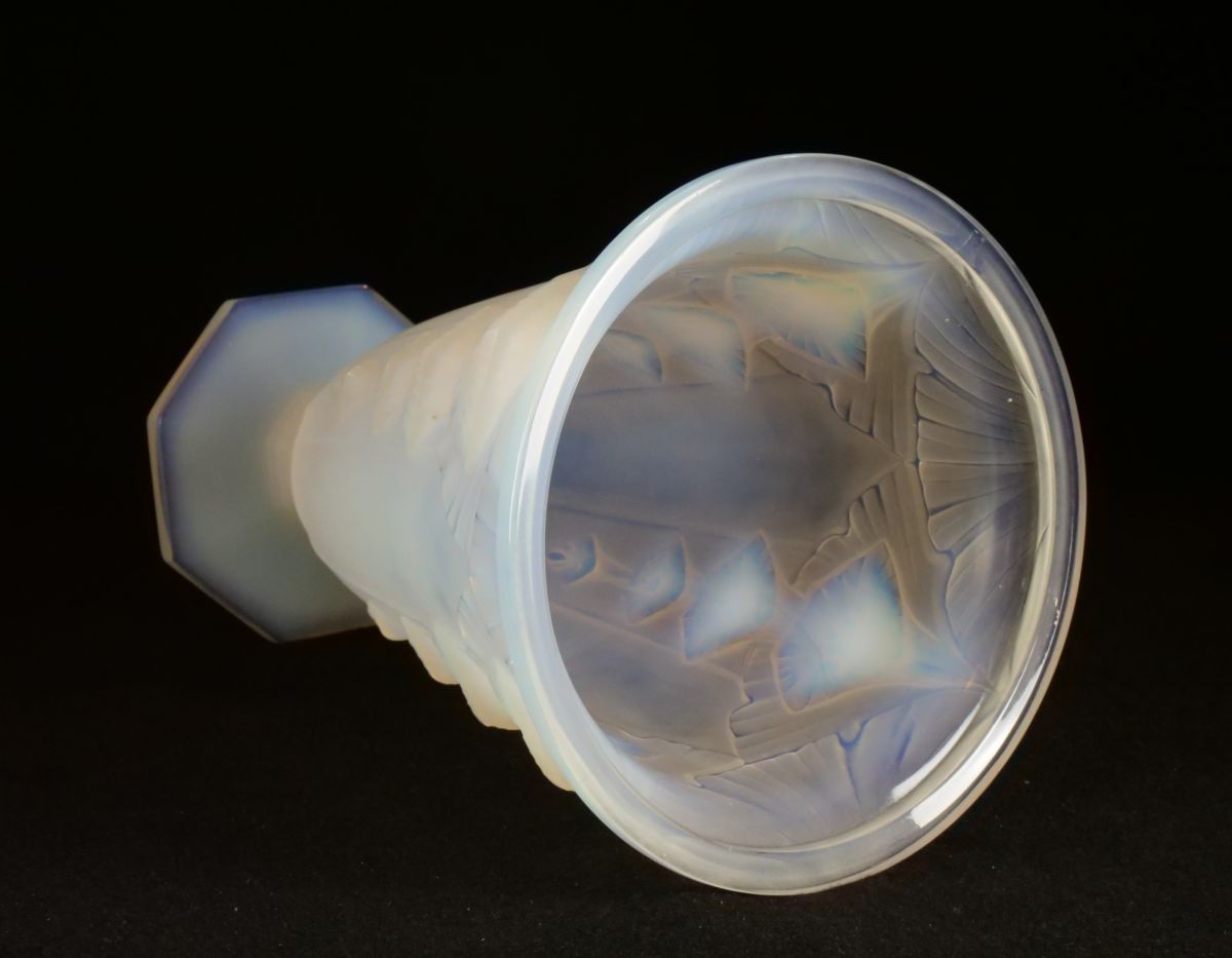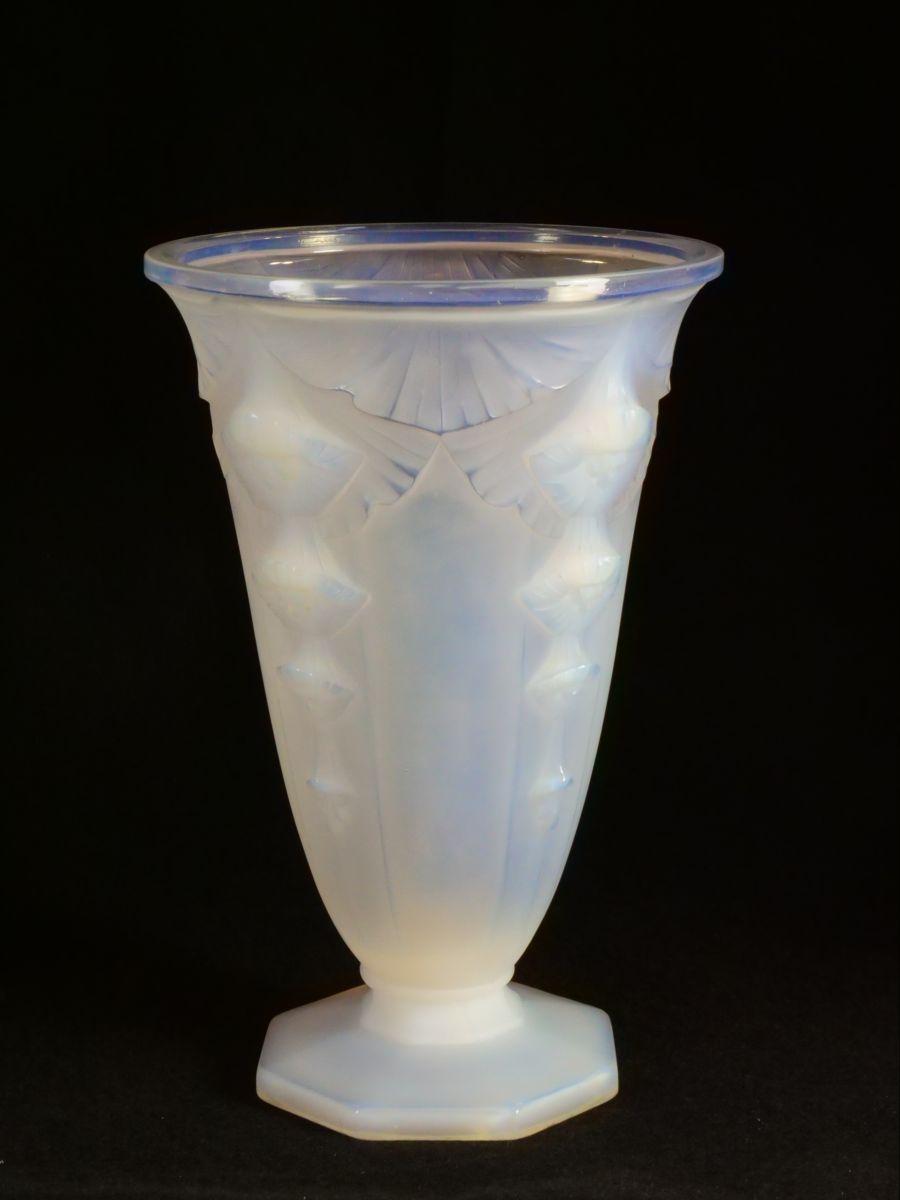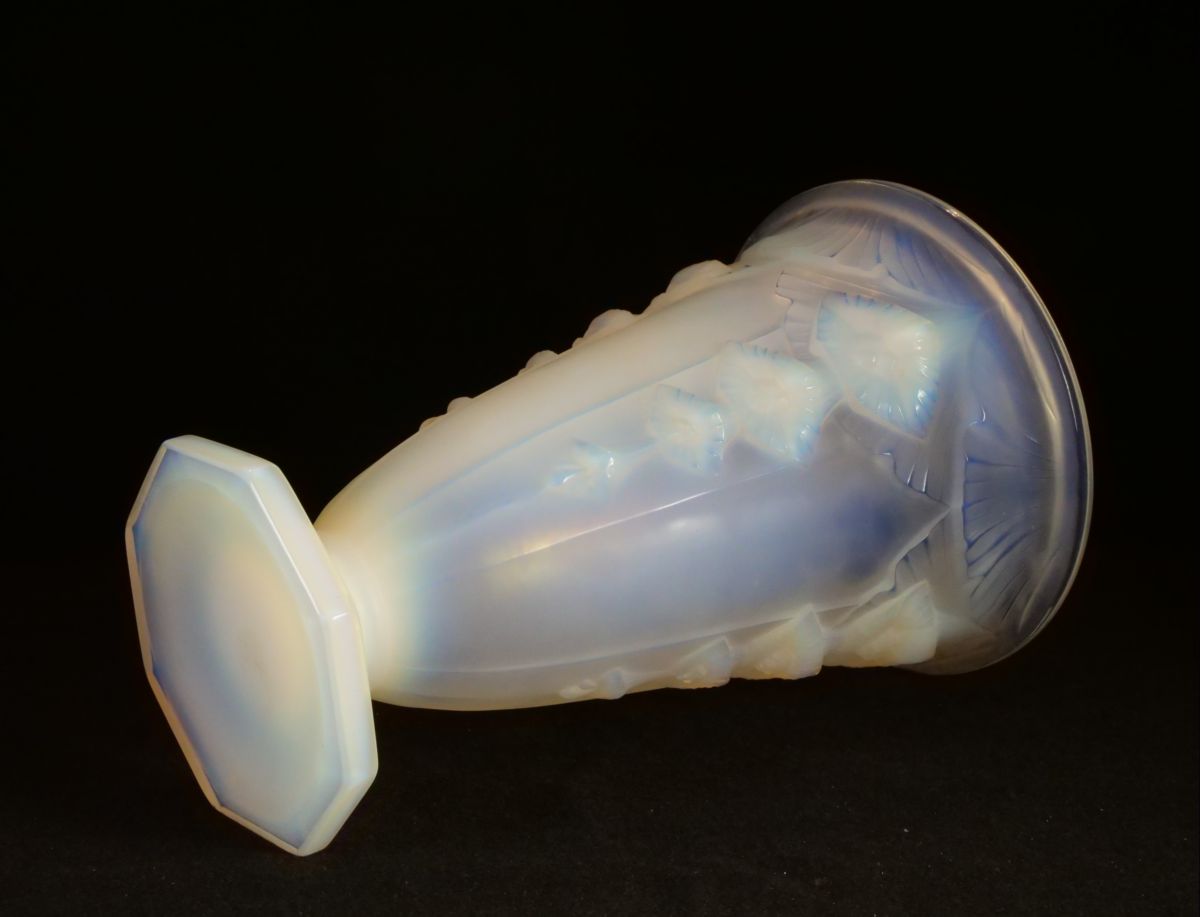 art deco váza z opálového litého skla s kaskádovým motivem stylizovaných květů, Francie kolem roku 1930, značeno France; výška 24 cm, průměr 15 cm