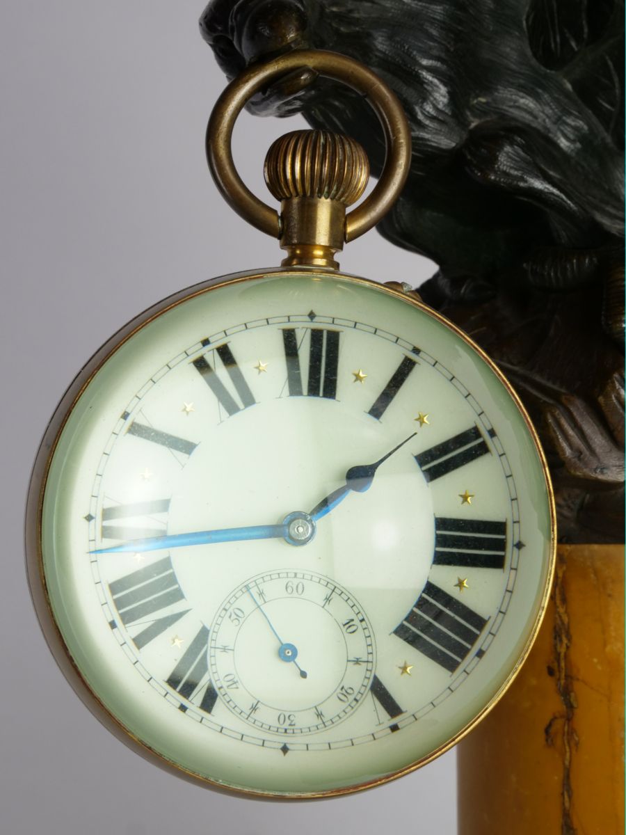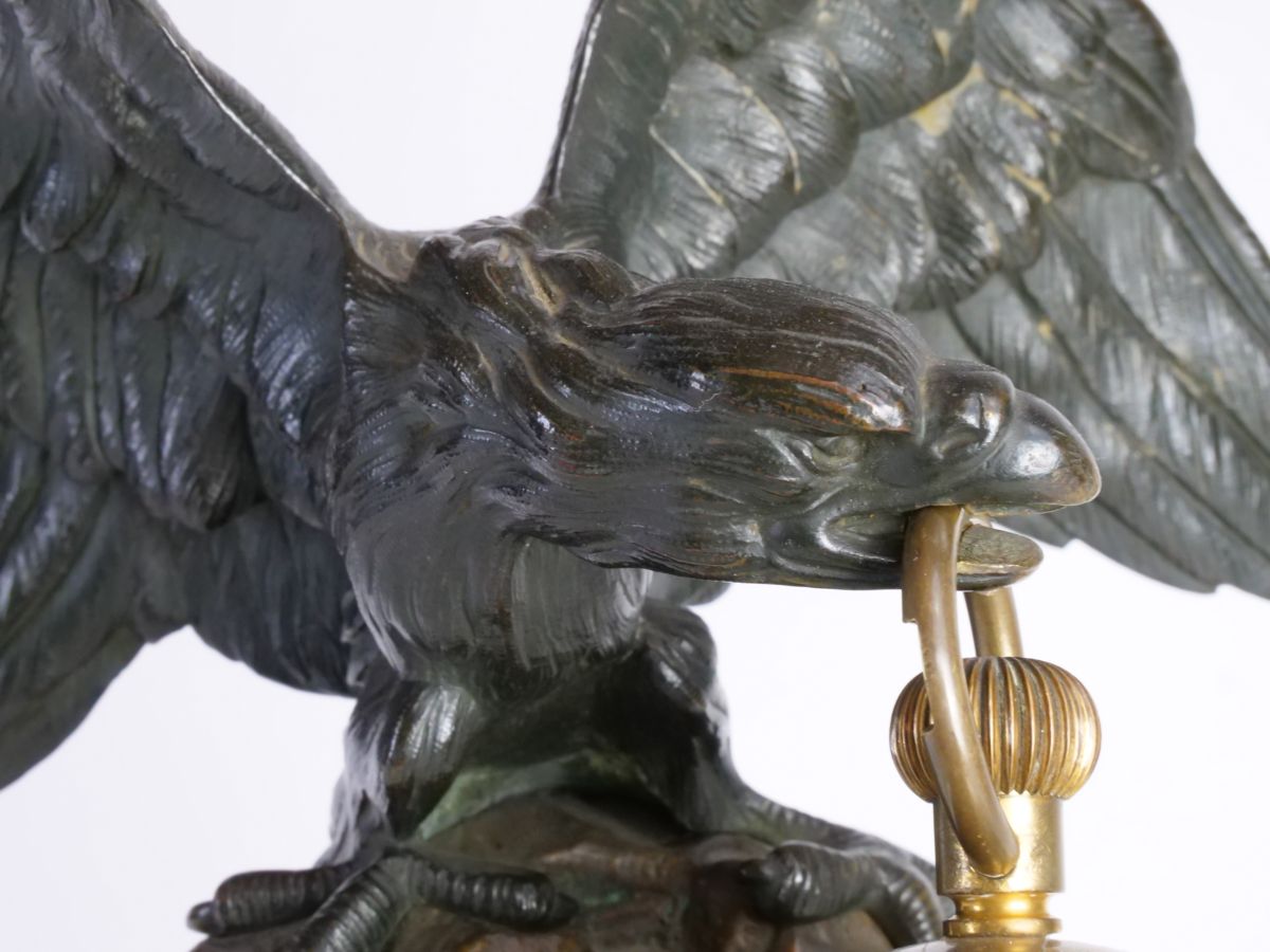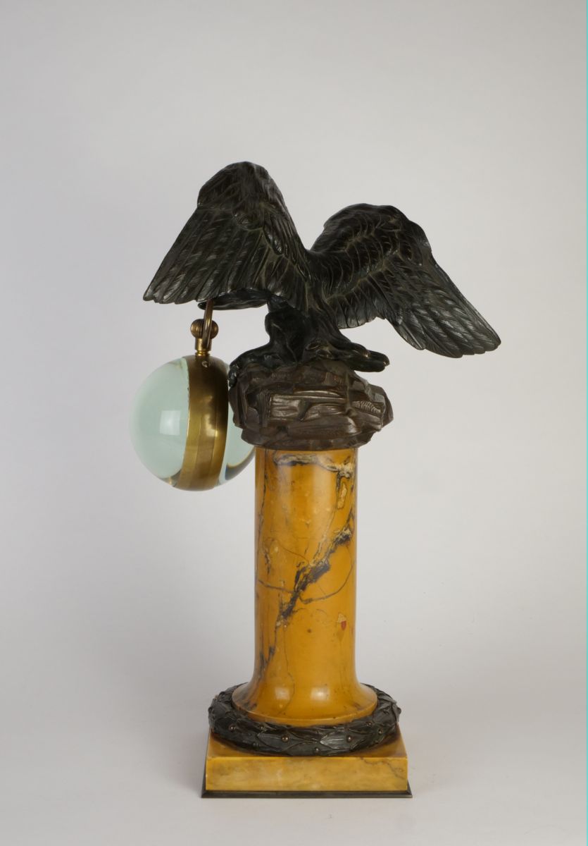 bronzová figura orla na mramorovém podstavci, v zobáku nese kulovité oboustranně prosklené hodiny, Francie, kolem roku 1890, výška 37 cm, průměr hodin 9 cm