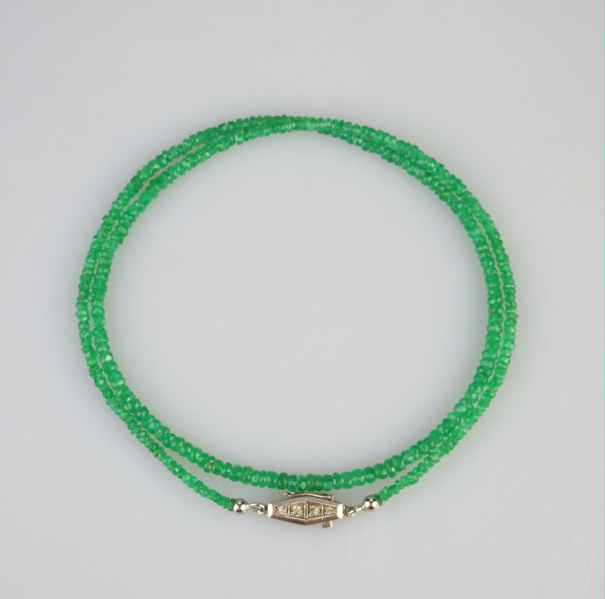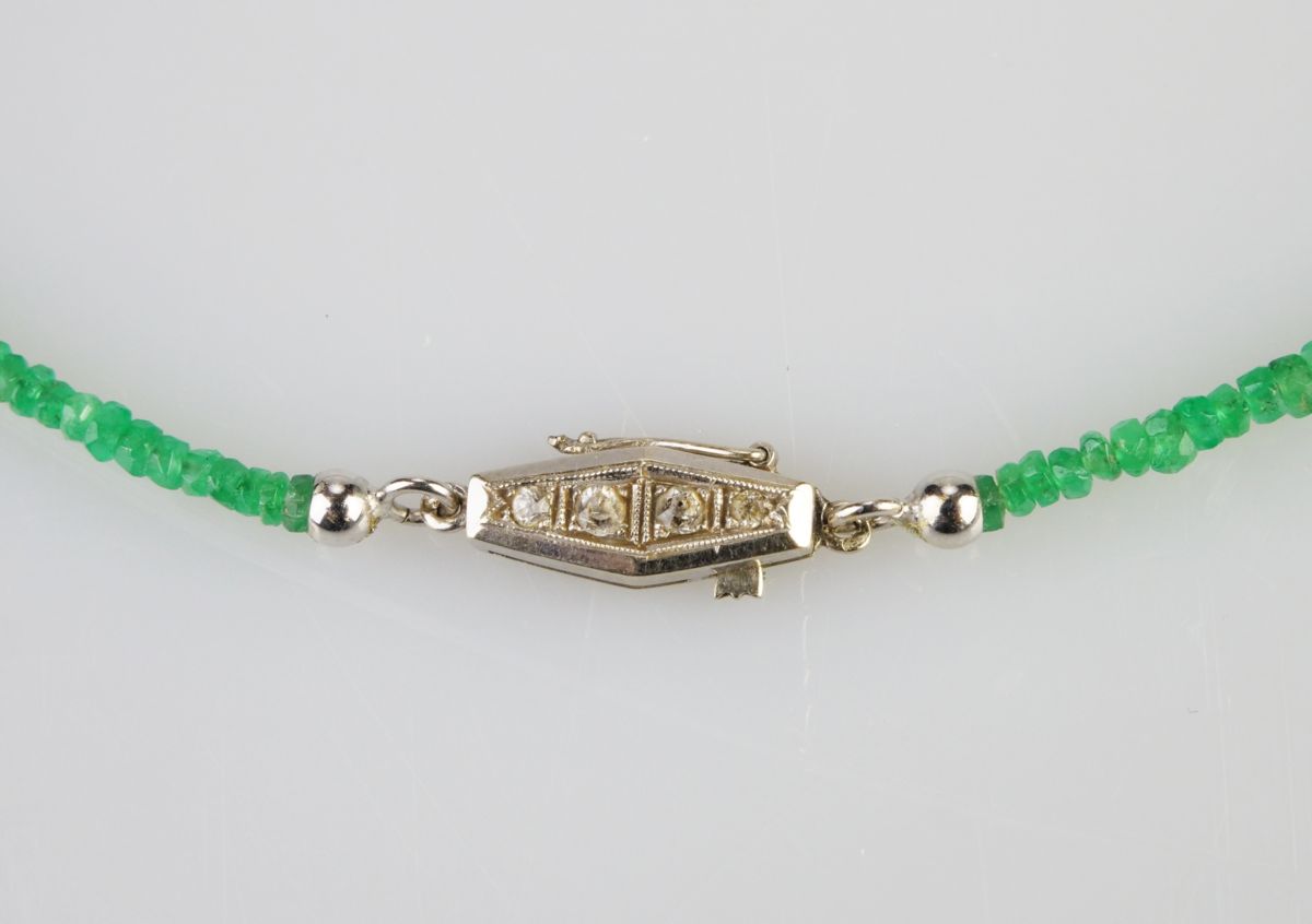 náhrdelník z broušených kolumbijských smaragdových korálků, ozdobný zlatý uzávěr s leukosafíry, Au btto 6,22g/585/000, délka 47,5 cm, puncováno, Československo kolem roku 1930