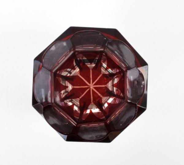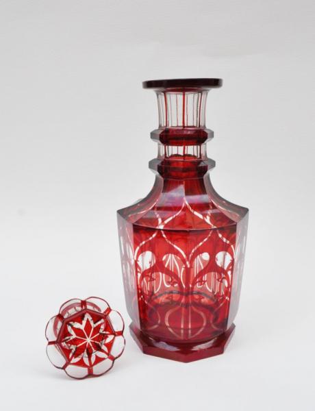 karafa se zátkou, fazetově broušené sklo s červenou lazurou, stylizovaný neogotický dekor, Čechy, kolem roku 1880, bez poškození; výška se zátkou 25 cm