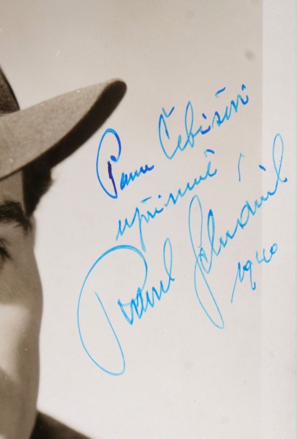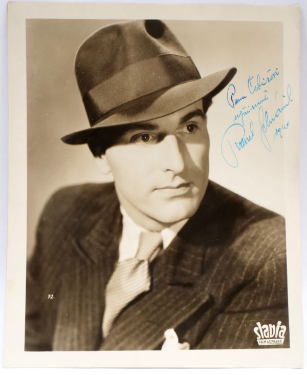 dobová fotografie herce Raoula Schránila s věnováním, reklamní ateliérová fotografie filmové a produkční společnosti Slavia-film, Protektorát Čechy a Morava, rok 1940, rozměry 30 x 24 cm; sběratelsky zajímavé